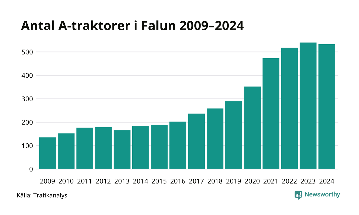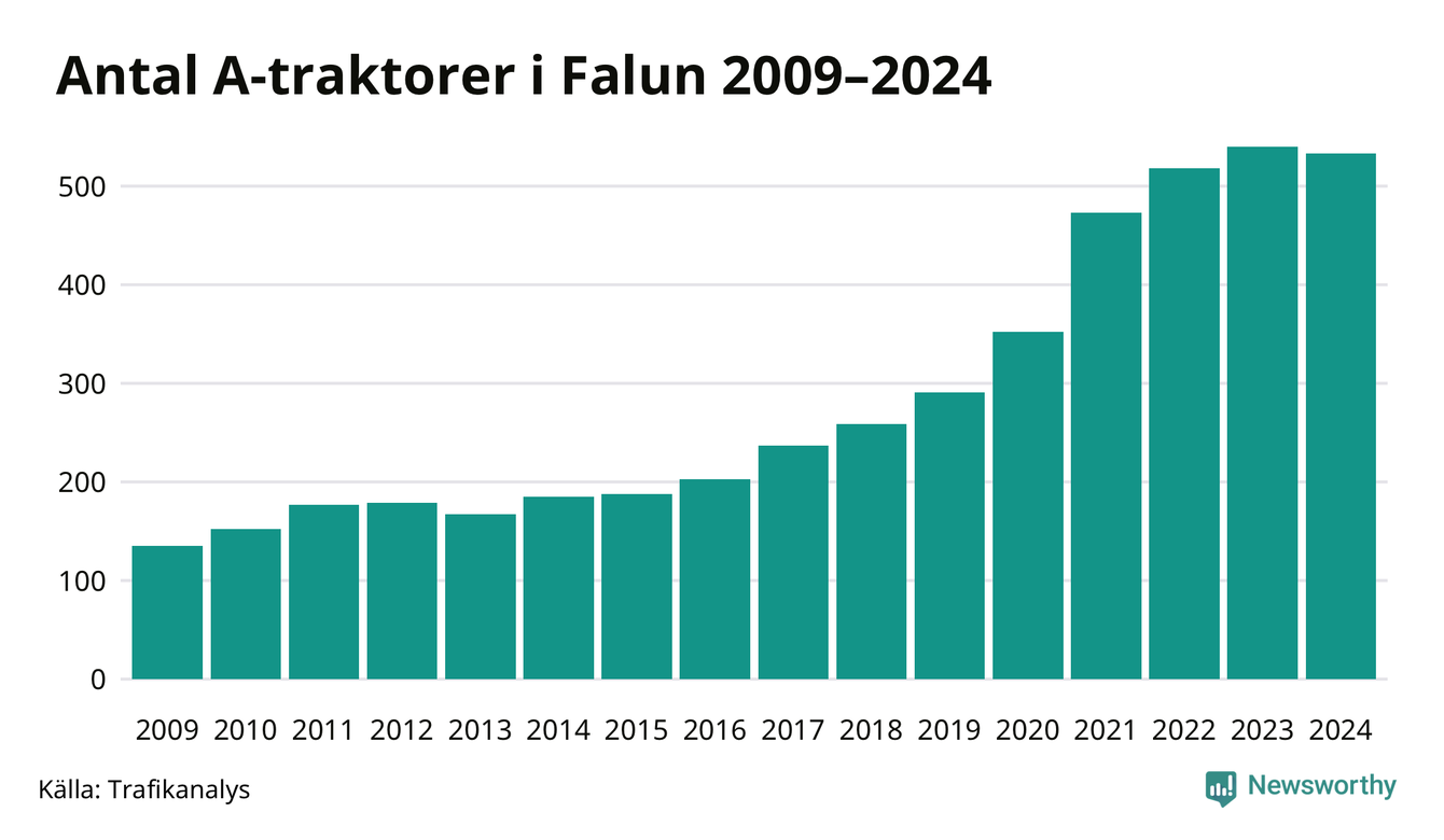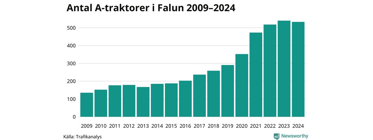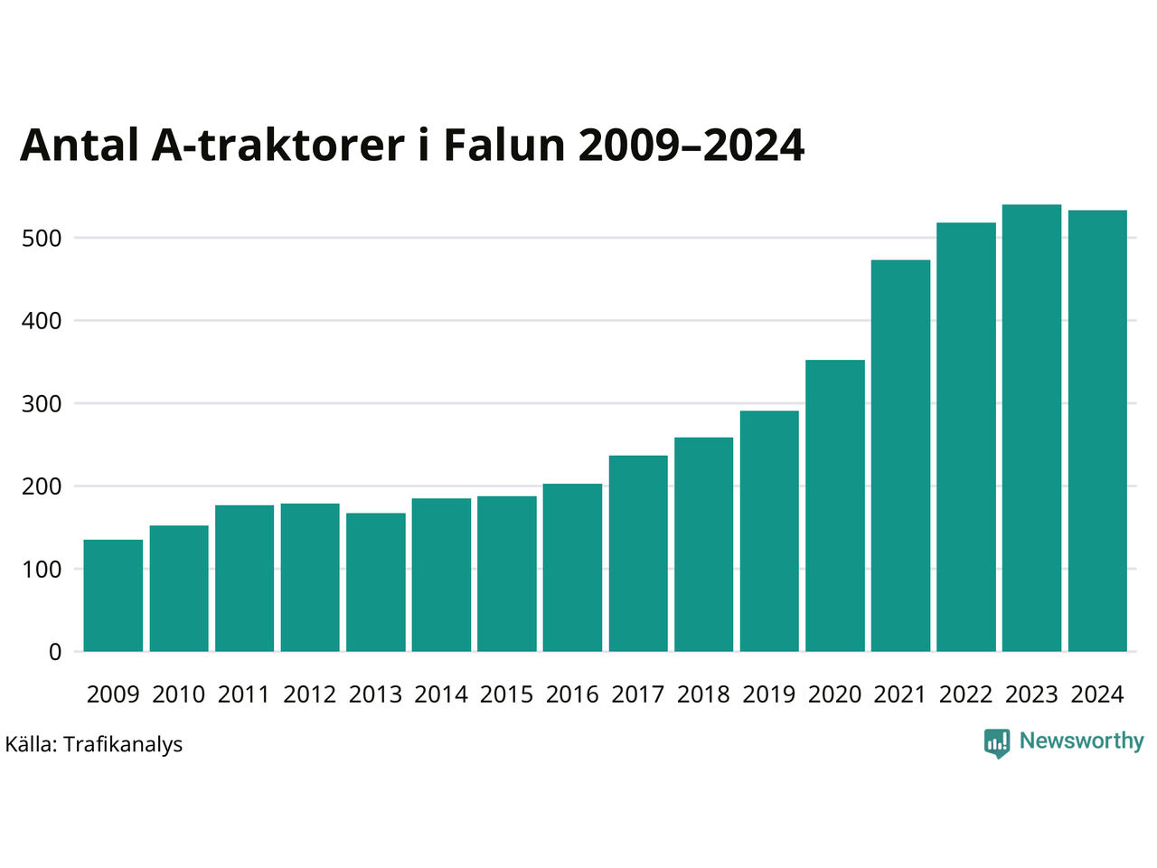 Under det senaste decenniet har antalet A-traktorer nästan femdubblats i Sverige, och under 2024 fortsatte utvecklingen. Men i Falu kommun blev A-traktorerna färre. Det är första gången sedan 2013 som antalet inte ökar.