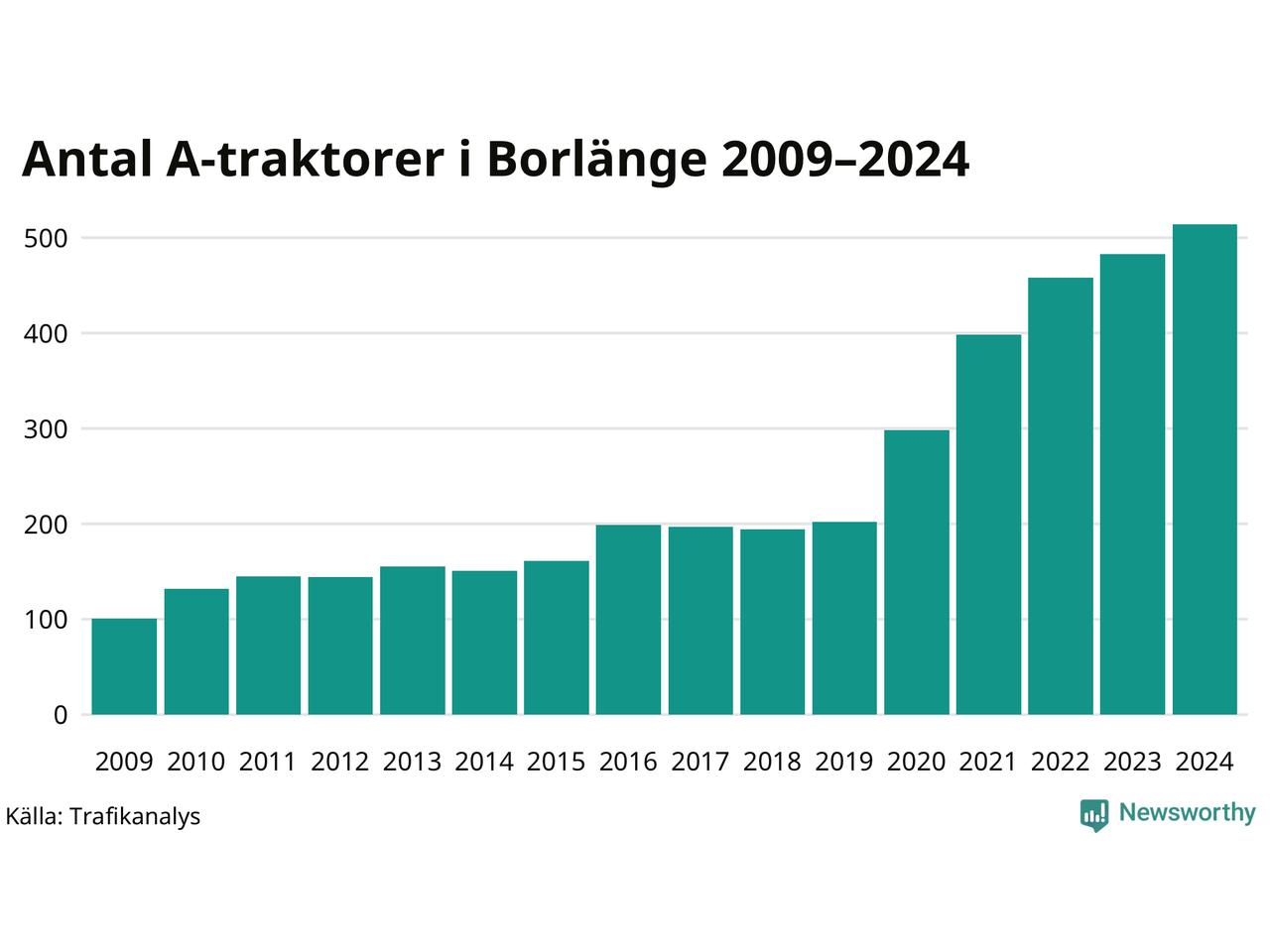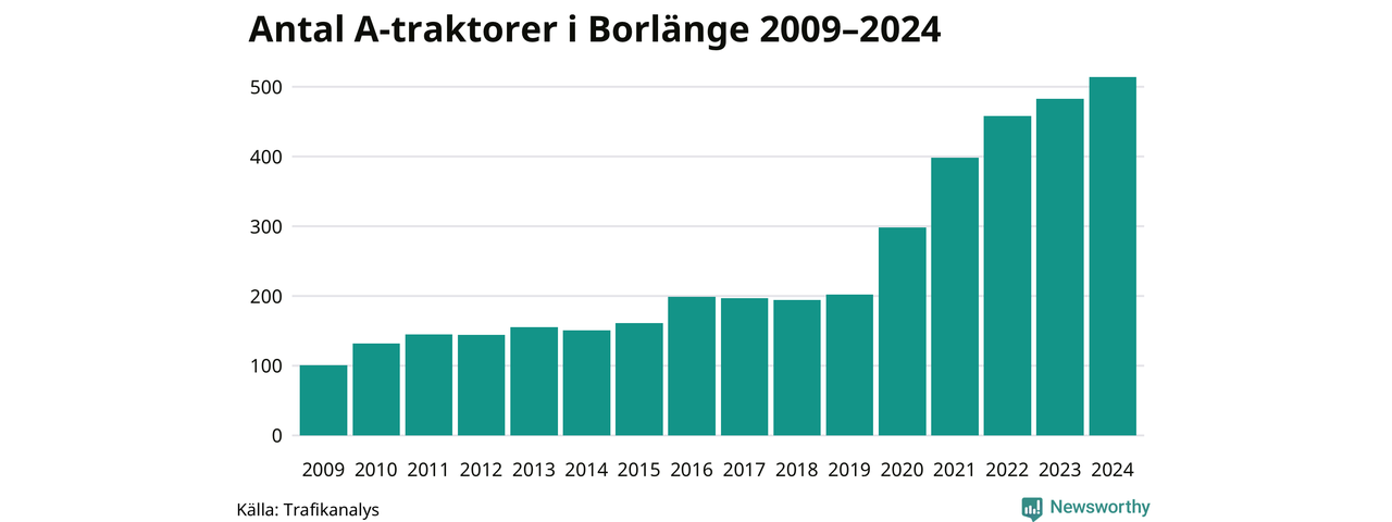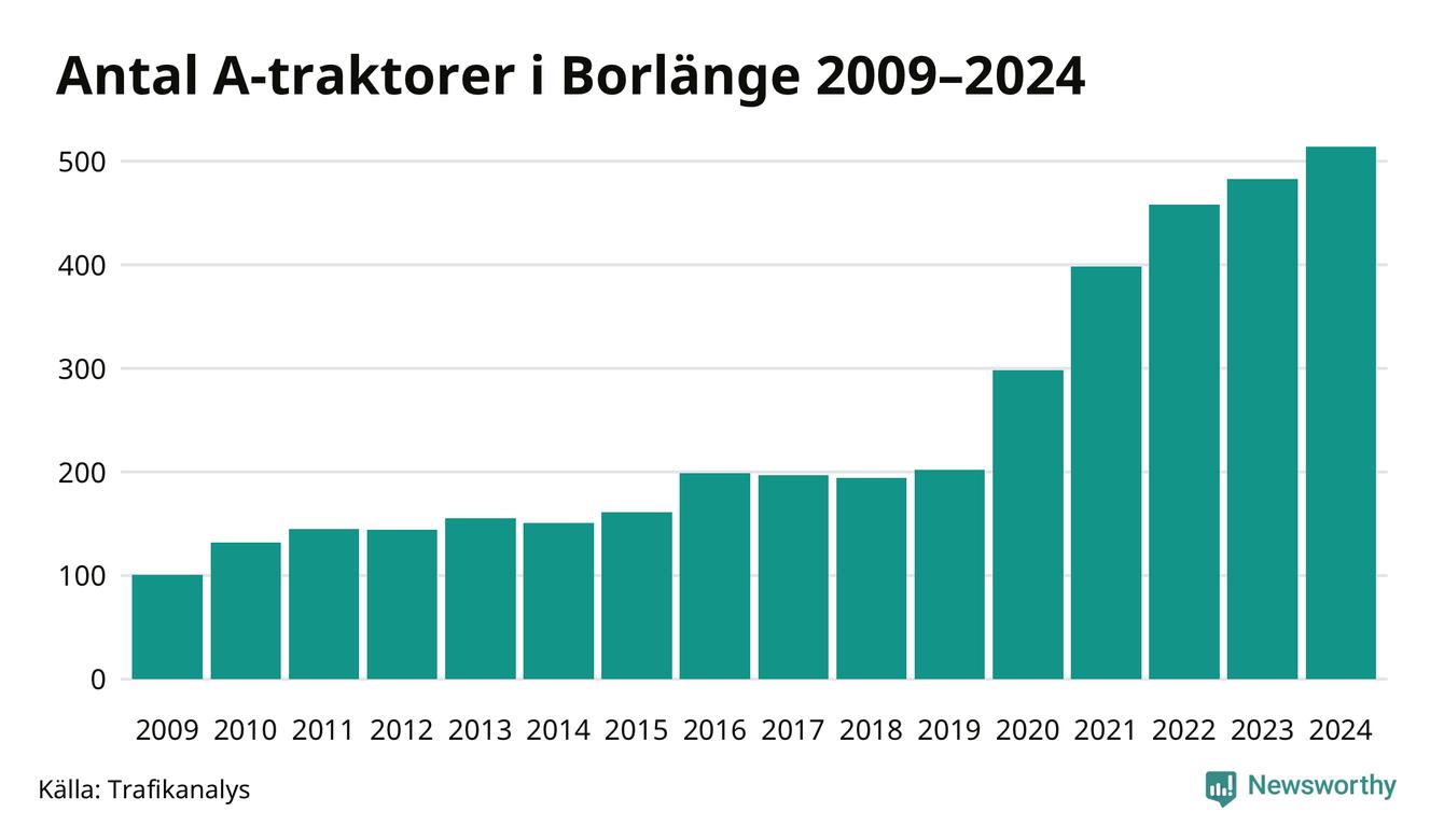 För sjätte året i rad ökar antalet A-traktorer i Borlänge kommun, visar nya siffror från Trafikanalys. I slutet av 2024 fanns 514 A-traktorer registrerade i kommunen. Inte sedan åtminstone 2009, som är det första året vi har statistik för, har det funnits så många A-traktorer i kommunen.