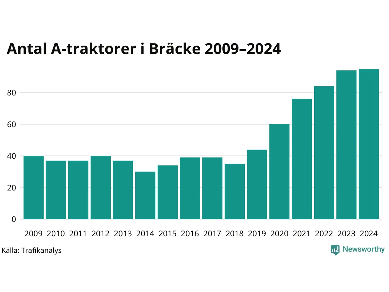 I slutet av 2024 fanns 95 A-traktorer registrerade i kommunen, vilket är en mer än året innan. Inte sedan åtminstone 2009, som är det första året vi har statistik för, har det funnits så många A-traktorer i kommunen.