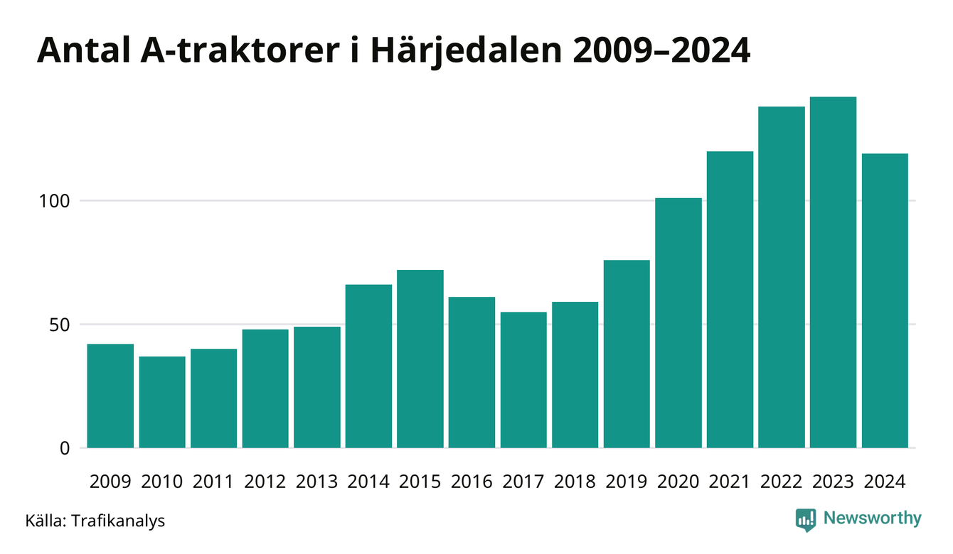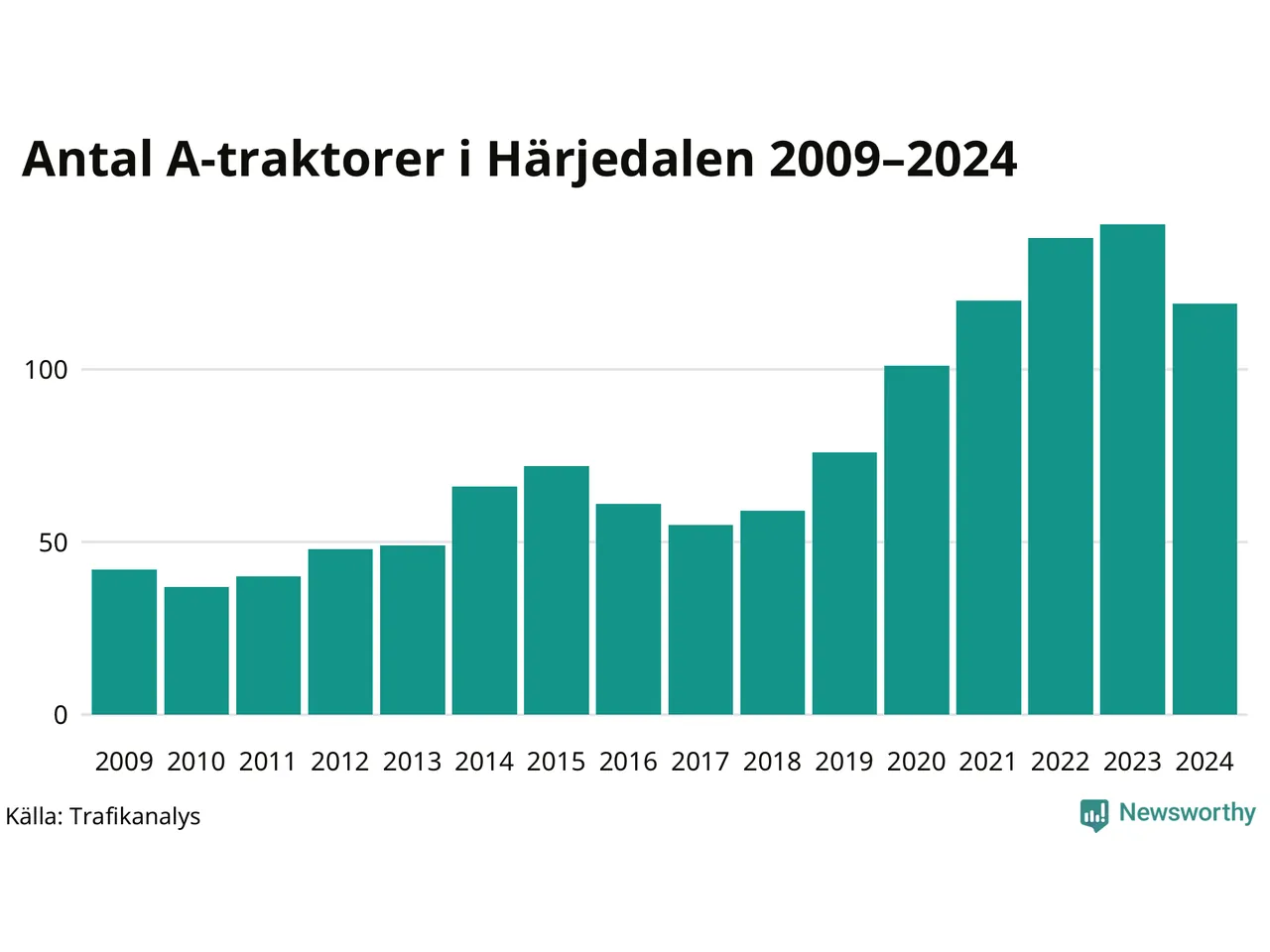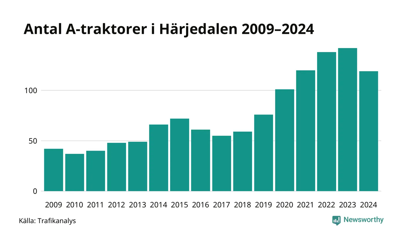 Under det senaste decenniet har antalet A-traktorer nästan femdubblats i Sverige, och under 2024 fortsatte utvecklingen. Men i Härjedalens kommun blev A-traktorerna färre. Det är första gången sedan 2017 som antalet inte ökar.