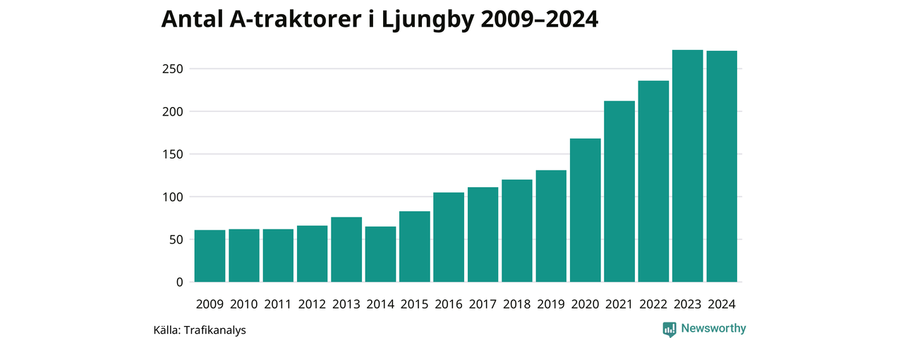 I slutet av 2024 fanns 271 A-traktorer registrerade i Ljungby kommun, vilket är en mindre än året innan. Det visar nya siffror från Trafikanalys. Det är första gången sedan 2014 som antalet A-traktorer inte ökar i kommunen.