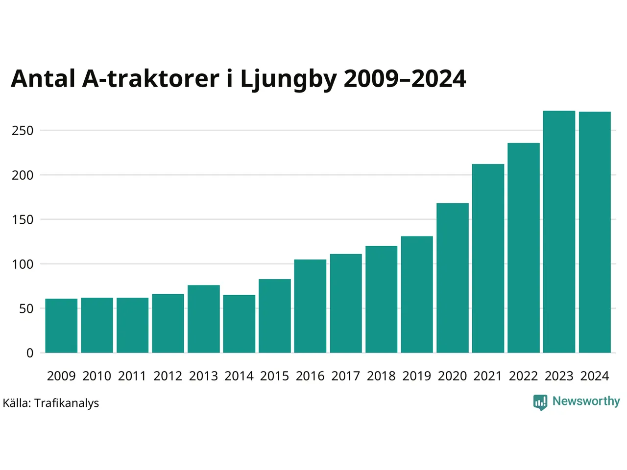 Under det senaste decenniet har antalet A-traktorer nästan femdubblats i Sverige, och under 2024 fortsatte utvecklingen. Men i Ljungby kommun blev A-traktorerna färre. Det är första gången sedan 2014 som antalet inte ökar.
