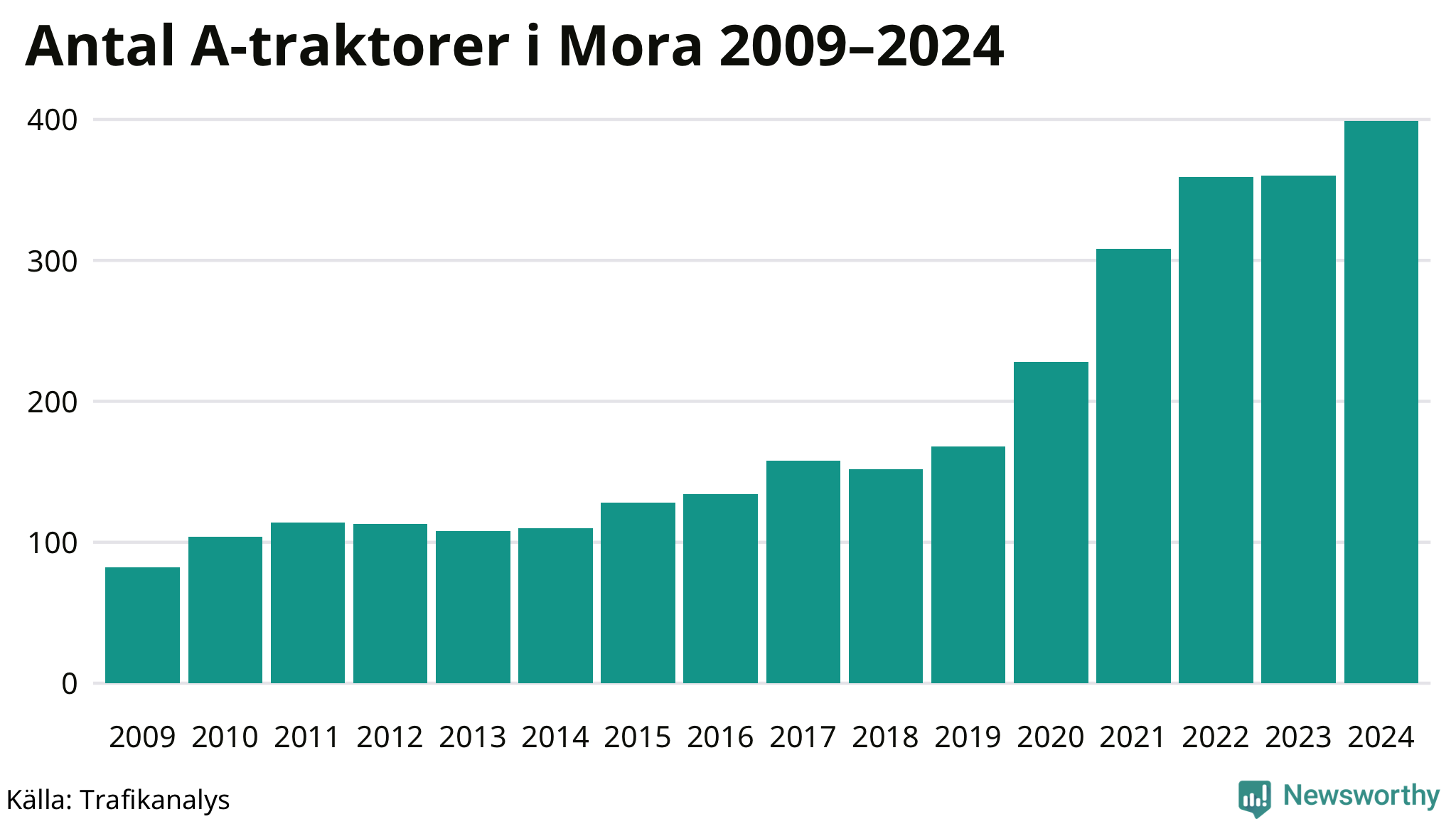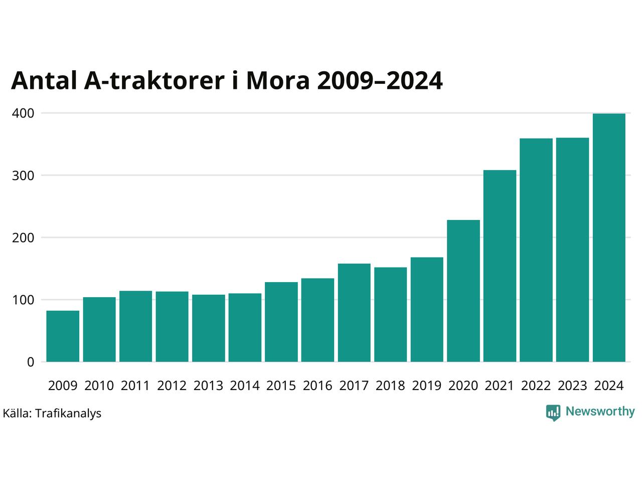 För sjätte året i rad ökar antalet A-traktorer i Mora kommun, visar nya siffror från Trafikanalys. I slutet av 2024 fanns 399 A-traktorer registrerade i kommunen. Det är den näst största ökningen i Dalarnas län. Inte sedan åtminstone 2009, som är det första året vi har statistik för, har det funnits så många A-traktorer i kommunen.