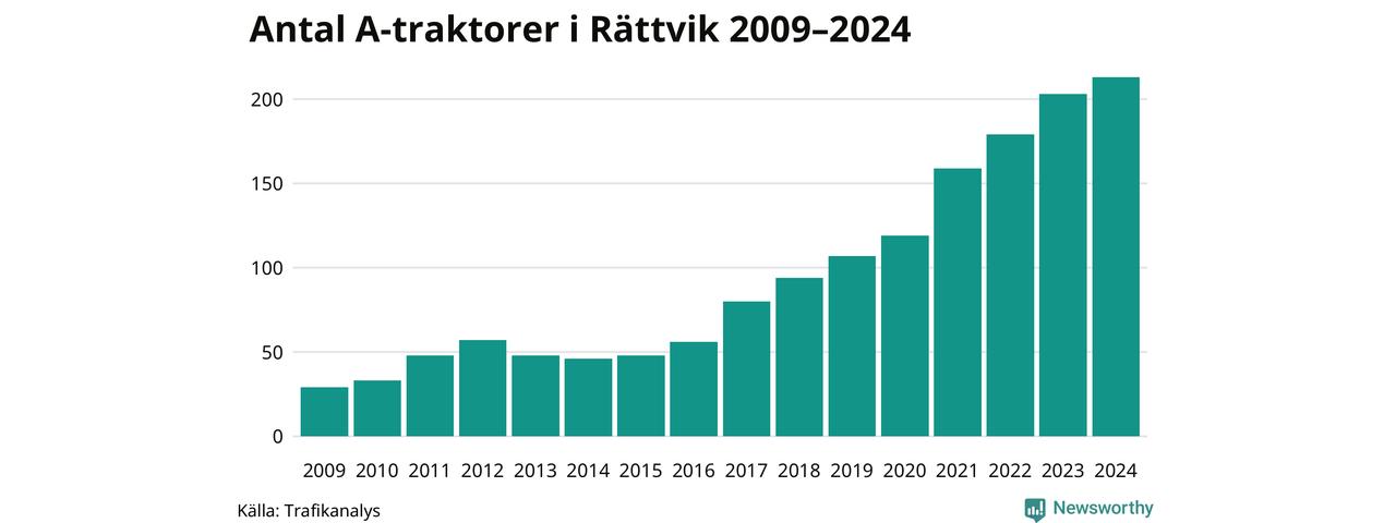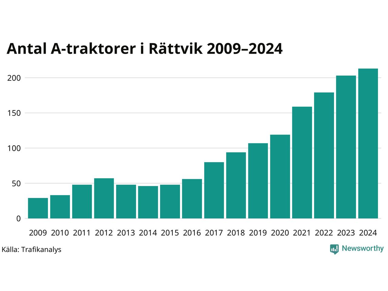 För tionde året i rad ökar antalet A-traktorer i Rättviks kommun, visar nya siffror från Trafikanalys. I slutet av 2024 fanns 213 A-traktorer registrerade i kommunen. Inte sedan åtminstone 2009, som är det första året vi har statistik för, har det funnits så många A-traktorer i kommunen.