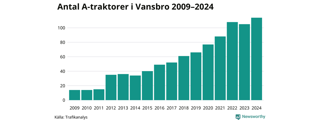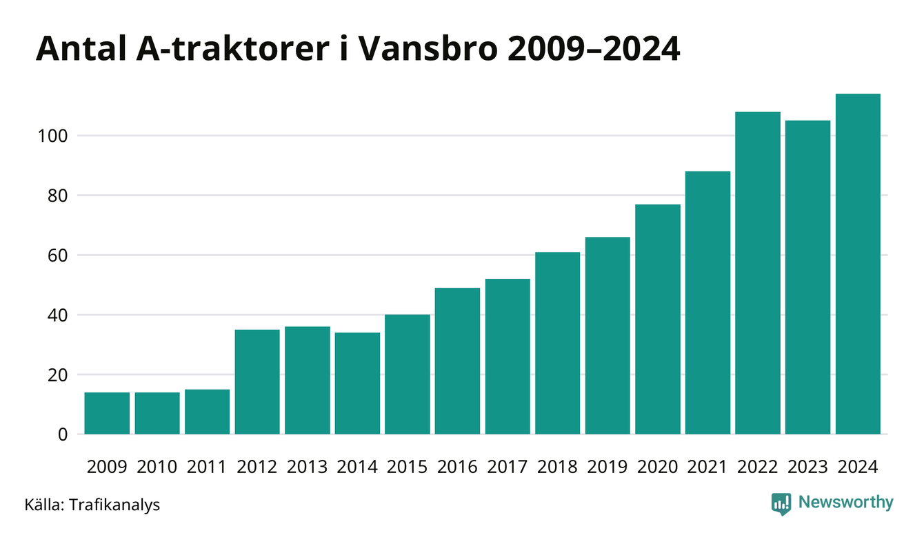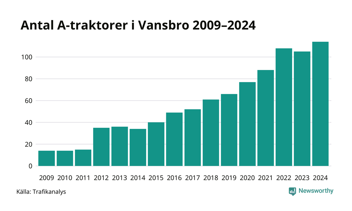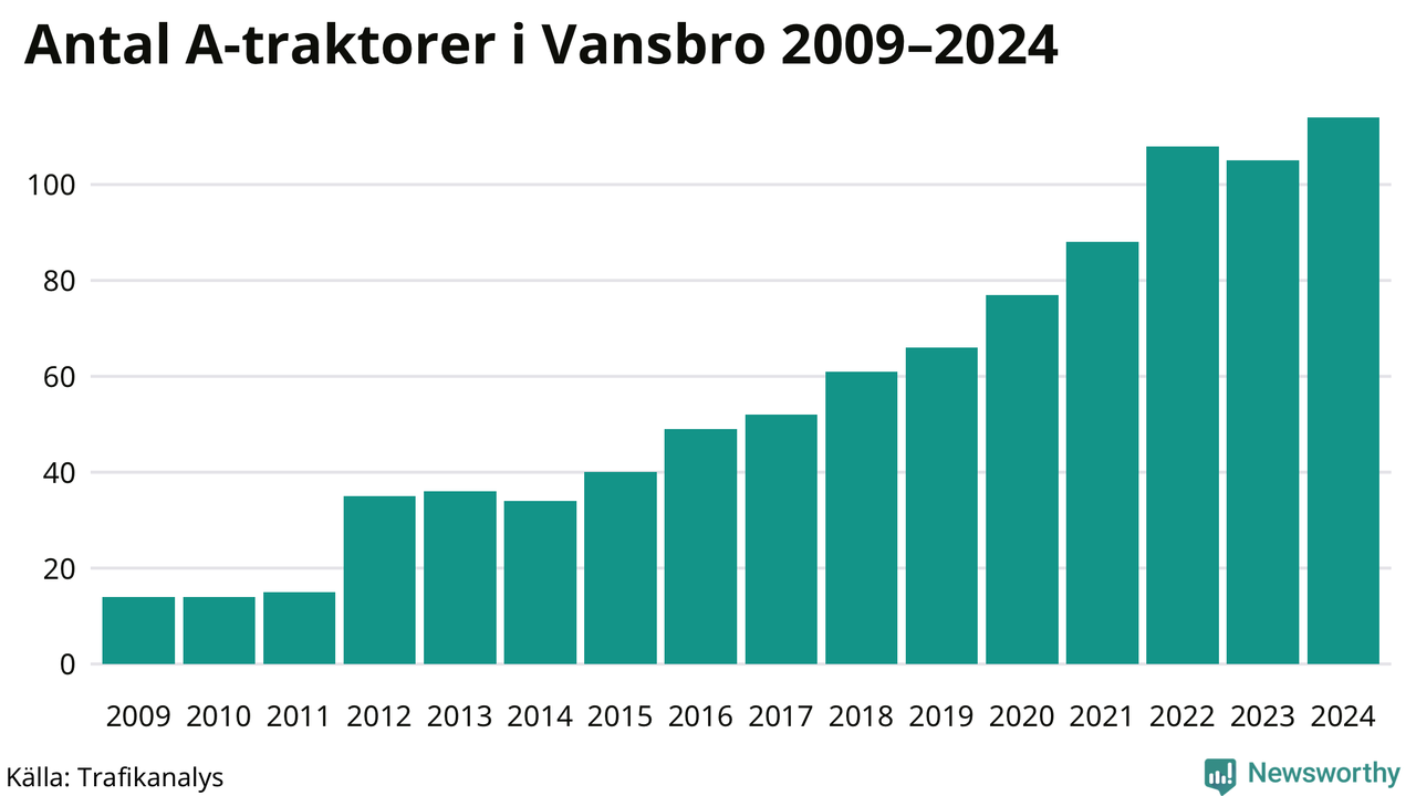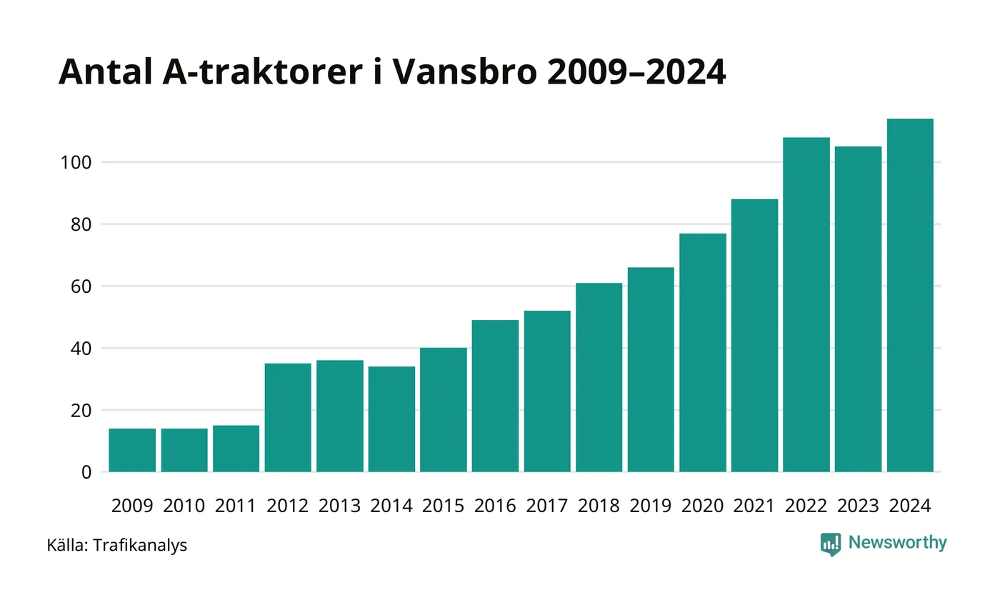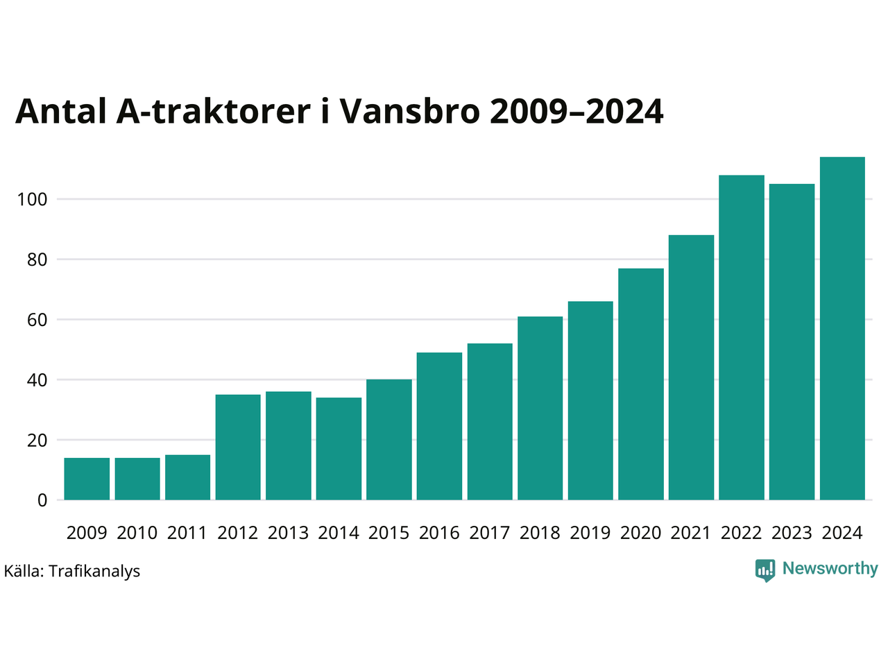 I slutet av 2024 fanns 114 A-traktorer registrerade i kommunen, vilket är nio mer än året innan – en ökning med 9 procent. Det visar nya siffror från Trafikanalys. Inte sedan åtminstone 2009, som är det första året vi har statistik för, har det funnits så många A-traktorer i kommunen.