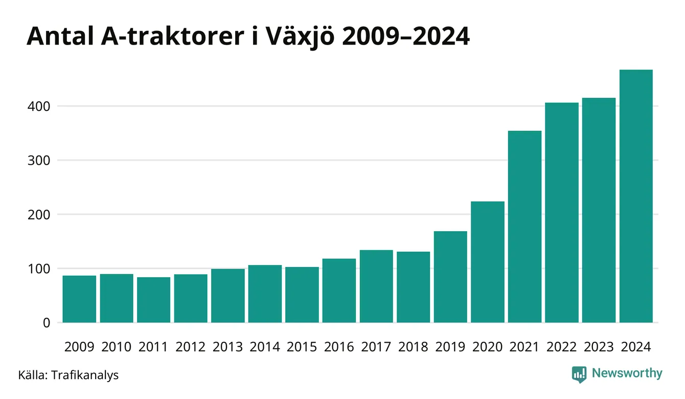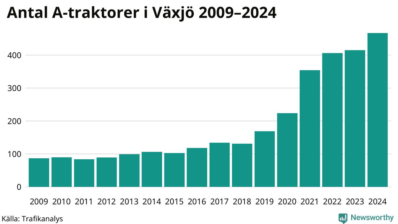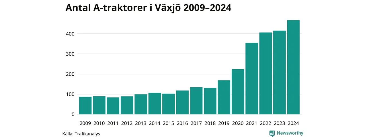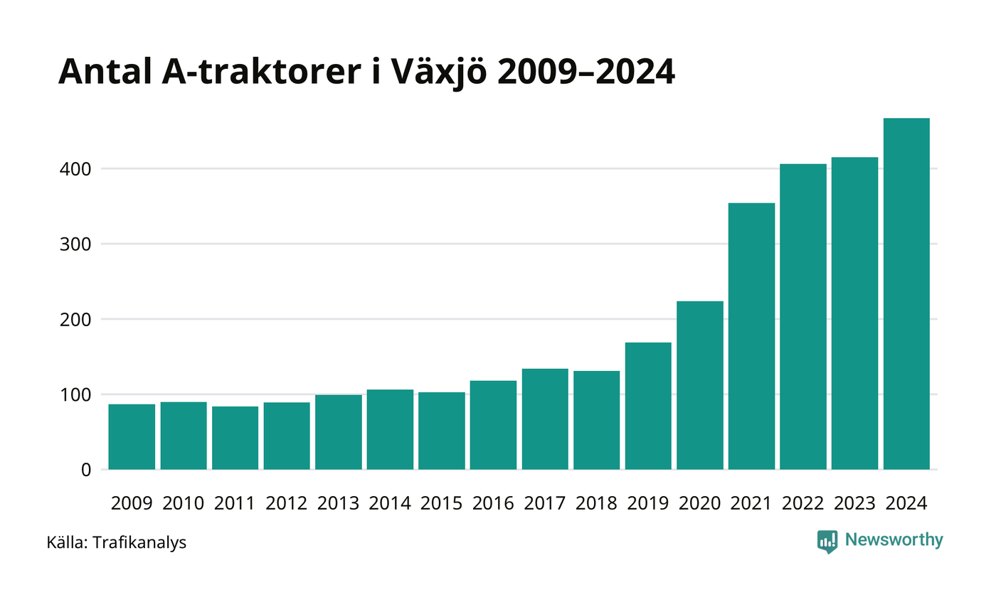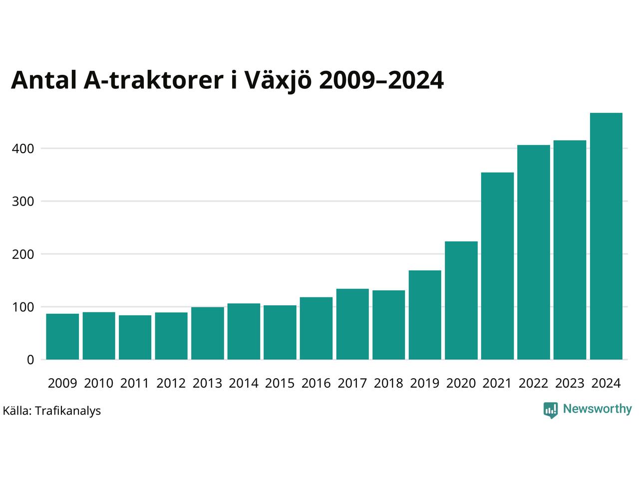 För sjätte året i rad ökar antalet A-traktorer i Växjö kommun, visar nya siffror från Trafikanalys. I slutet av 2024 fanns 467 A-traktorer registrerade i kommunen. Det är den största ökningen i Kronobergs län. Inte sedan åtminstone 2009, som är det första året vi har statistik för, har det funnits så många A-traktorer i kommunen.