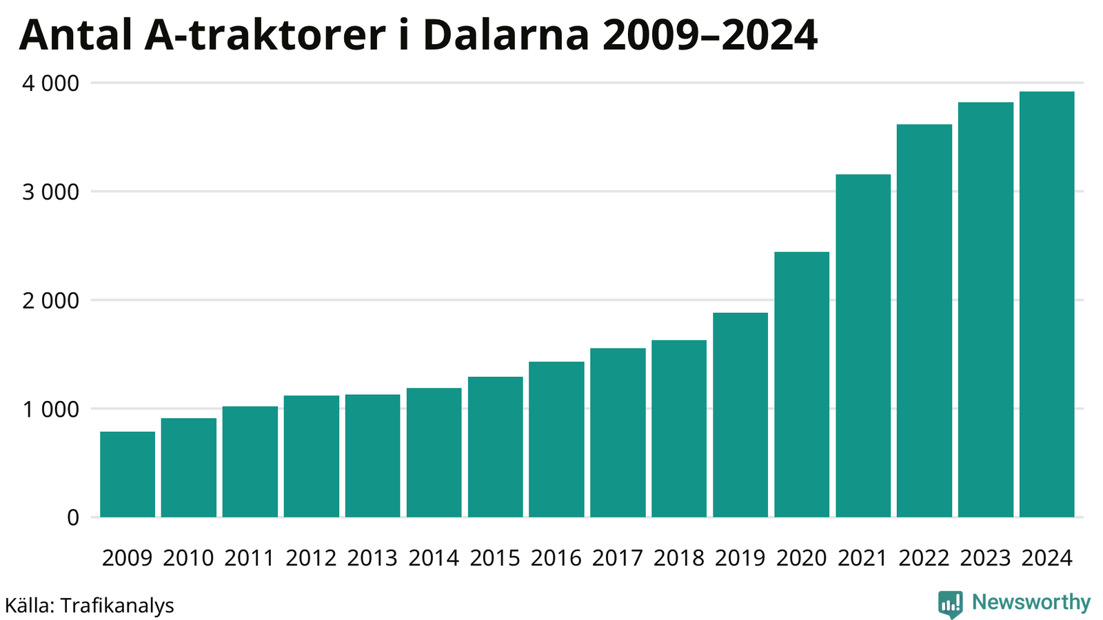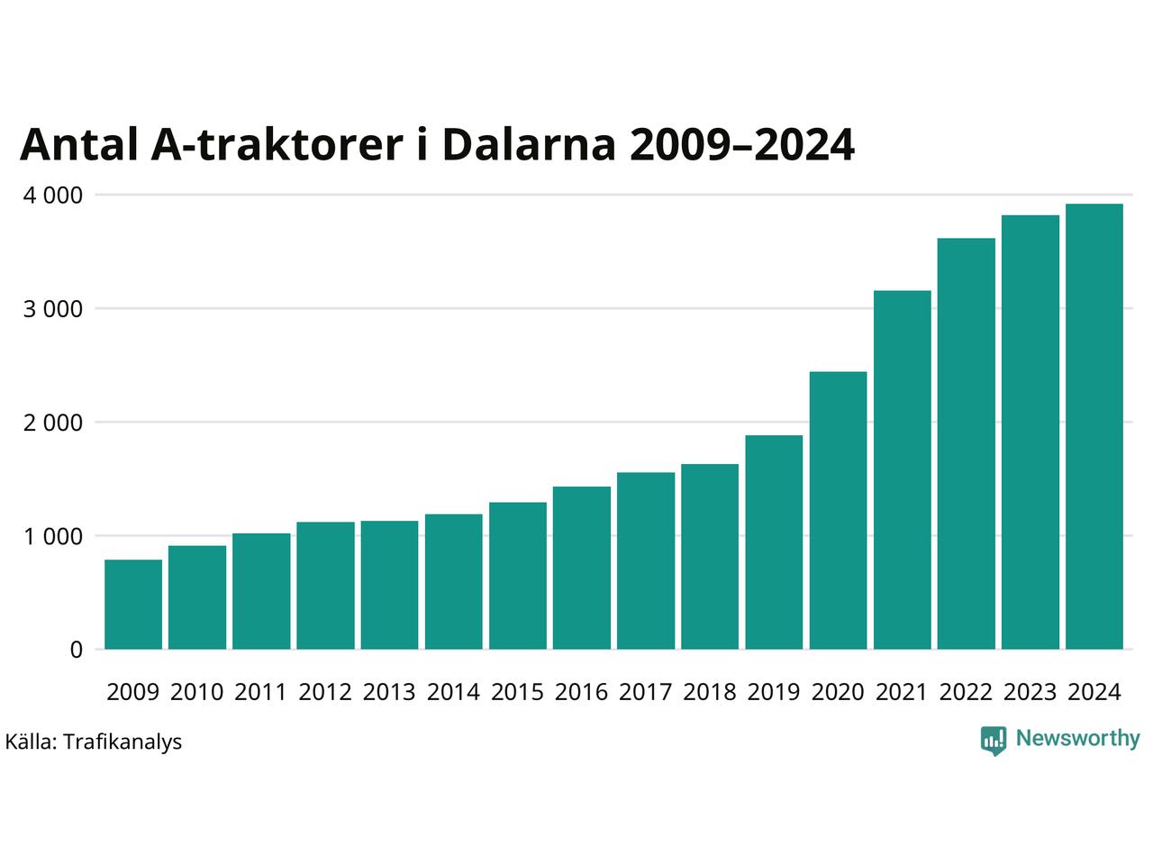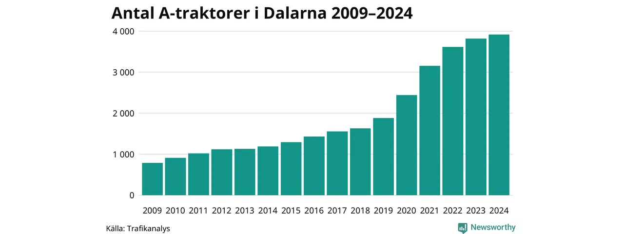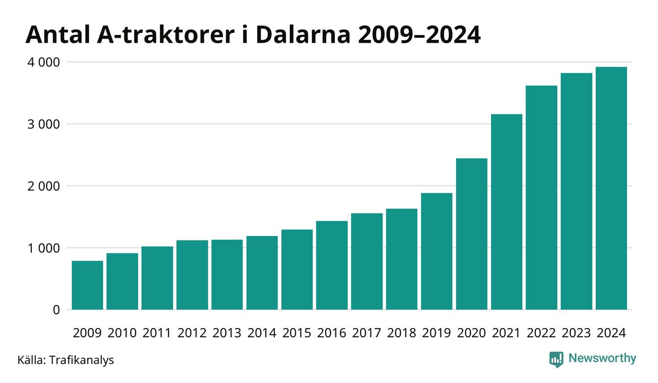För åtminstone 15:e året i rad ökar antalet A-traktorer i Dalarnas län, visar nya siffror från Trafikanalys. I slutet av 2024 fanns 3 919 A-traktorer registrerade i länet. Inte sedan åtminstone 2009, som är det första året vi har statistik för, har det funnits så många A-traktorer i länet.