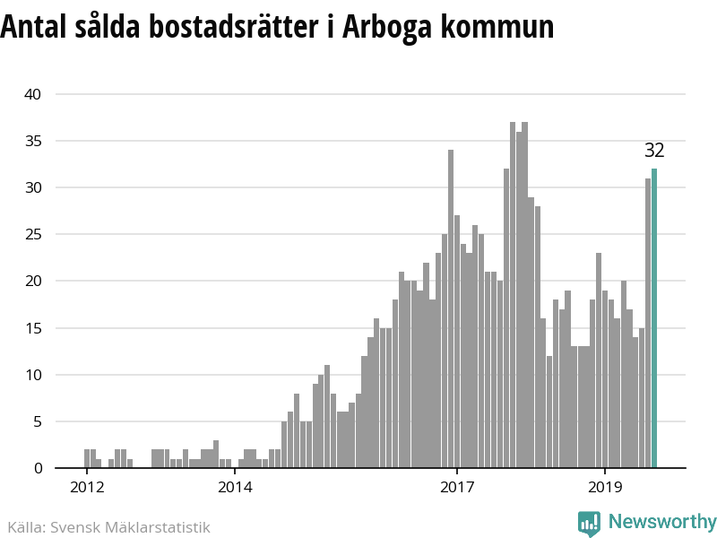 Mellan juli och september såldes 32 bostadsrätter i Arboga kommun. Det är relativt många sett till aktiviteten på bostadsmarknaden i kommunen under de senaste tolv månaderna, samt det historiska snittet för den här tiden på året.