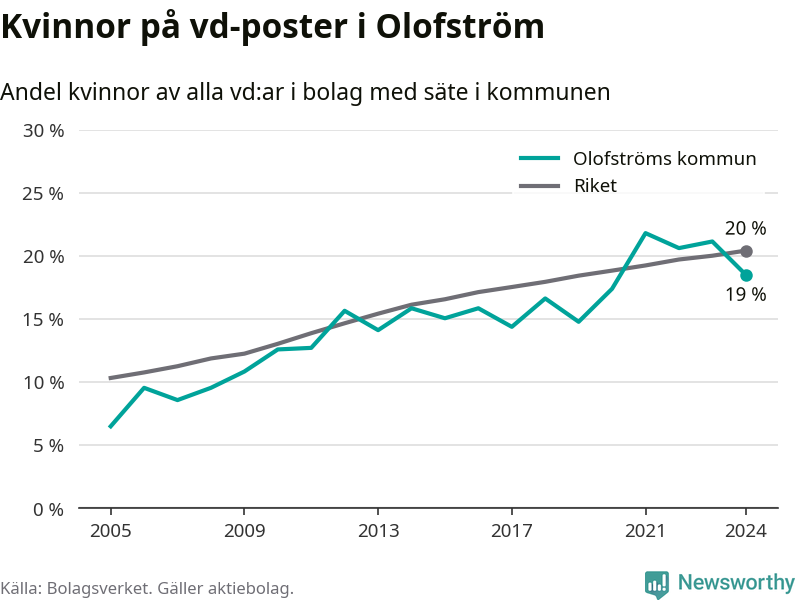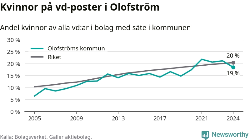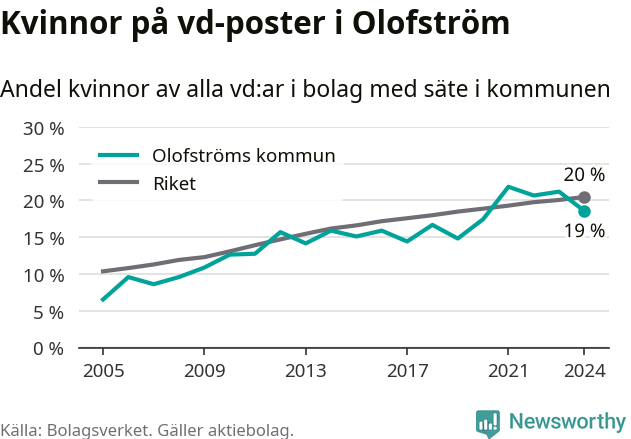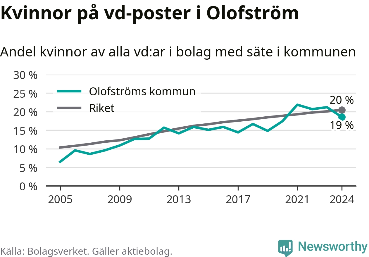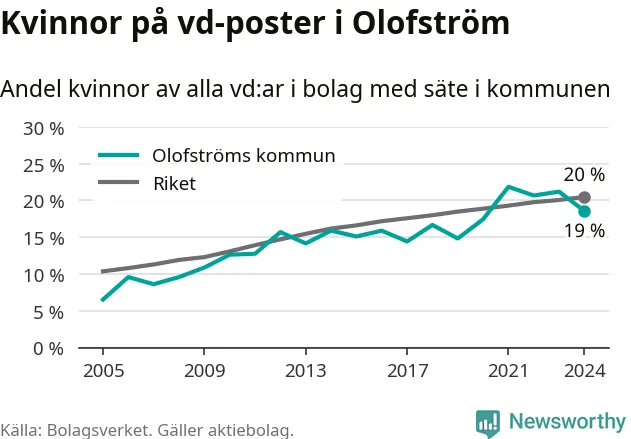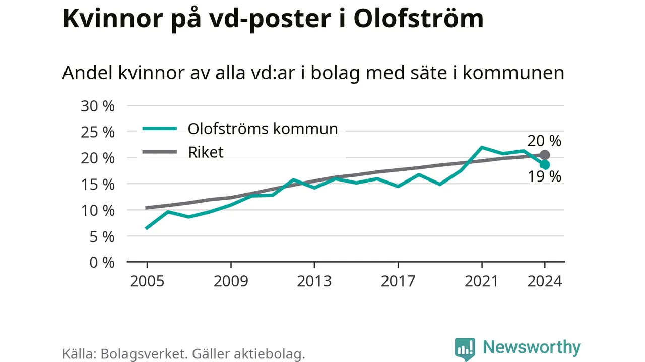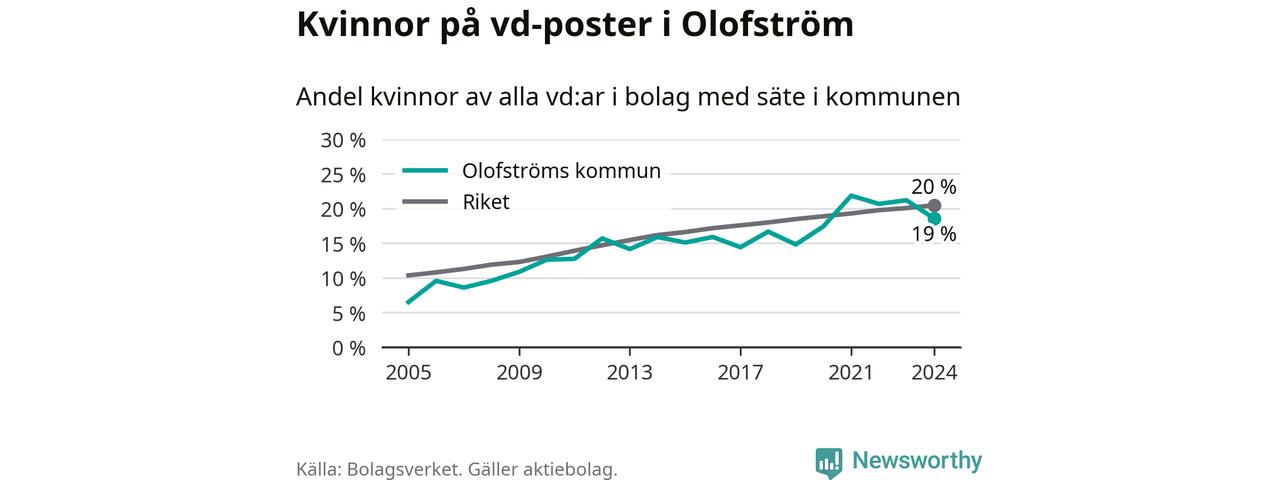 19 procent av aktiebolagen i Olofström hade en kvinna som verkställande direktör vid årsskiftet. Det innebär att på varje kvinnlig vd går fyra män. Det är två färre än året innan. 2021 satt kvinnor på 22 procent av vd-stolarna i kommunen, vilket är den högsta siffran de senaste två decennierna.