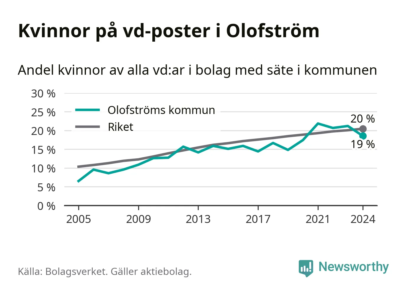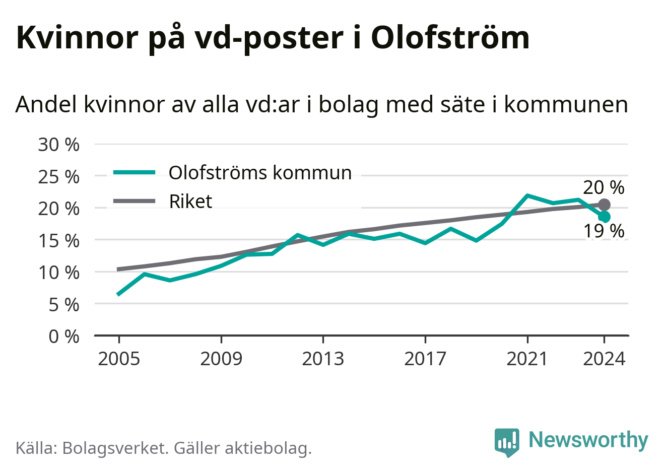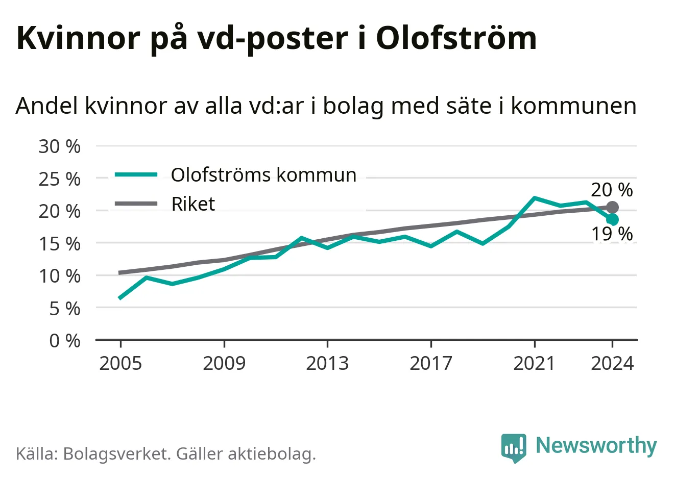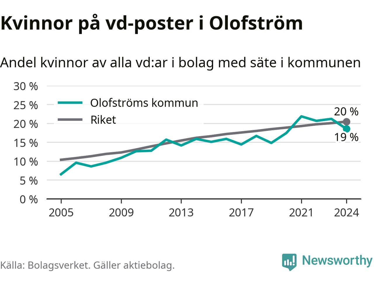 19 procent av aktiebolagen i Olofström hade en kvinna som verkställande direktör vid årsskiftet. Det innebär att på varje kvinnlig vd går fyra män. Det är två färre än året innan. 2021 satt kvinnor på 22 procent av vd-stolarna i kommunen, vilket är den högsta siffran de senaste två decennierna.