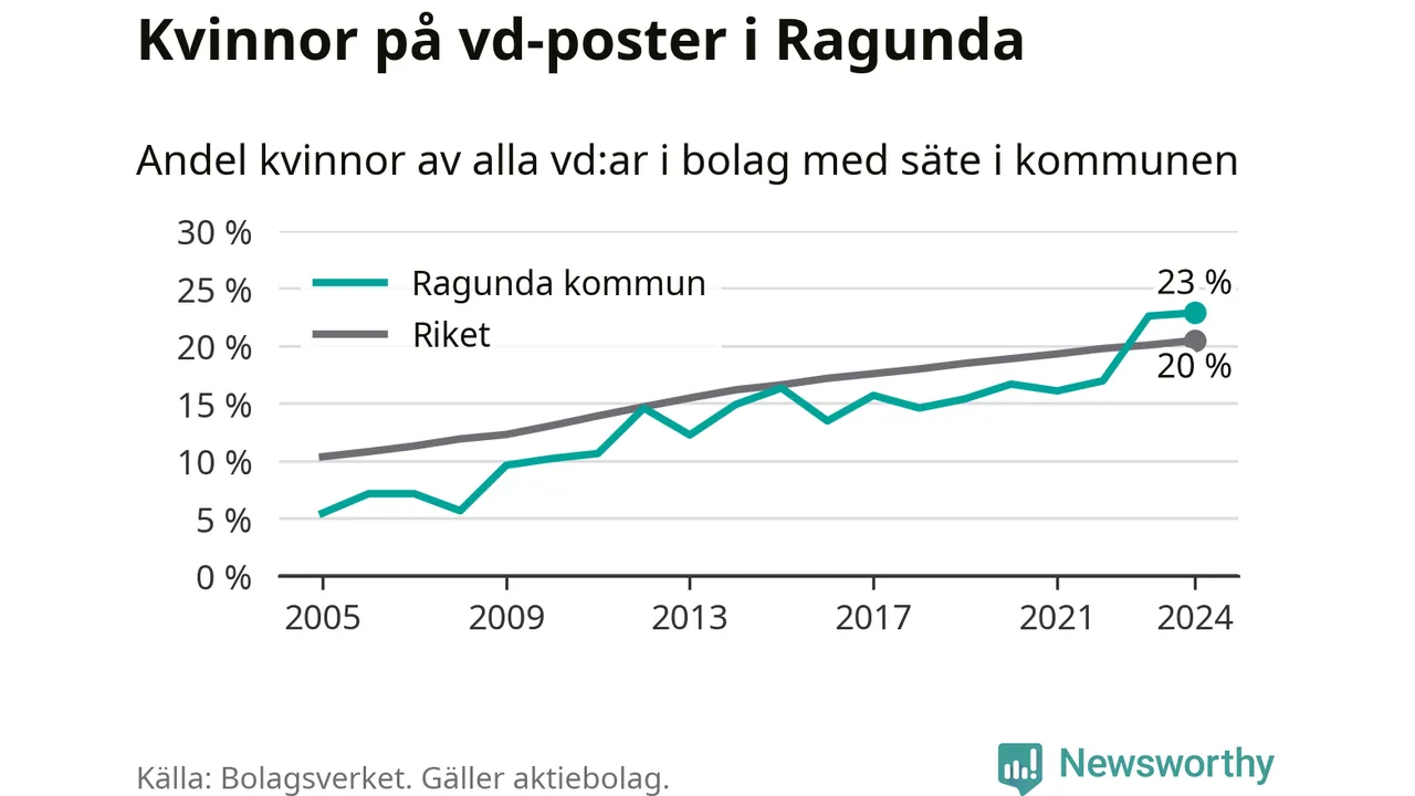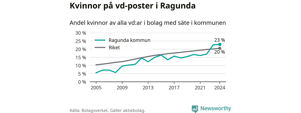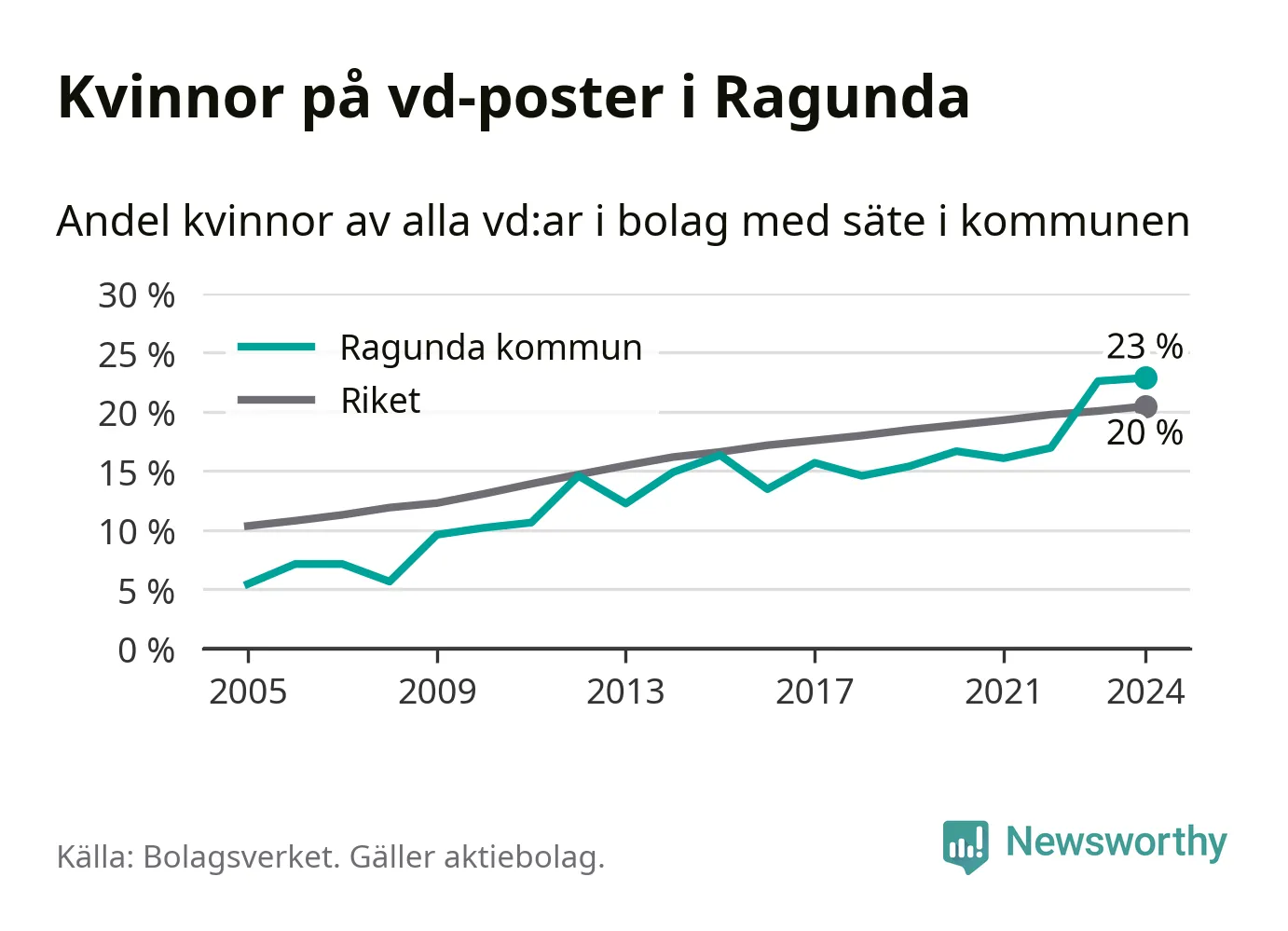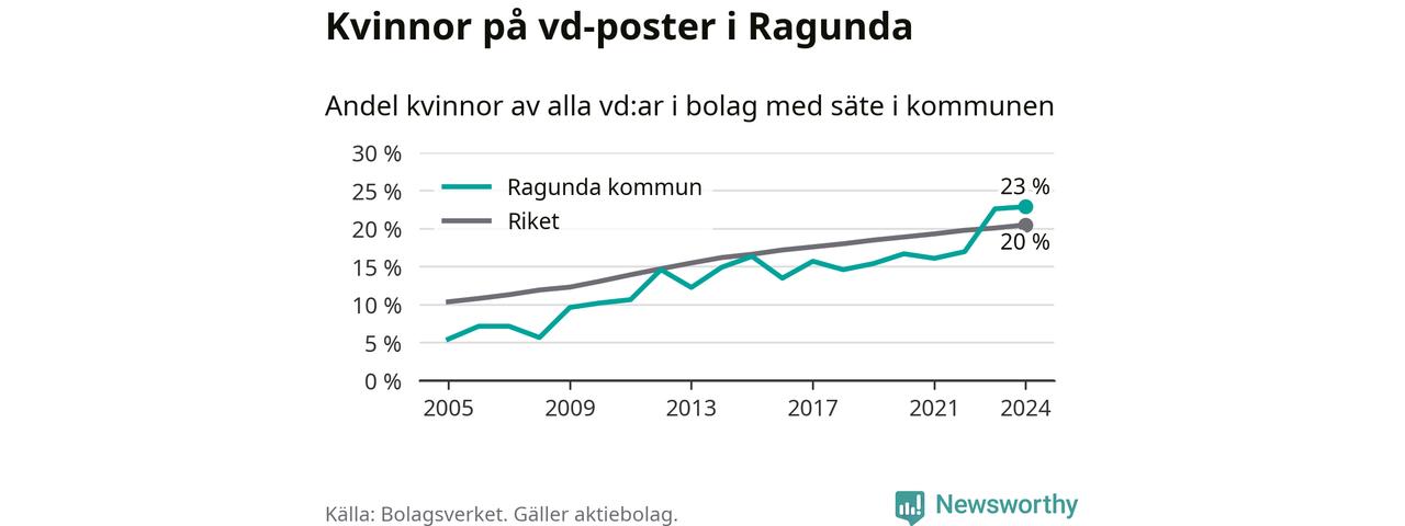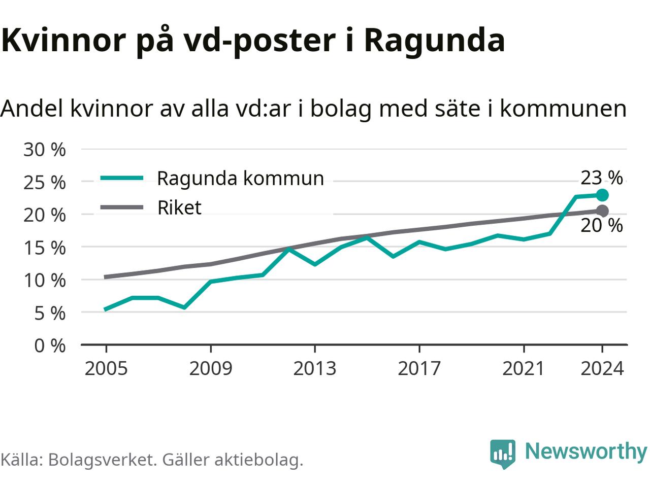 23 procent av aktiebolagen i Ragunda hade en kvinna som verkställande direktör vid årsskiftet. Det innebär att på varje kvinnlig vd går tre män. Det är lika stor andel som året innan. Det är den högsta andelen kvinnliga vd:ar i kommunen sedan åtminstone 2005.Värt att ha i åtanke är att det dock handlar om relativt få företag med rapporterade vd:ar i Ragunda, för år 2024 rör det sig om 70 företag.