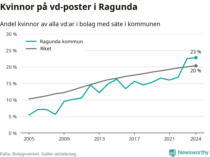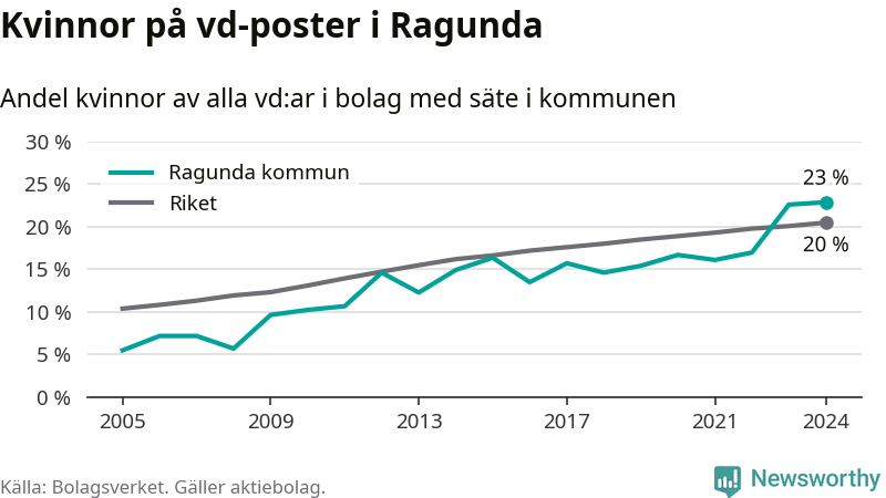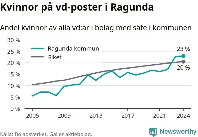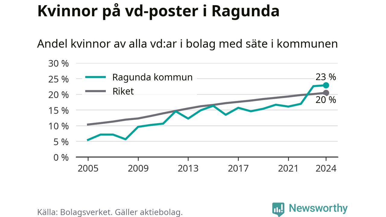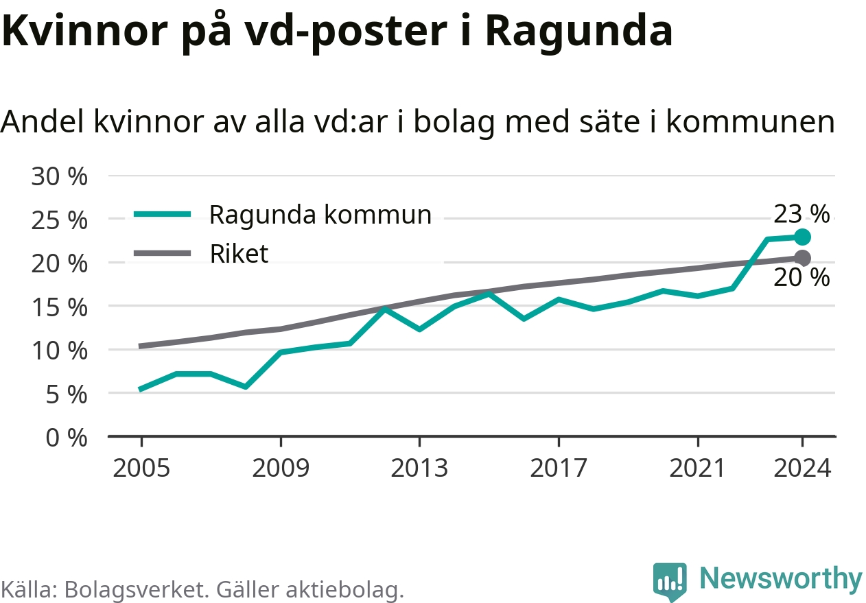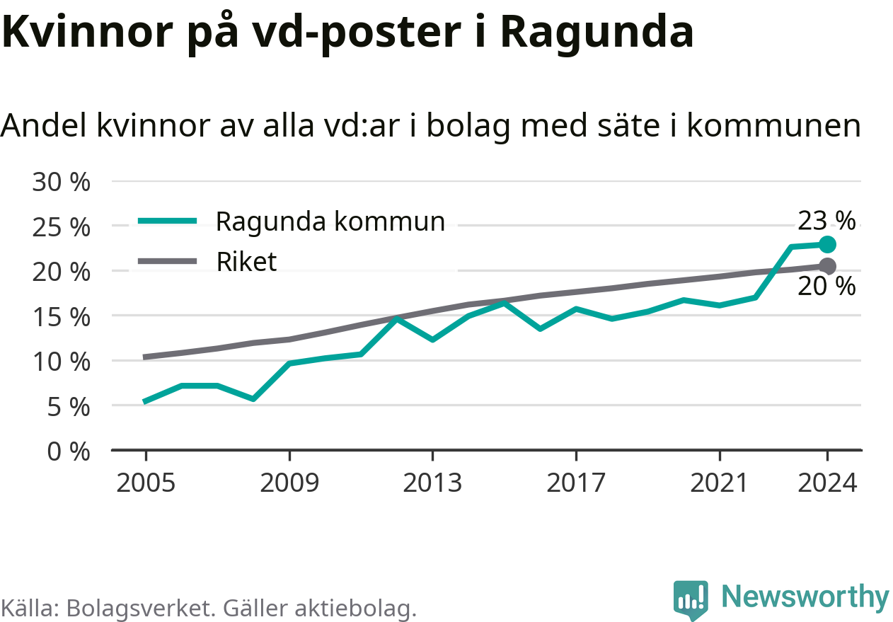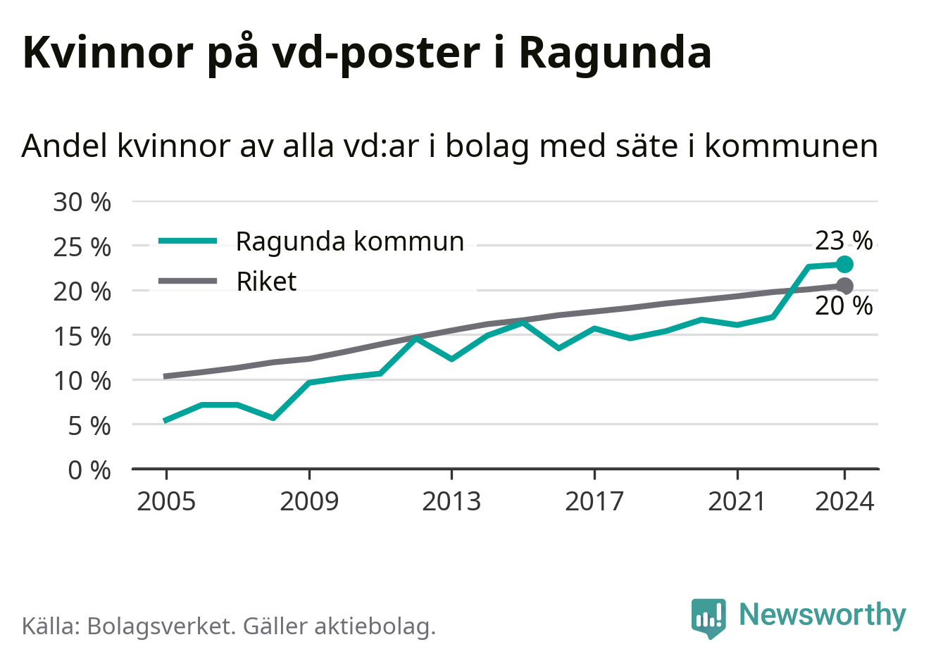 23 procent av aktiebolagen i Ragunda hade en kvinna som verkställande direktör vid årsskiftet. Det innebär att på varje kvinnlig vd går tre män. Det är lika stor andel som året innan. Det är den högsta andelen kvinnliga vd:ar i kommunen sedan åtminstone 2005.Värt att ha i åtanke är att det dock handlar om relativt få företag med rapporterade vd:ar i Ragunda, för år 2024 rör det sig om 70 företag.