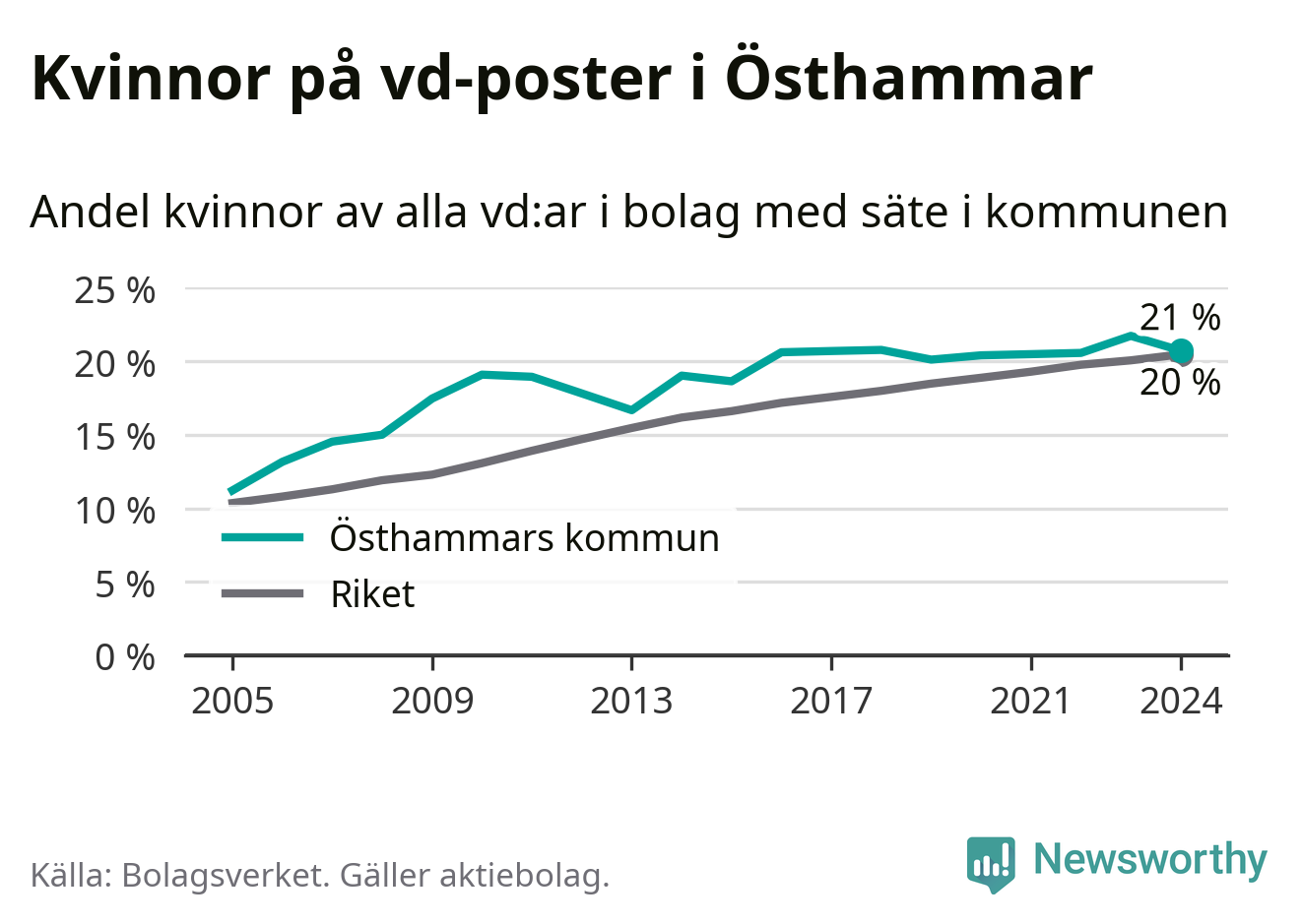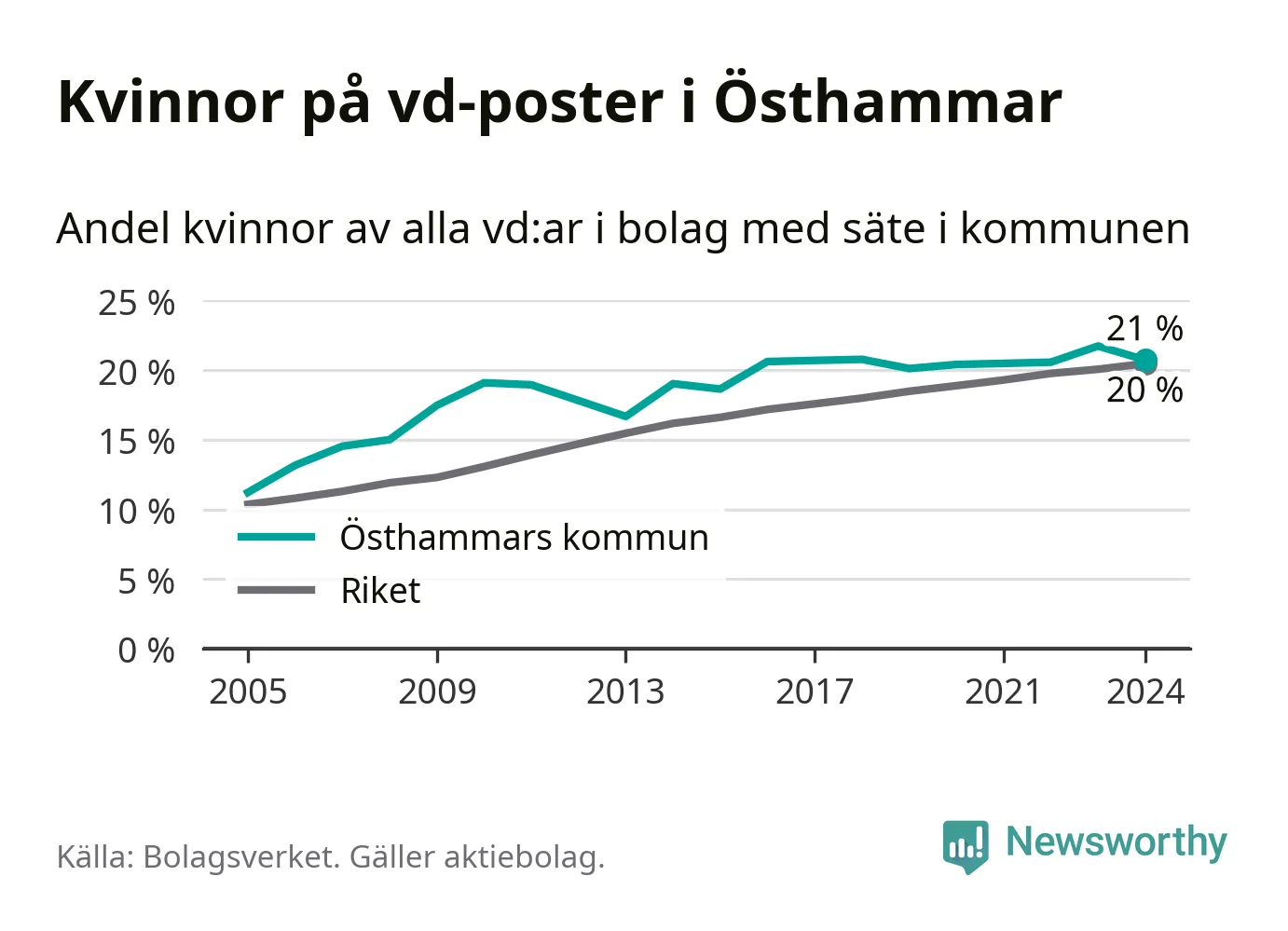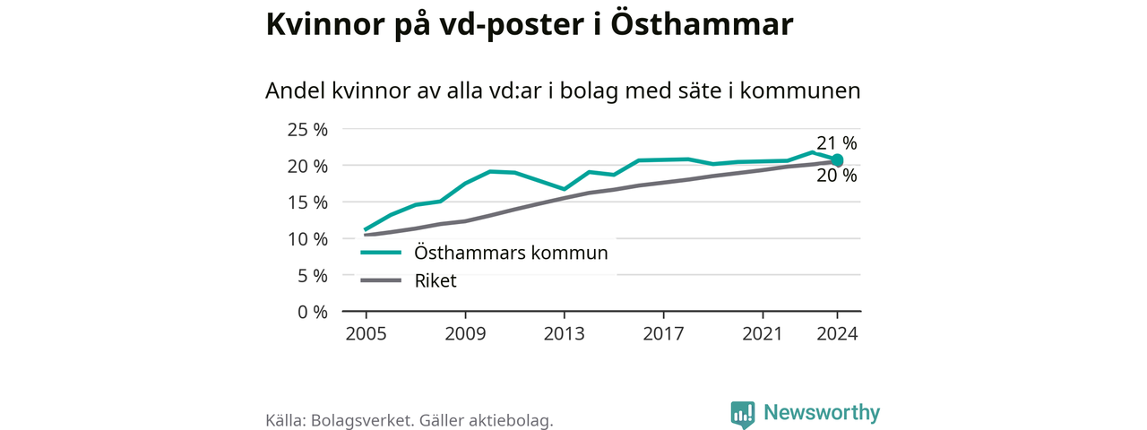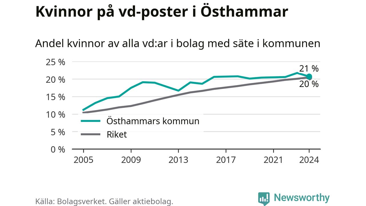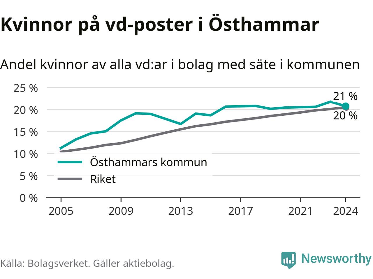 21 procent av aktiebolagen i Östhammar hade en kvinna som verkställande direktör vid årsskiftet. Det innebär att på varje kvinnlig vd går fyra män. Det är en minskning med en procentenhet jämfört med året innan. Då var andelen den högsta hittills sedan åtminstone 2005.