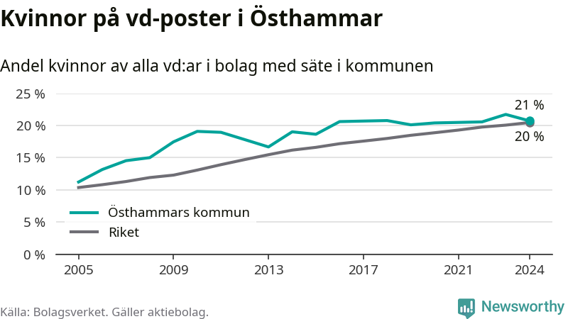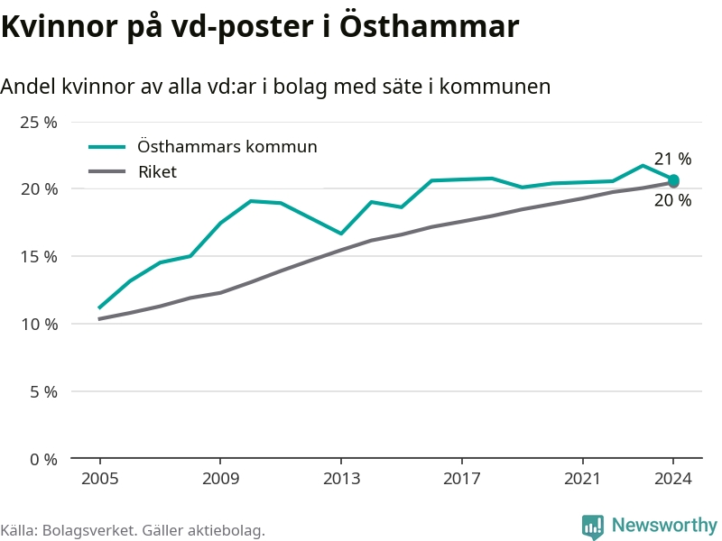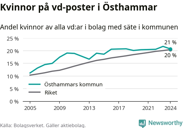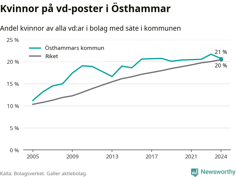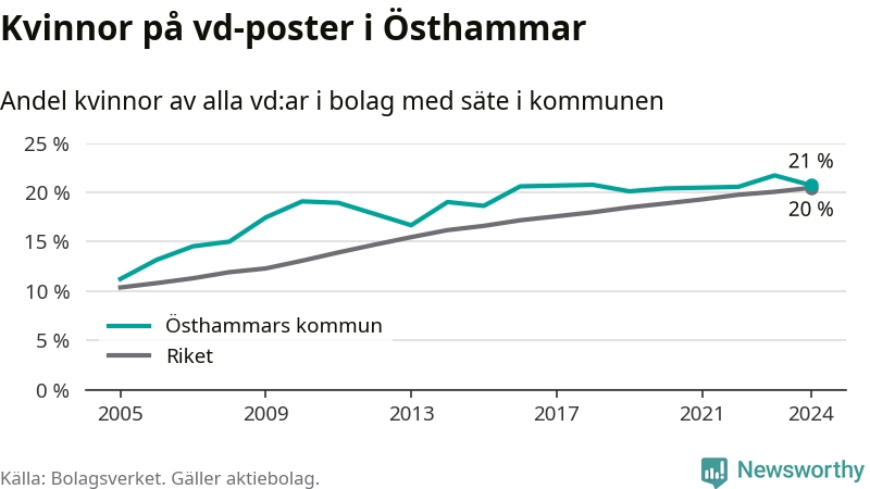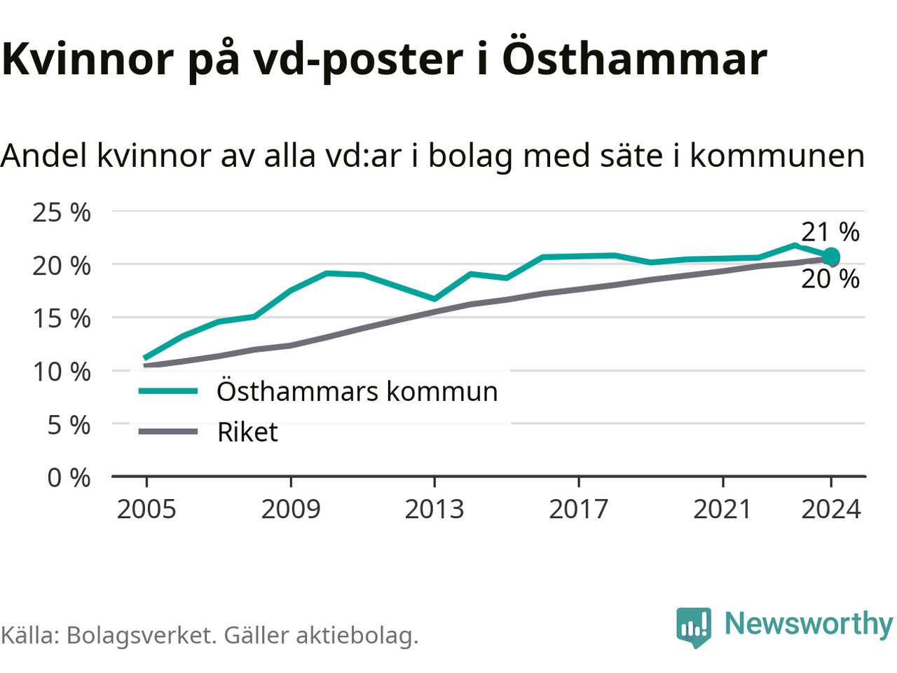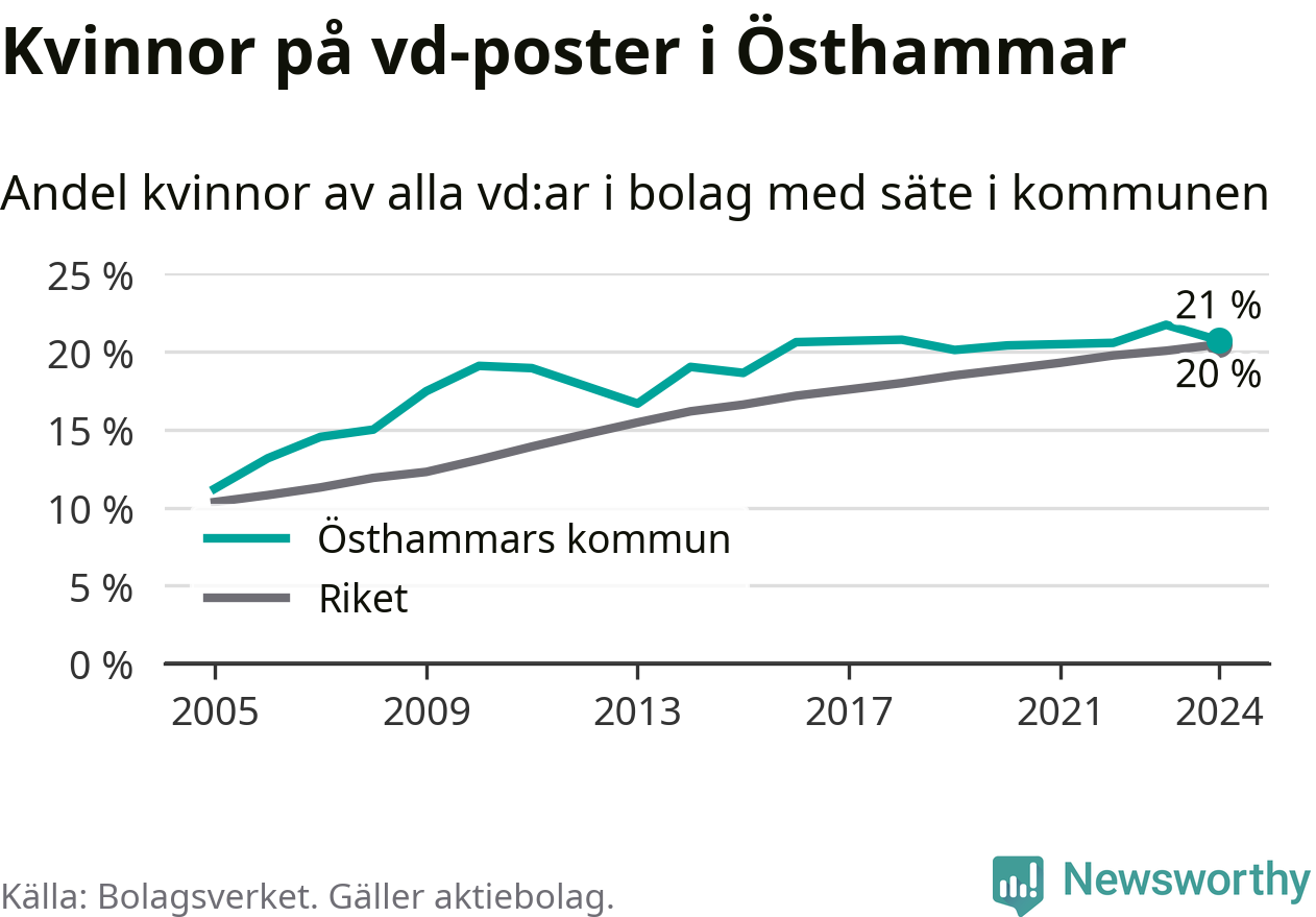 21 procent av aktiebolagen i Östhammar hade en kvinna som verkställande direktör vid årsskiftet. Det innebär att på varje kvinnlig vd går fyra män. Det är en minskning med en procentenhet jämfört med året innan. Då var andelen den högsta hittills sedan åtminstone 2005.