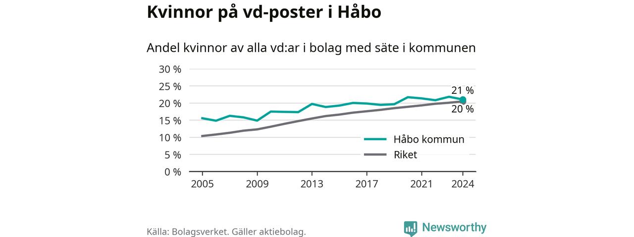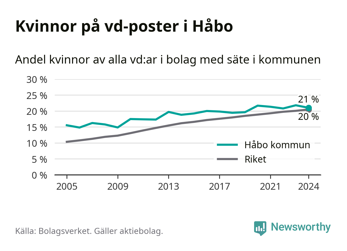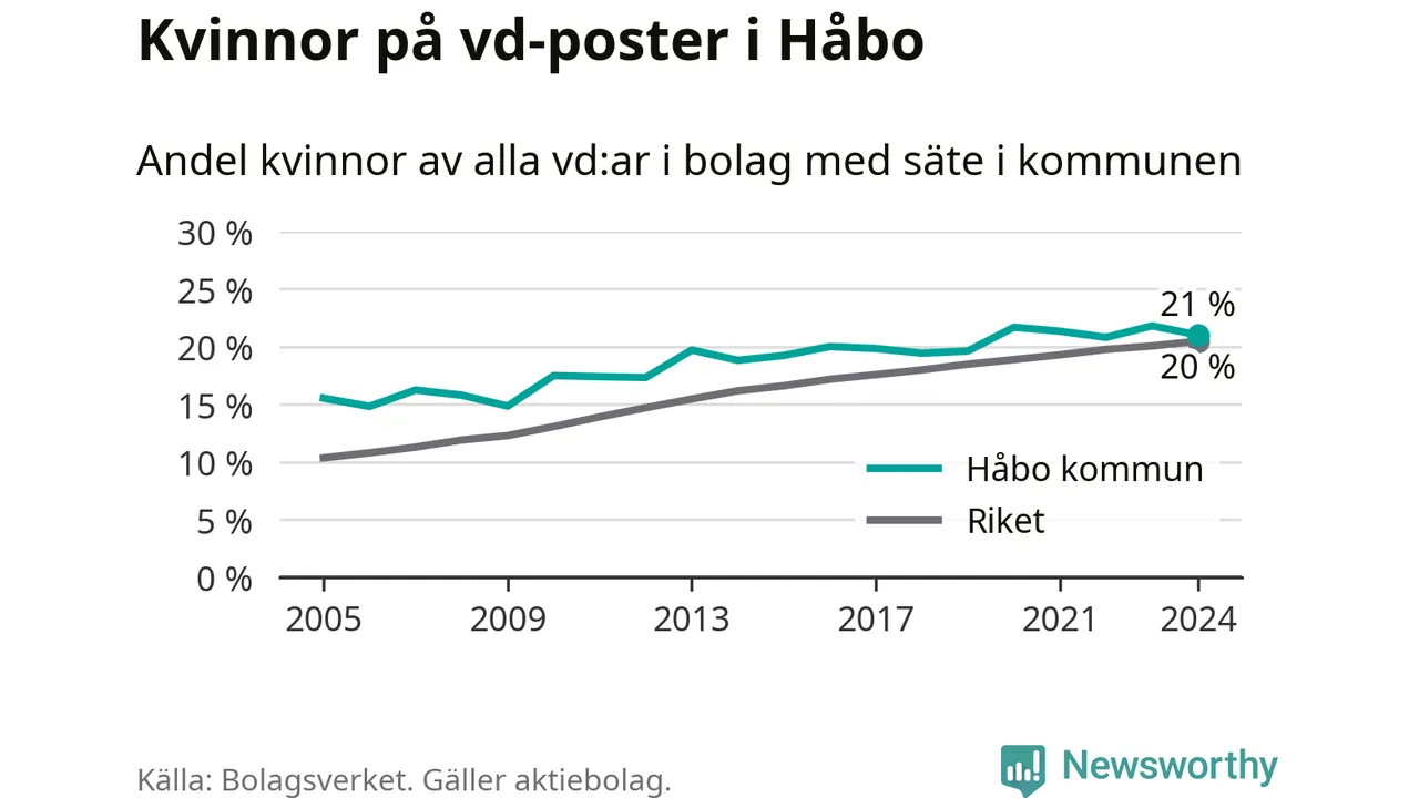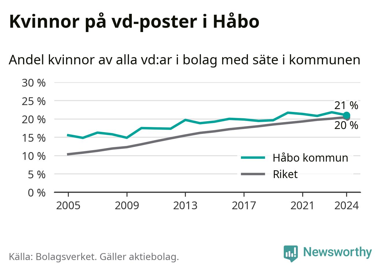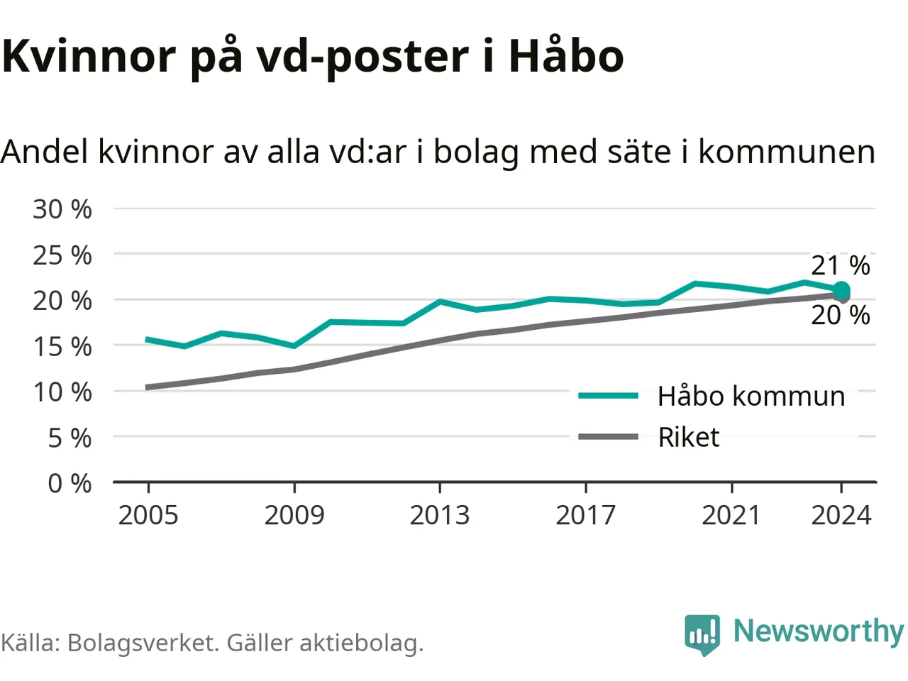 21 procent av aktiebolagen i Håbo hade en kvinna som verkställande direktör vid årsskiftet. Det innebär att på varje kvinnlig vd går nästan fyra män. Det är en något lägre andel än året innan, även om antalet vd-poster som innehas av kvinnor faktiskt ökat med tre stycken. Andelen kvinnliga vd:ar i kommunen var den högsta sedan åtminstone 2005 i slutet av 2023.