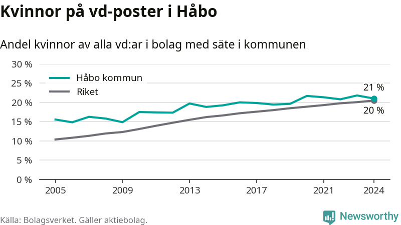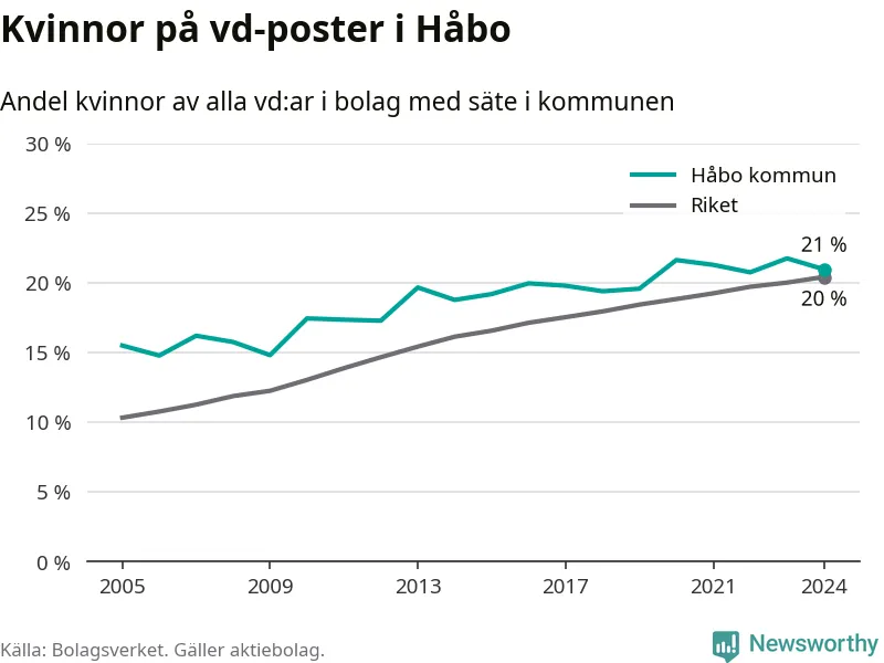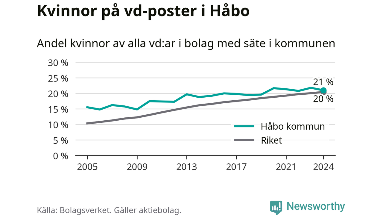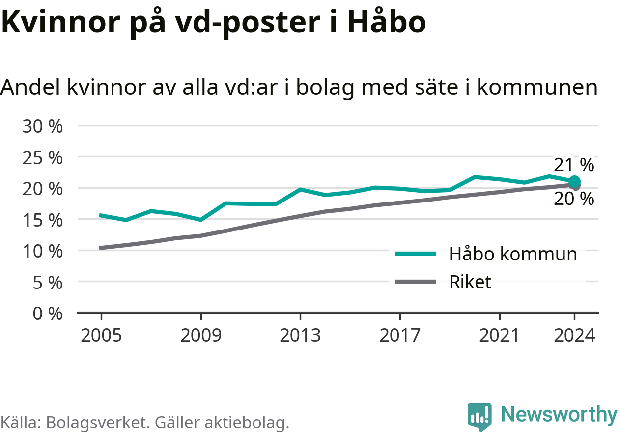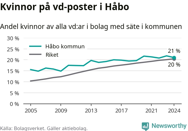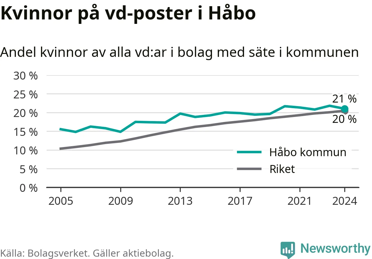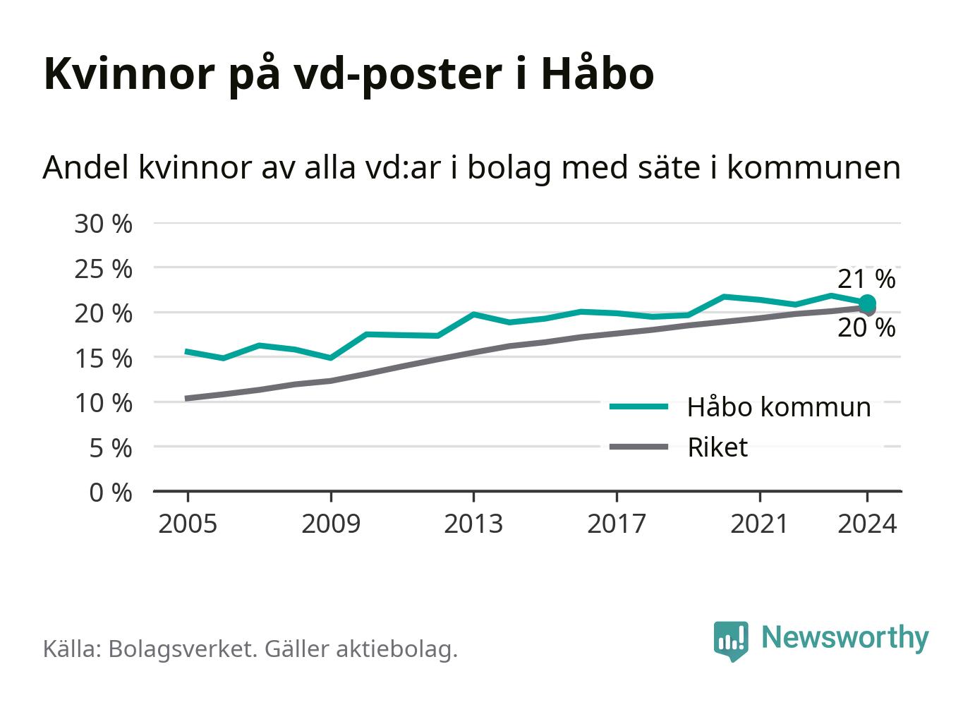 21 procent av aktiebolagen i Håbo hade en kvinna som verkställande direktör vid årsskiftet. Det innebär att på varje kvinnlig vd går nästan fyra män. Det är en något lägre andel än året innan, även om antalet vd-poster som innehas av kvinnor faktiskt ökat med tre stycken. Andelen kvinnliga vd:ar i kommunen var den högsta sedan åtminstone 2005 i slutet av 2023.