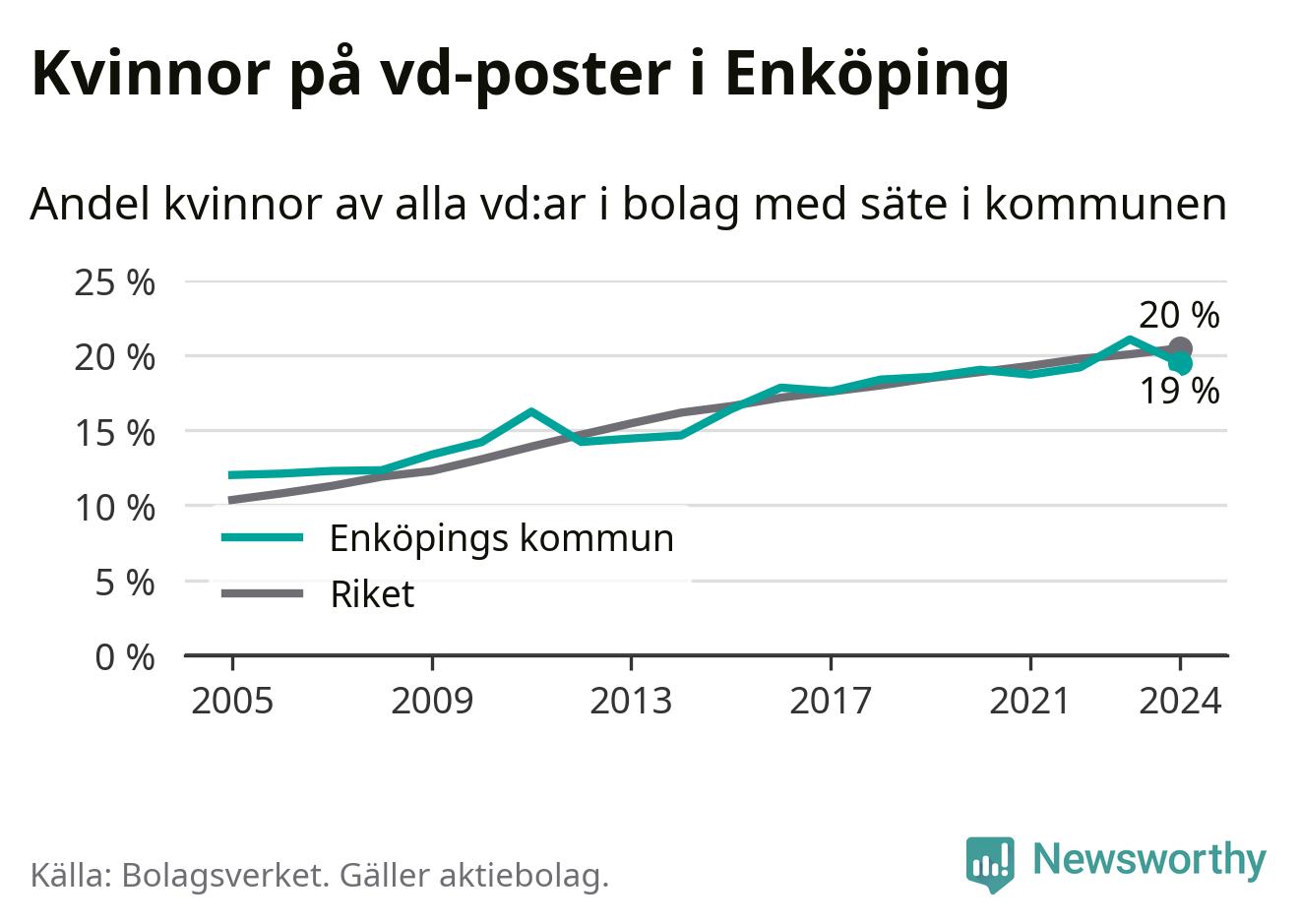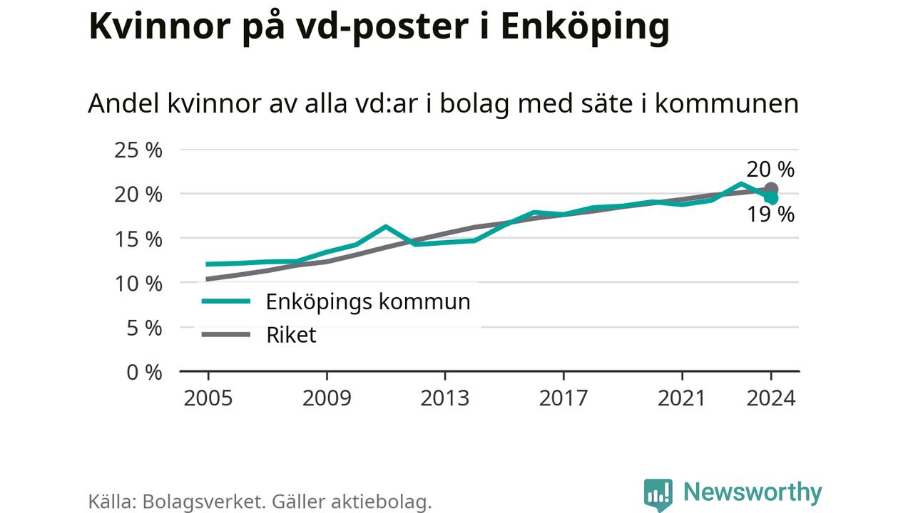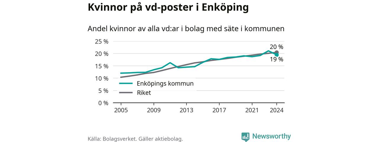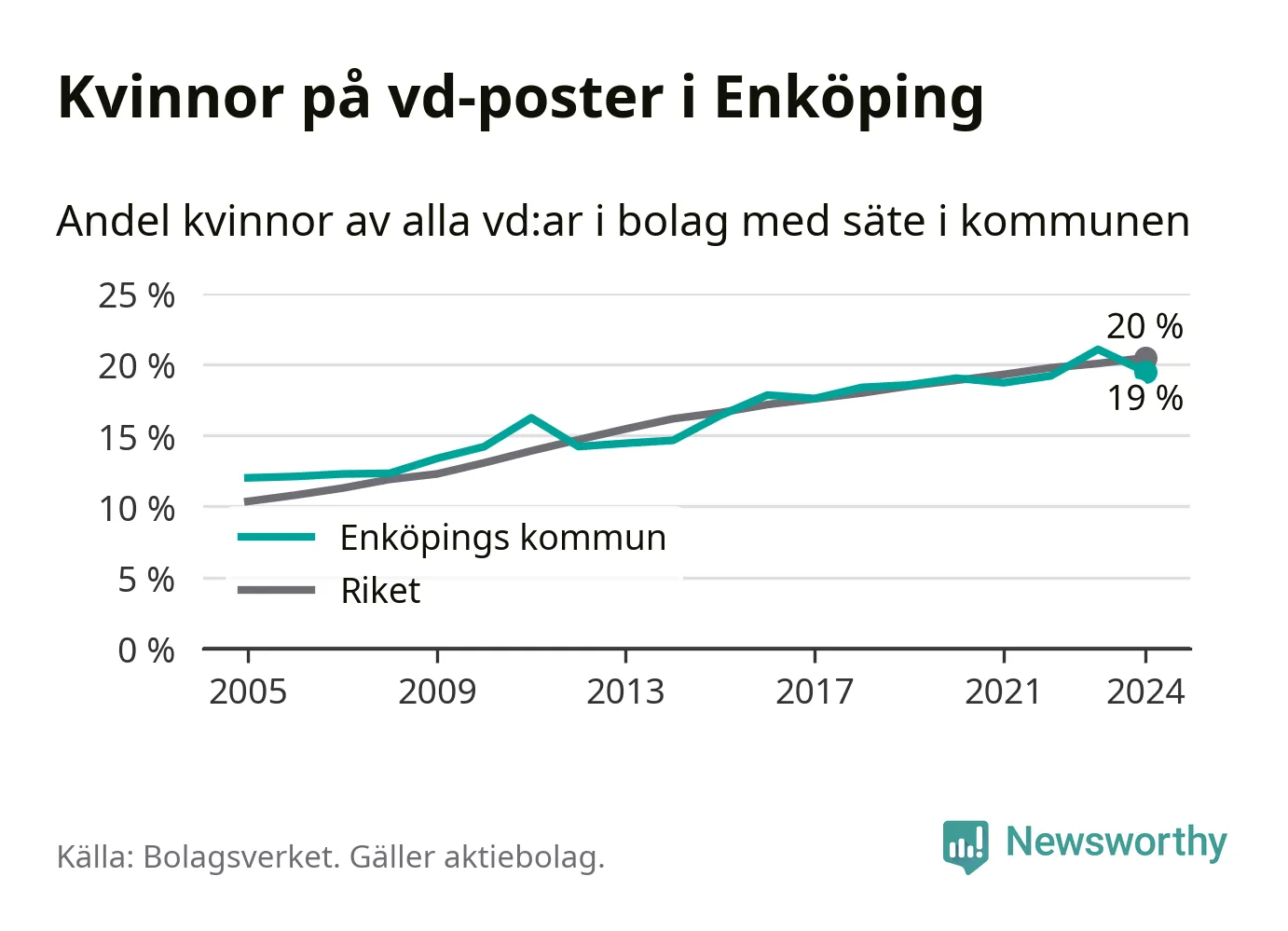 19 procent av aktiebolagen i Enköping hade en kvinna som verkställande direktör vid årsskiftet. Det innebär att på varje kvinnlig vd går fyra män. Det är en minskning med två procentenheter jämfört med året innan. Då var andelen den högsta hittills sedan åtminstone 2005.