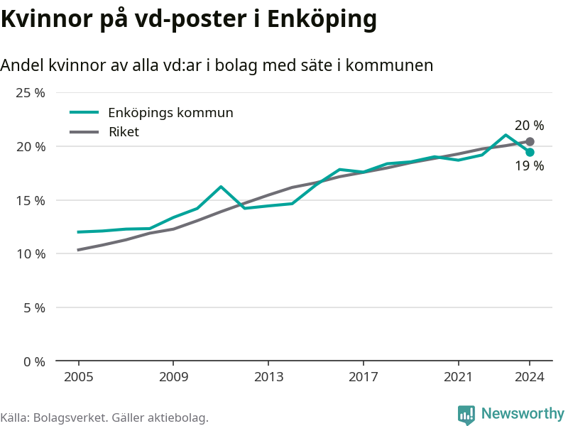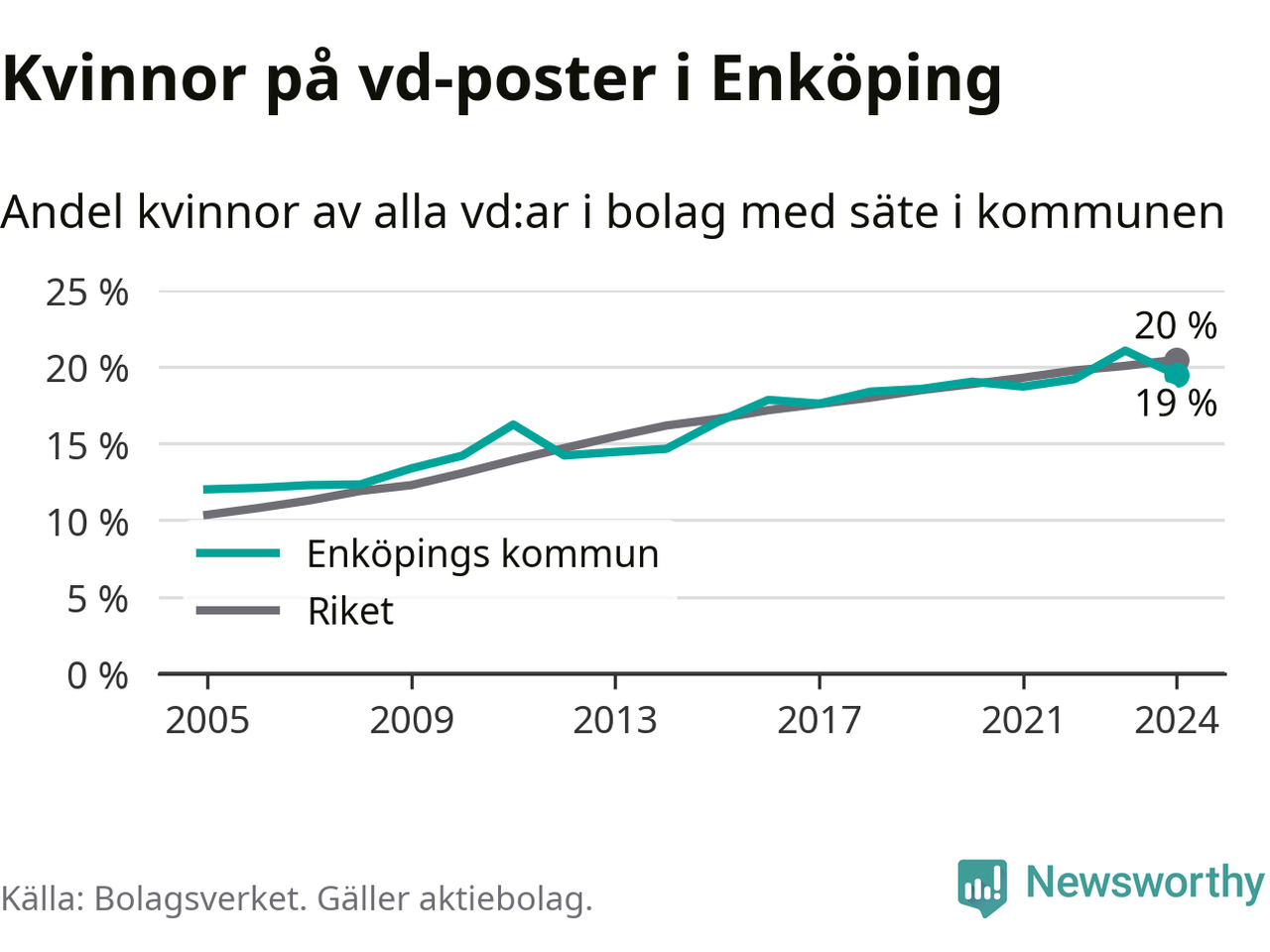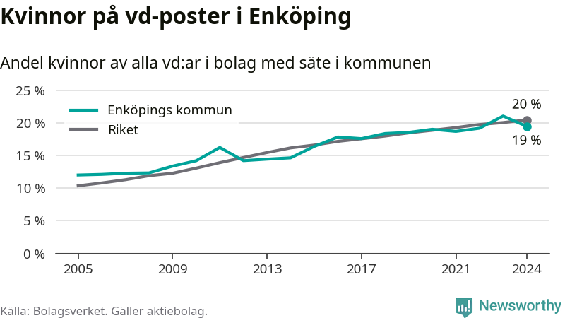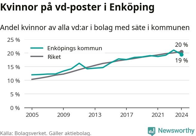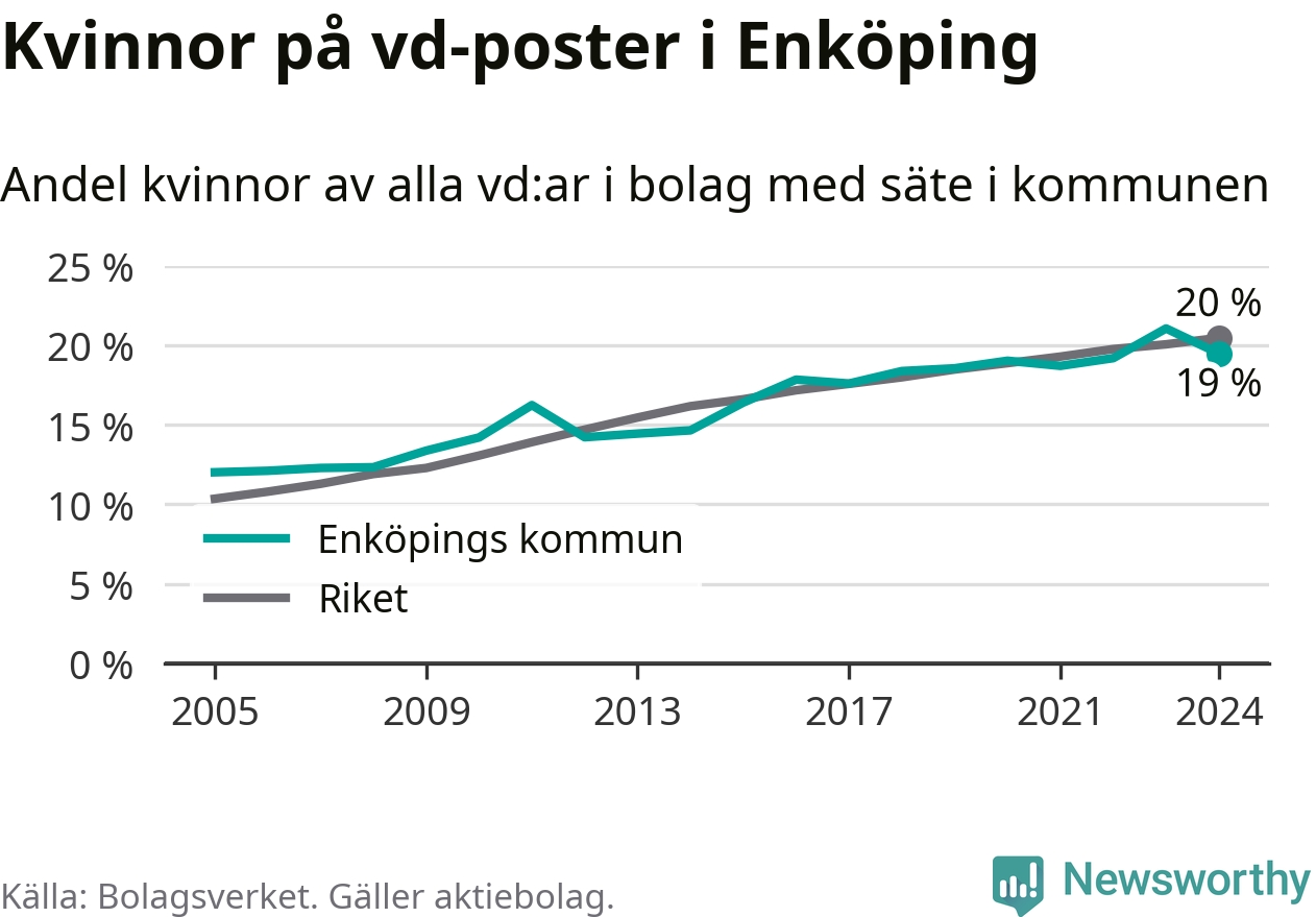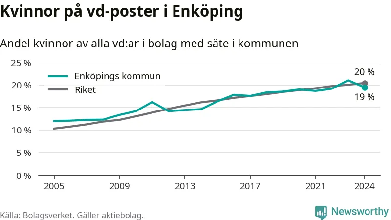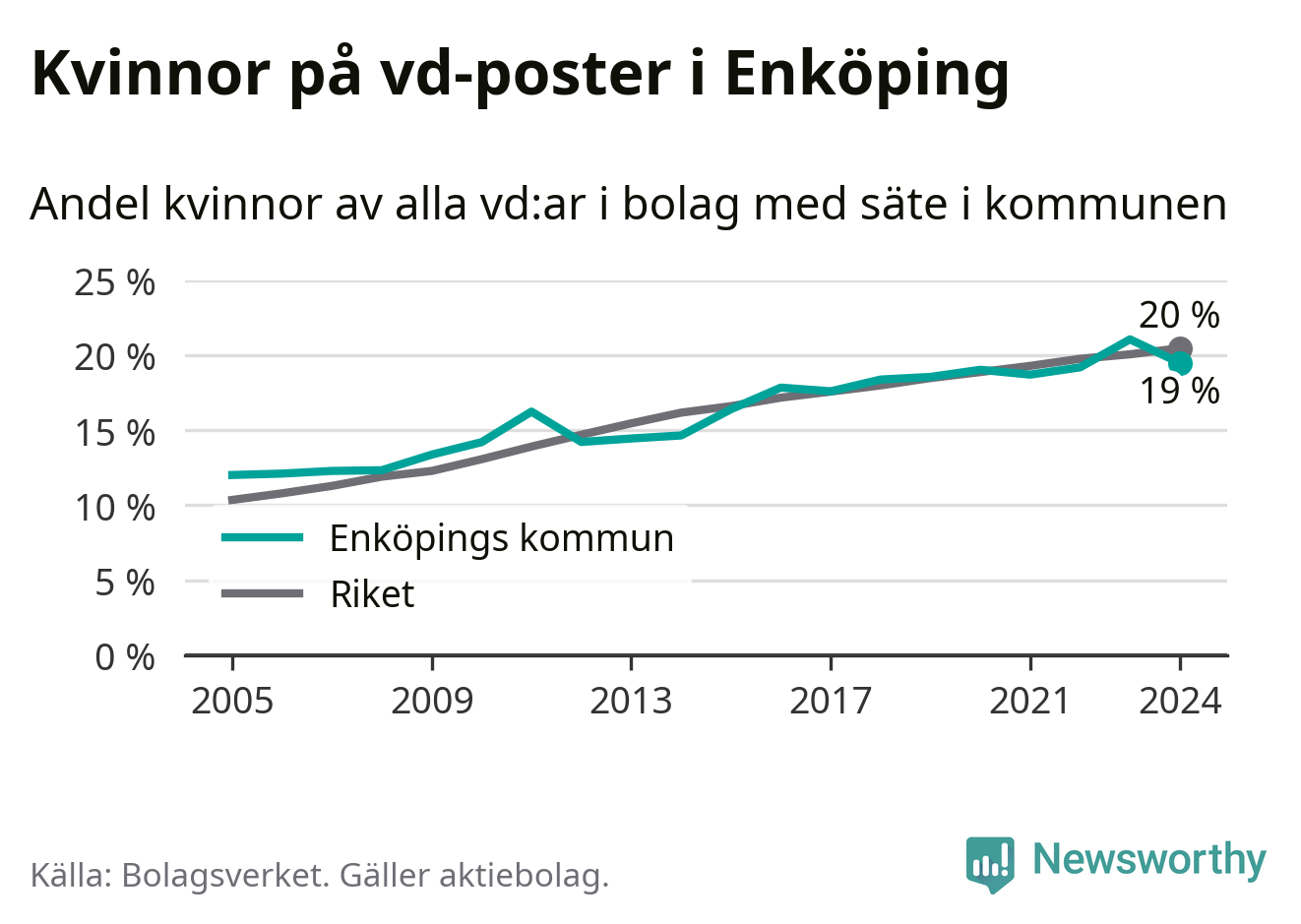 19 procent av aktiebolagen i Enköping hade en kvinna som verkställande direktör vid årsskiftet. Det innebär att på varje kvinnlig vd går fyra män. Det är en minskning med två procentenheter jämfört med året innan. Då var andelen den högsta hittills sedan åtminstone 2005.