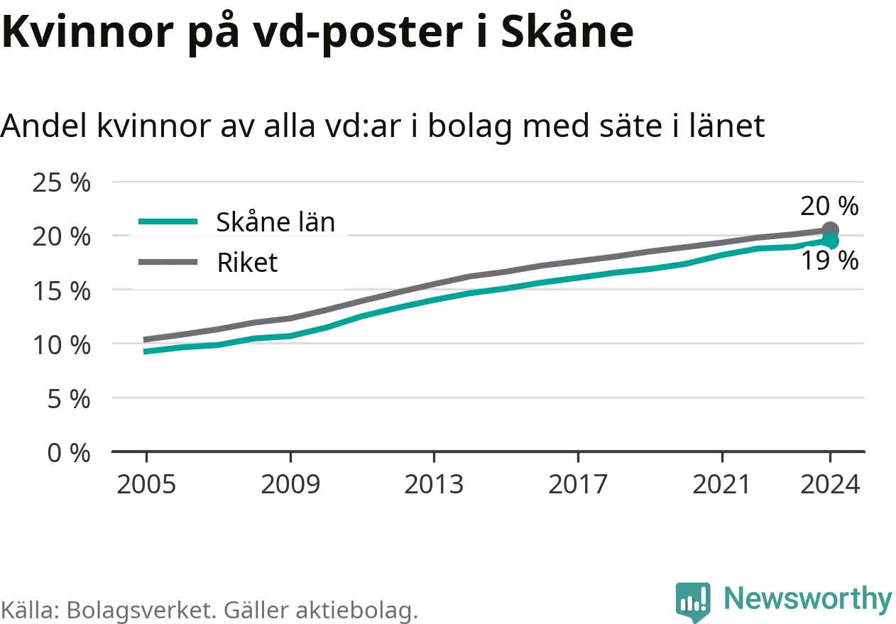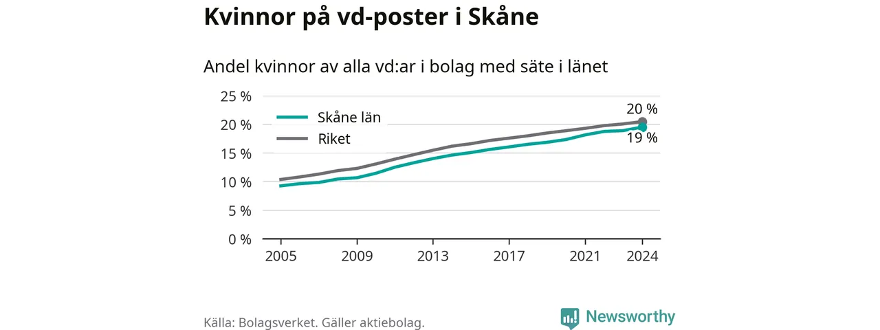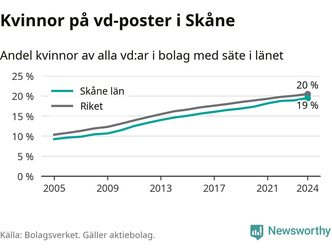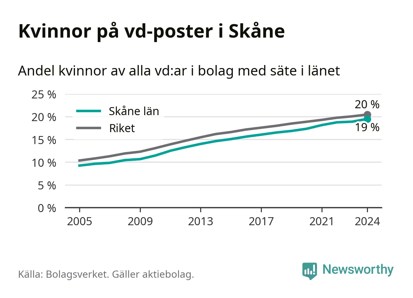 19 procent av aktiebolagen i Skåne hade en kvinna som verkställande direktör vid årsskiftet. Det innebär att på varje kvinnlig vd går fyra män. Det är ungefär lika stor andel som året innan. Andelen kvinnliga vd:ar i länet har haft en ökande trend de senaste 19 åren.
