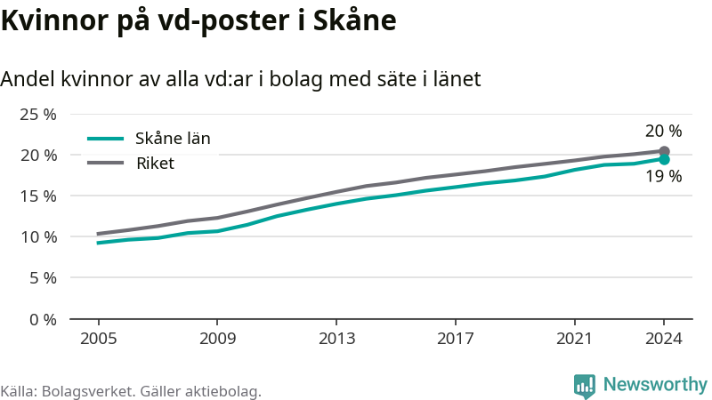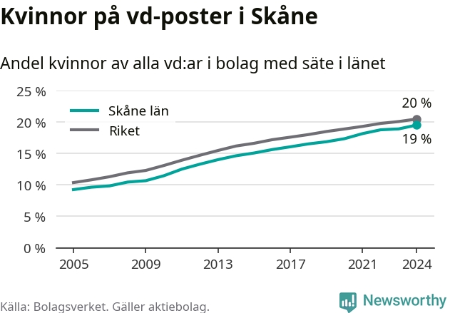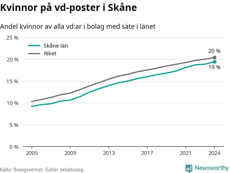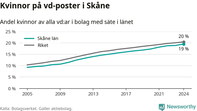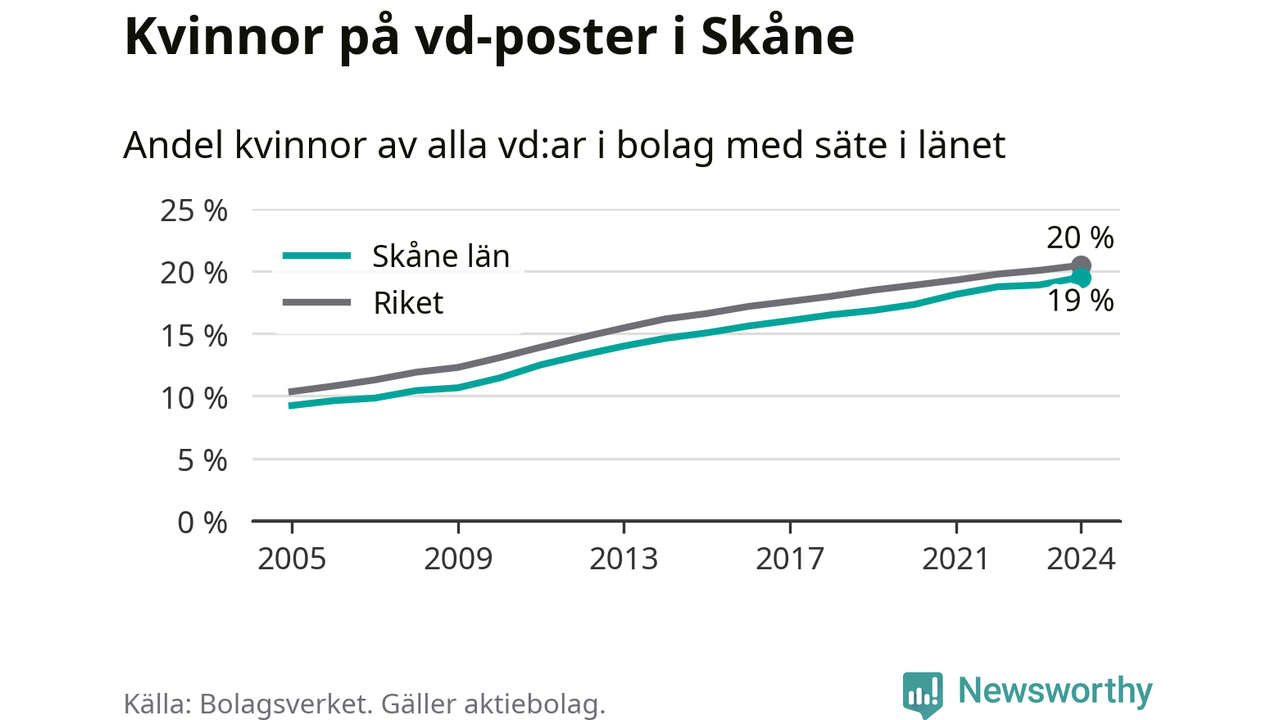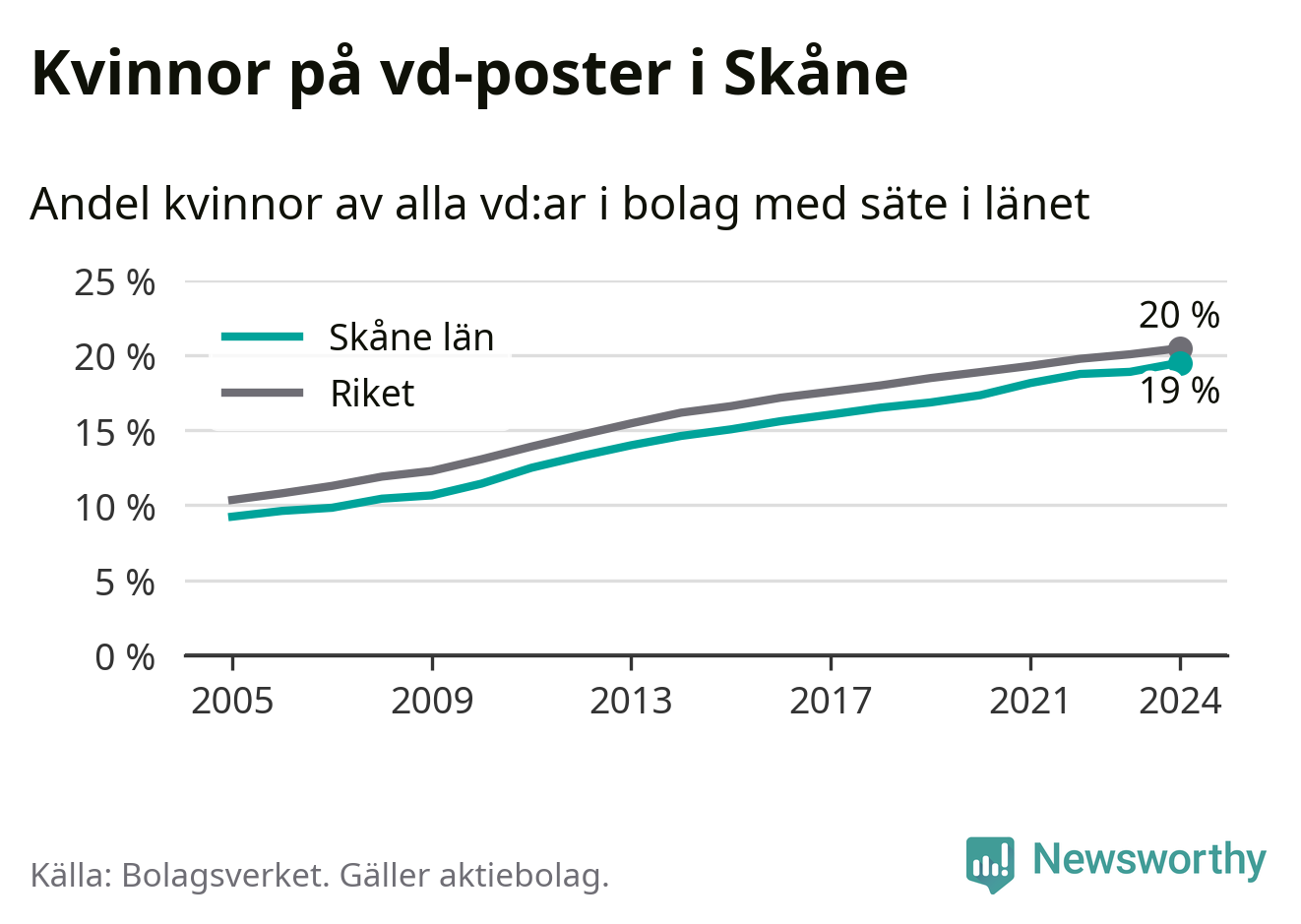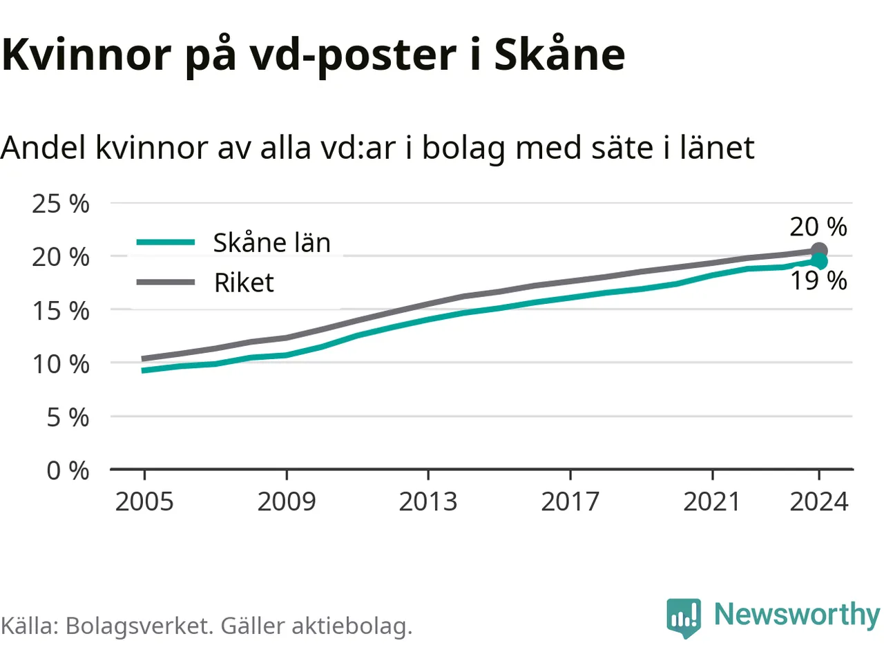 19 procent av aktiebolagen i Skåne hade en kvinna som verkställande direktör vid årsskiftet. Det innebär att på varje kvinnlig vd går fyra män. Det är ungefär lika stor andel som året innan. Andelen kvinnliga vd:ar i länet har haft en ökande trend de senaste 19 åren.