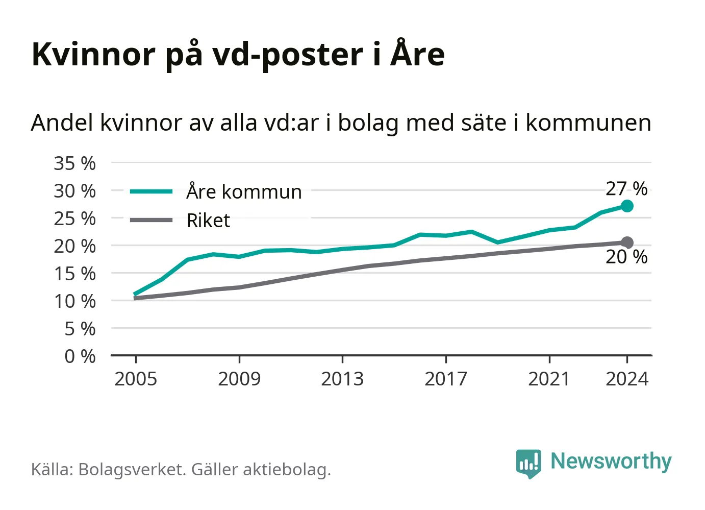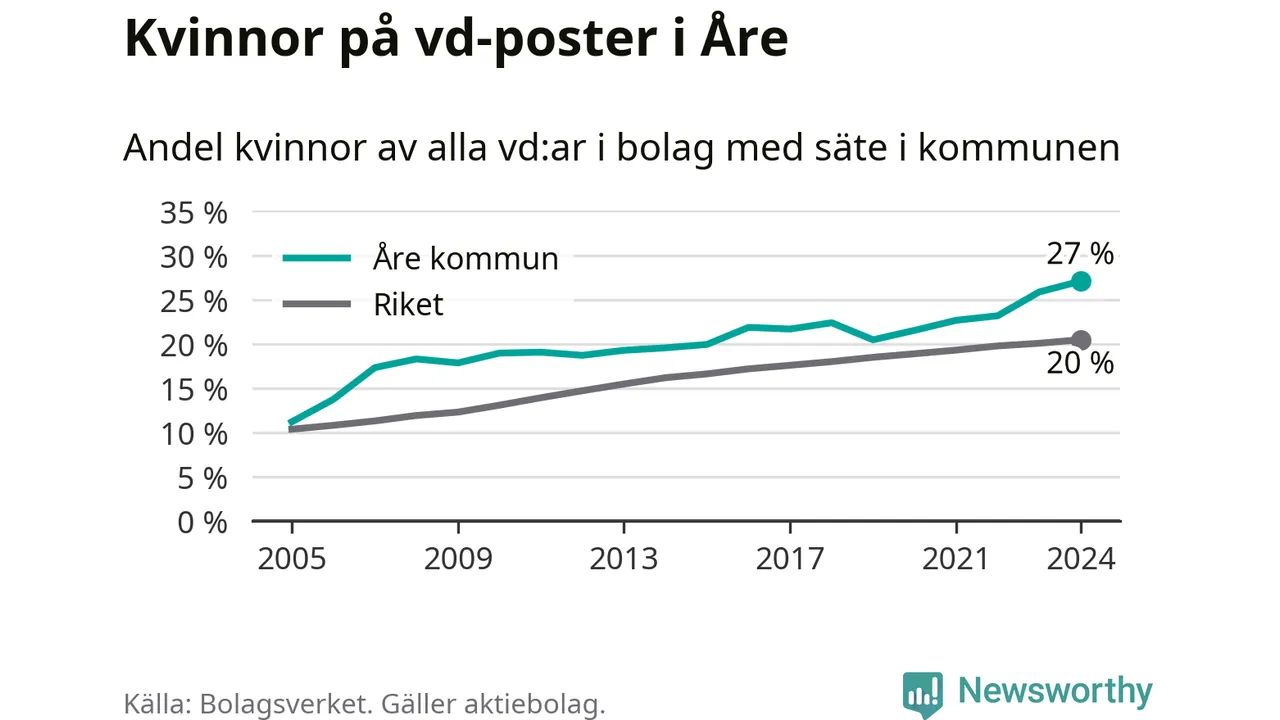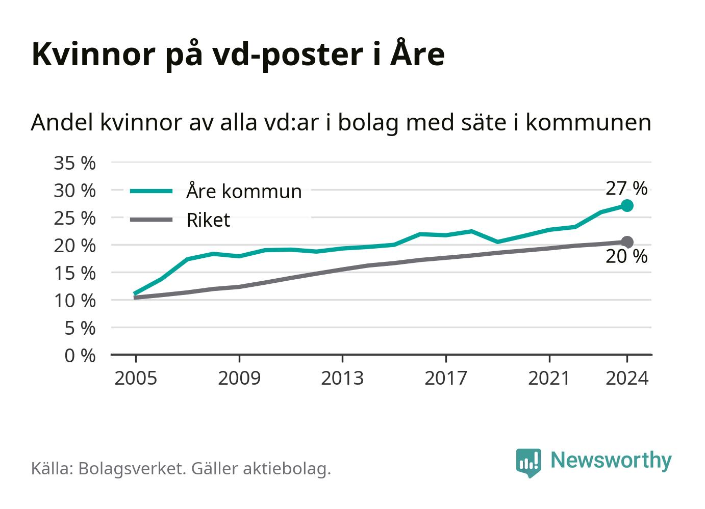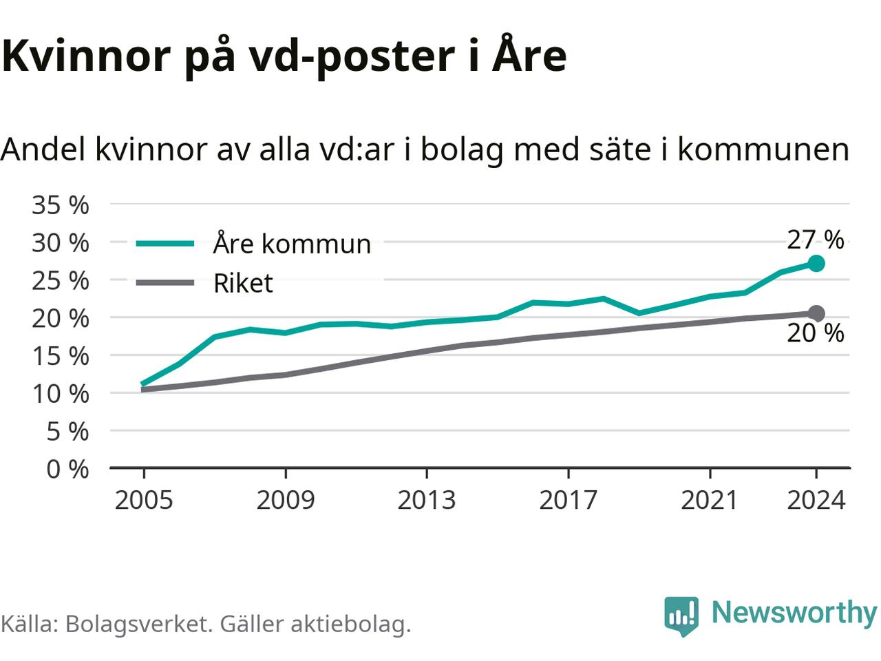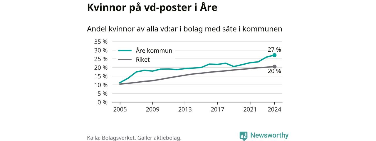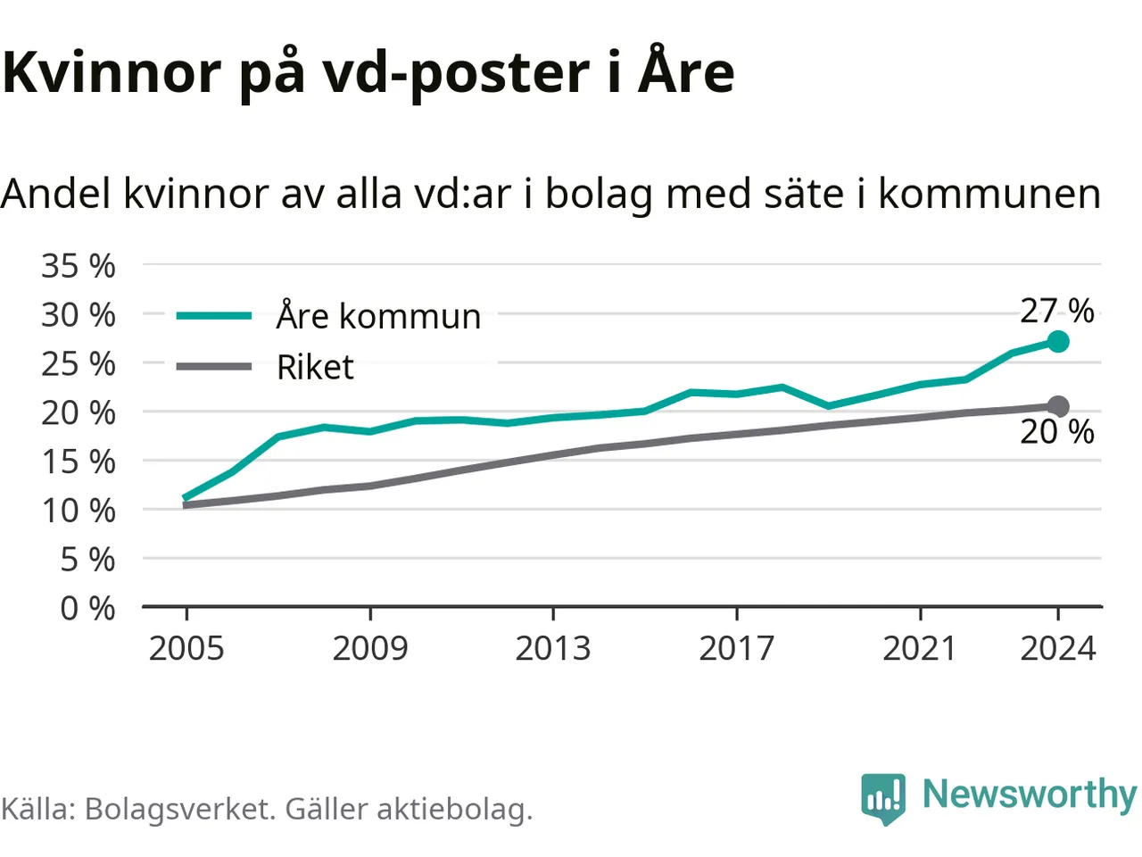27 procent av aktiebolagen i Åre hade en kvinna som verkställande direktör vid årsskiftet. Det innebär att på varje kvinnlig vd går knappt tre män. Det är ungefär lika stor andel som året innan, även om antalet vd-poster som innehas av kvinnor faktiskt ökat med elva stycken. Andelen kvinnliga vd:ar i kommunen har haft en ökande trend de senaste fem åren.