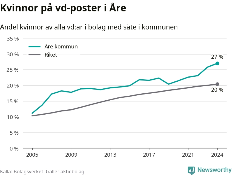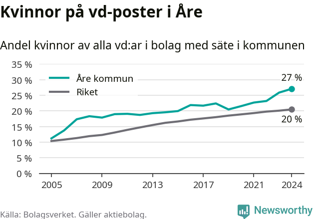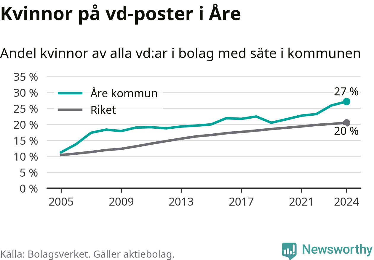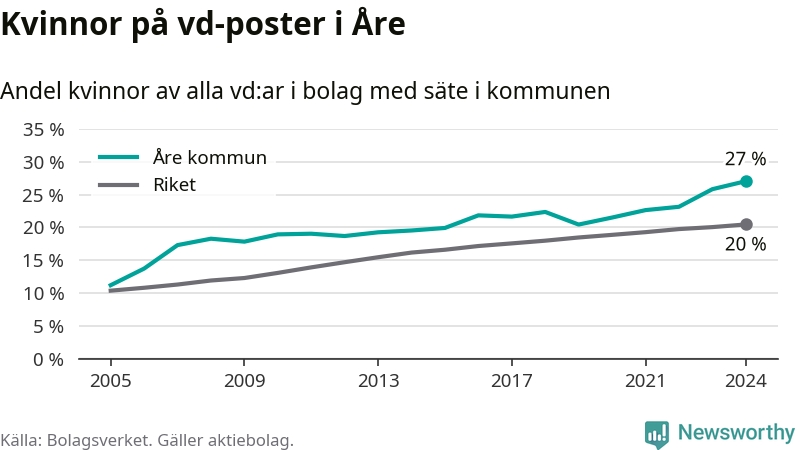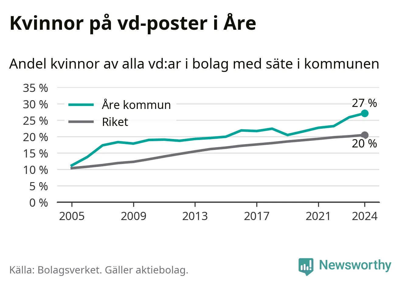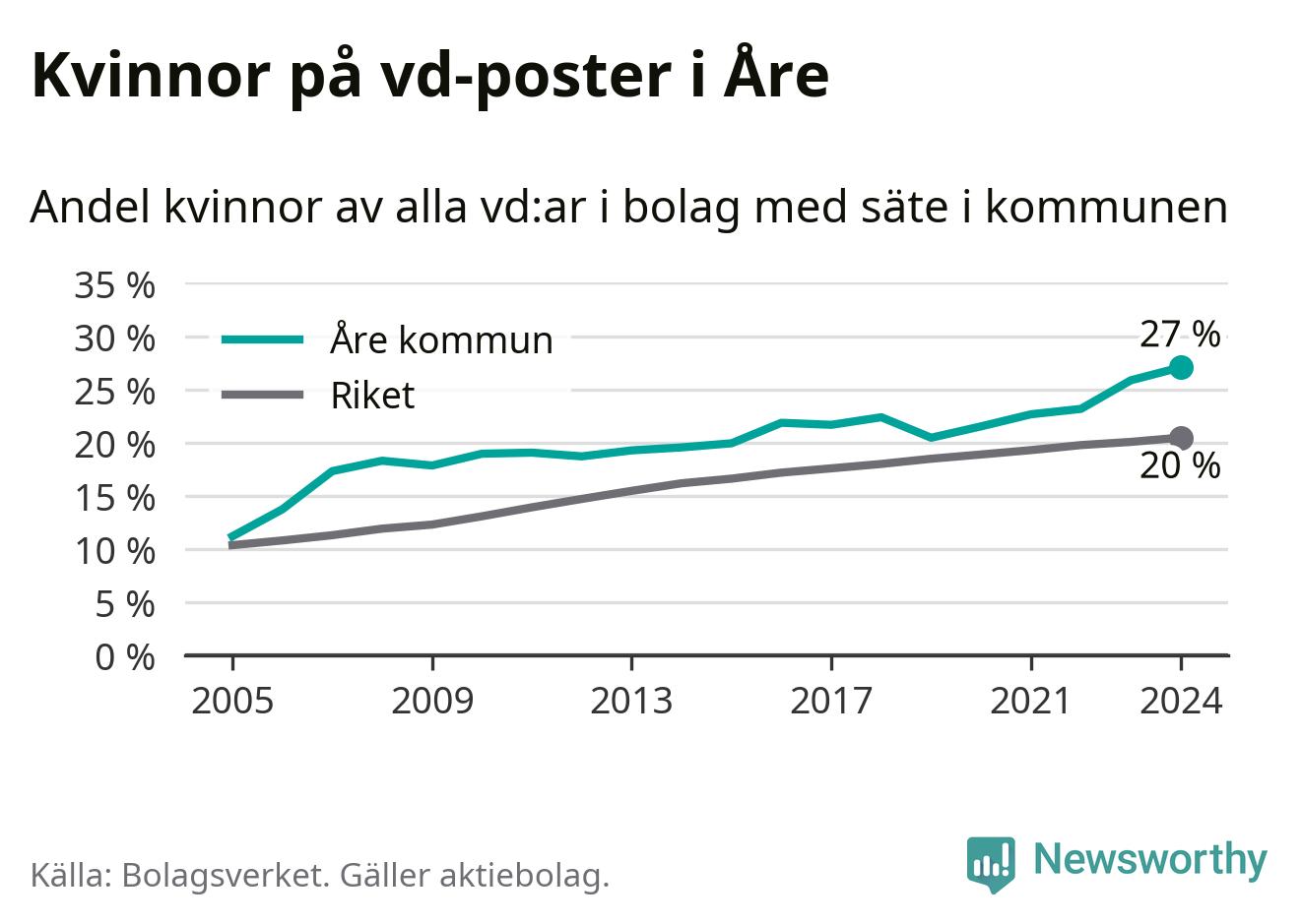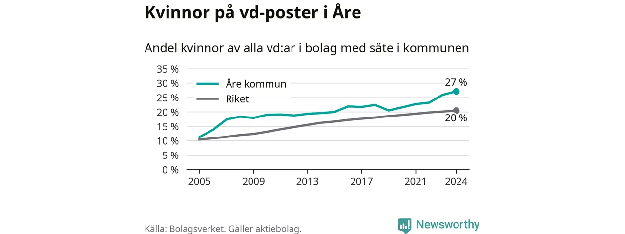 27 procent av aktiebolagen i Åre hade en kvinna som verkställande direktör vid årsskiftet. Det innebär att på varje kvinnlig vd går knappt tre män. Det är ungefär lika stor andel som året innan, även om antalet vd-poster som innehas av kvinnor faktiskt ökat med elva stycken. Andelen kvinnliga vd:ar i kommunen har haft en ökande trend de senaste fem åren.