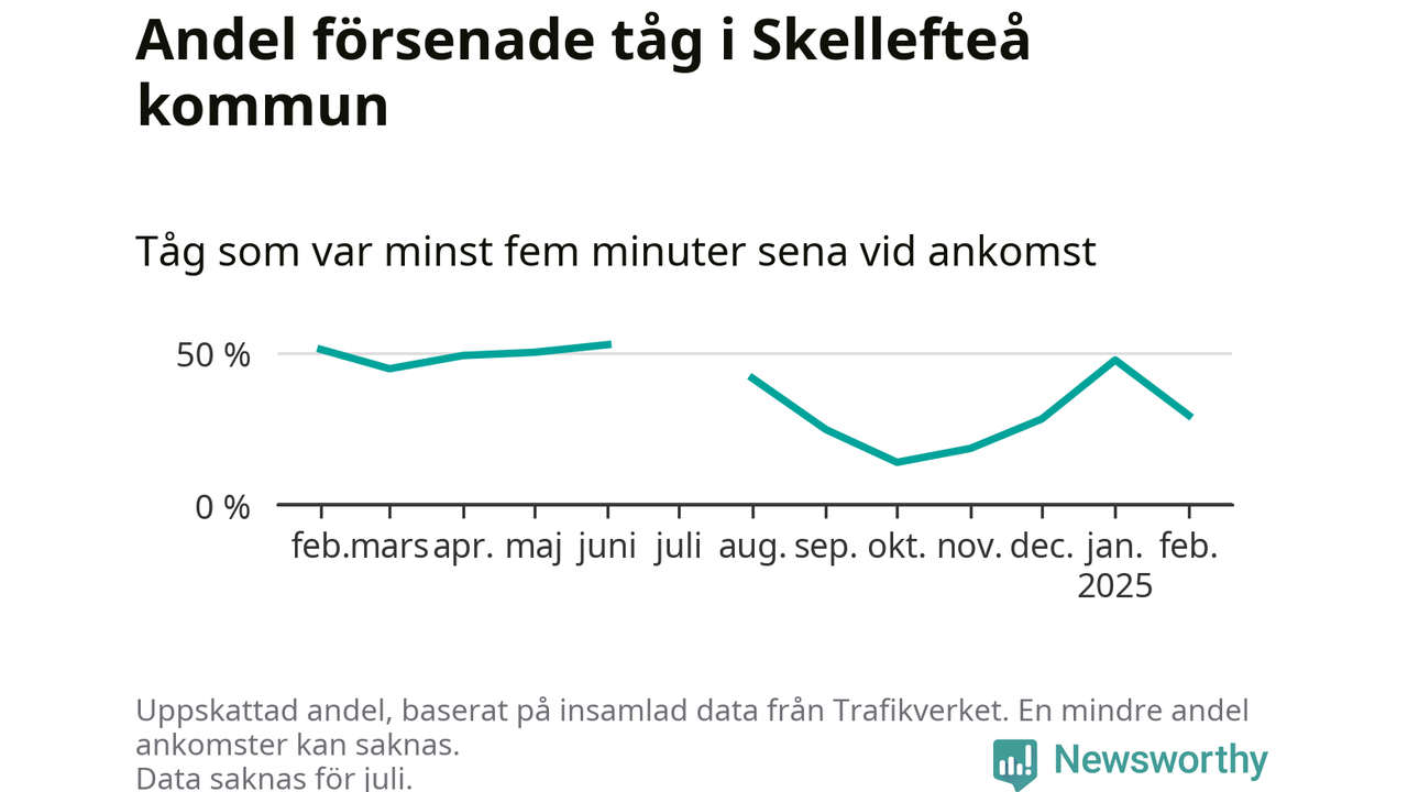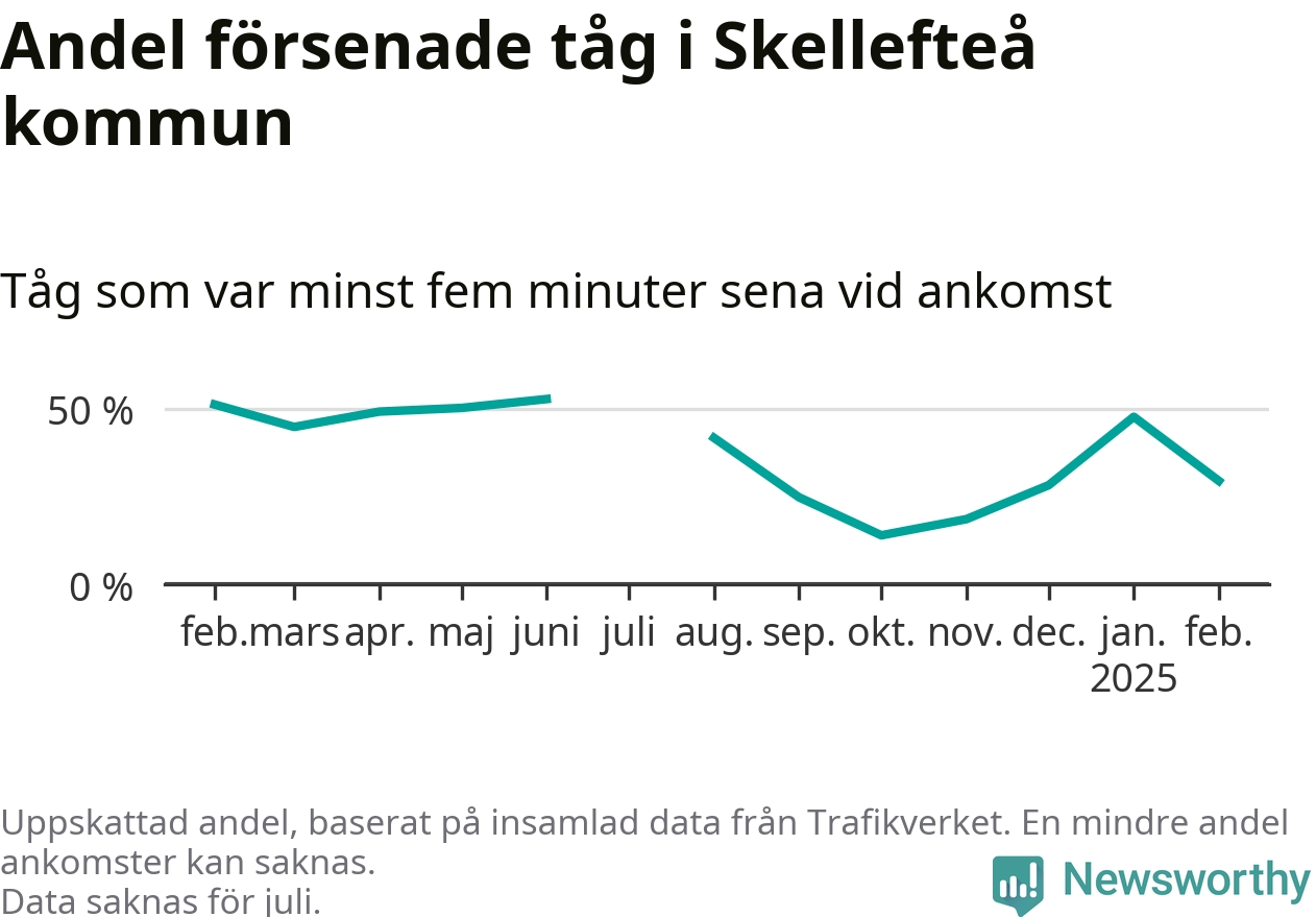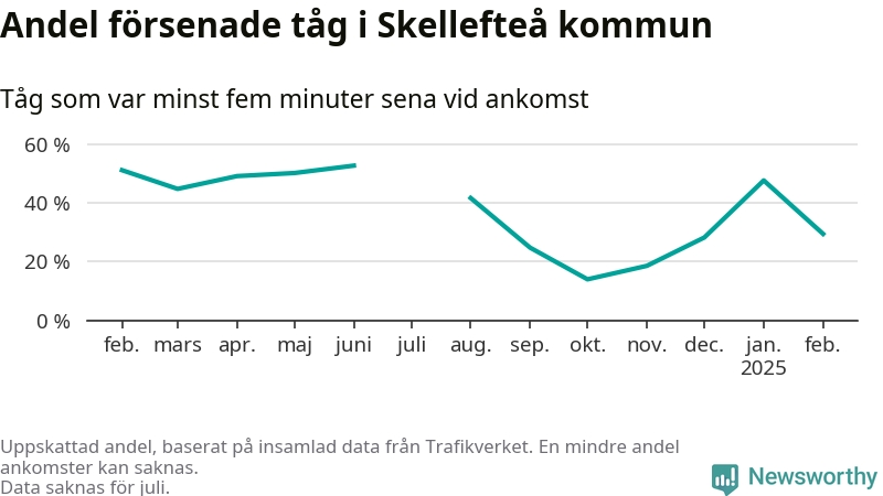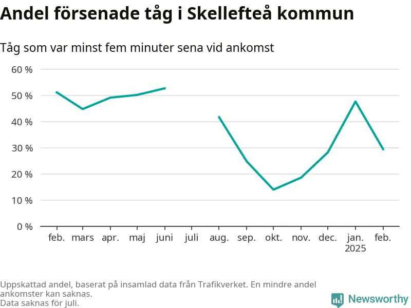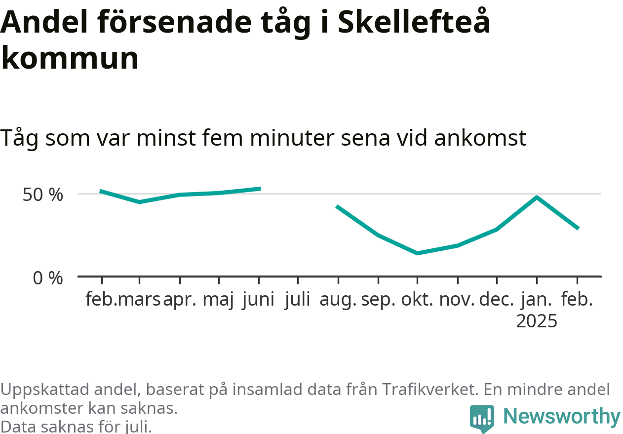 Totalt var 29 procent av de ankommande tågen vid Jörns station mer än fem minuter försenade under februari. Motsvarande siffra i februari förra året var 51,2 procent.
