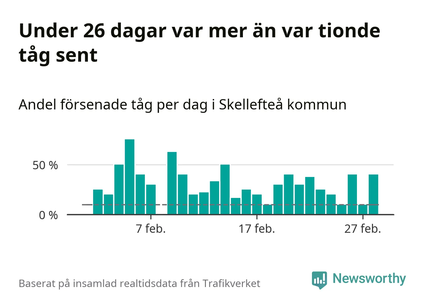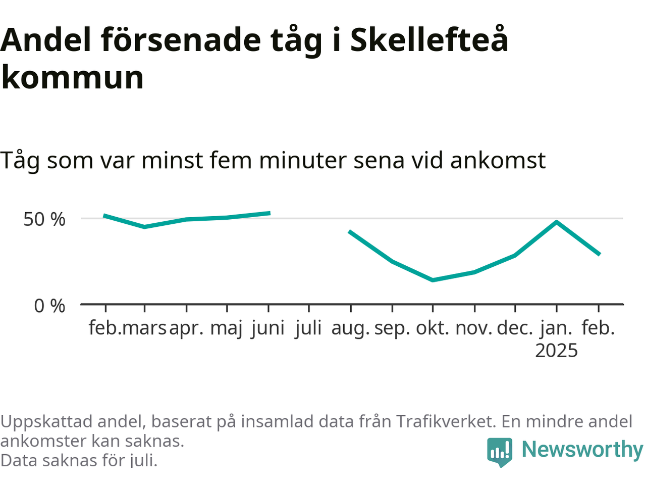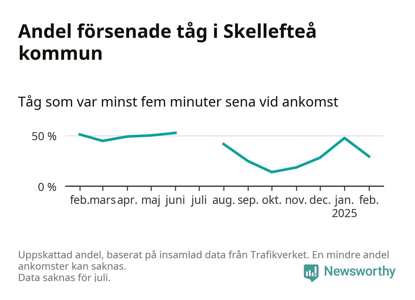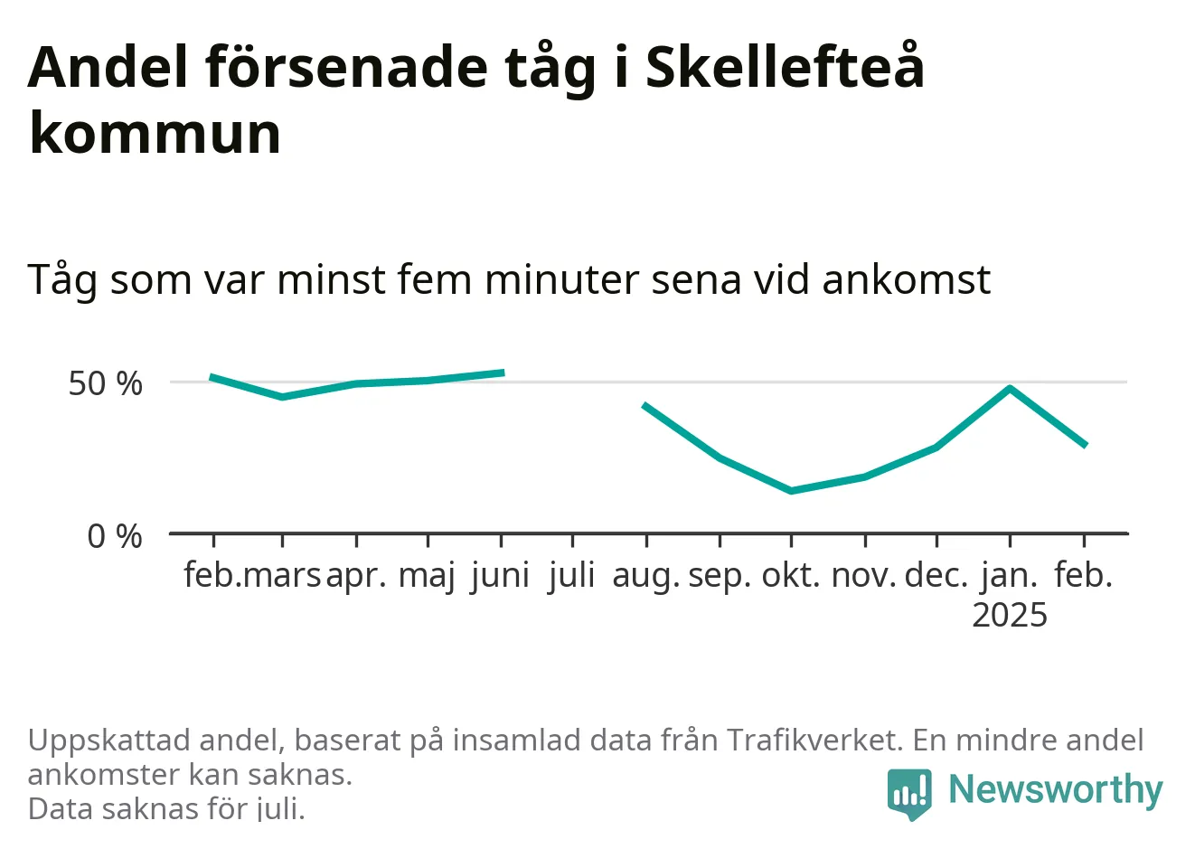 Totalt var 29 procent av de ankommande tågen vid Jörns station mer än fem minuter försenade under februari. Motsvarande siffra i februari förra året var 51,2 procent.