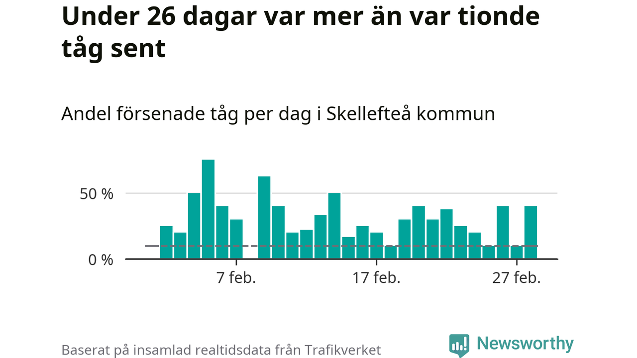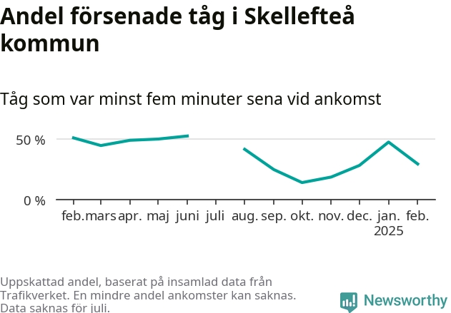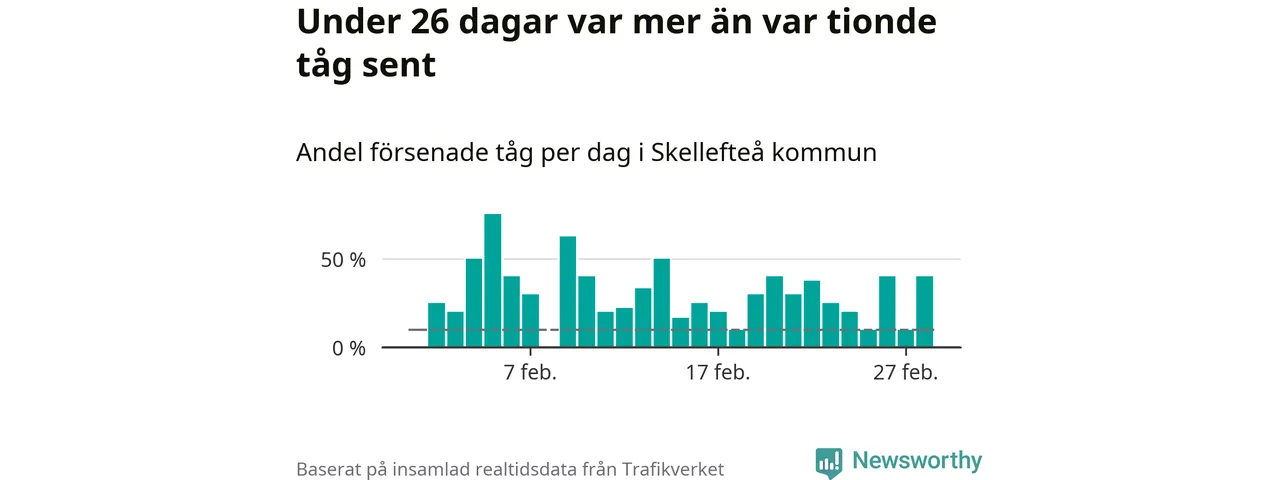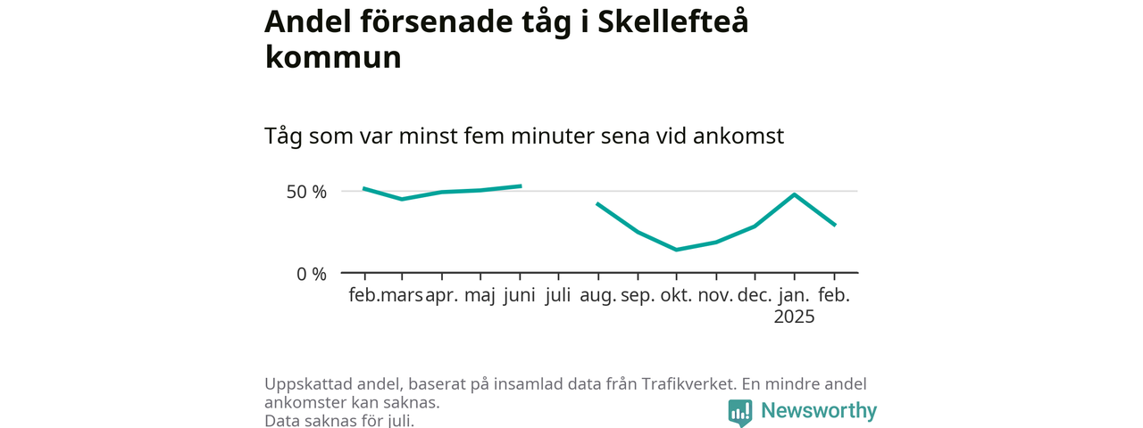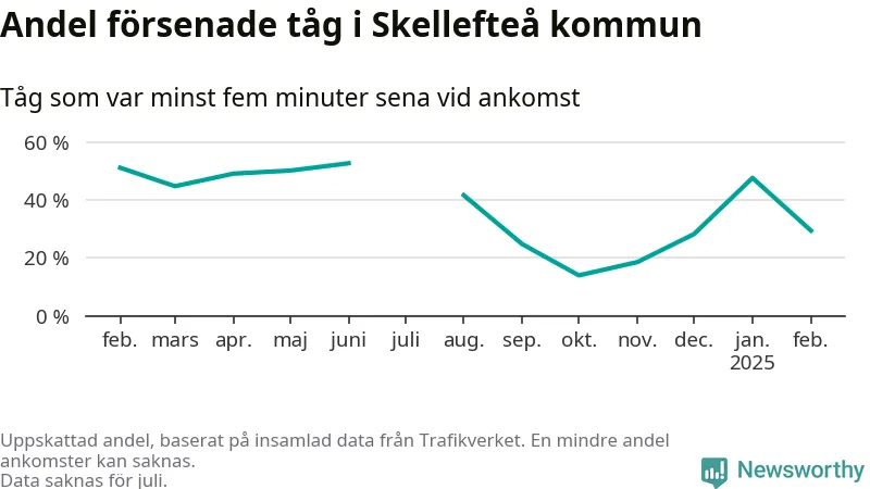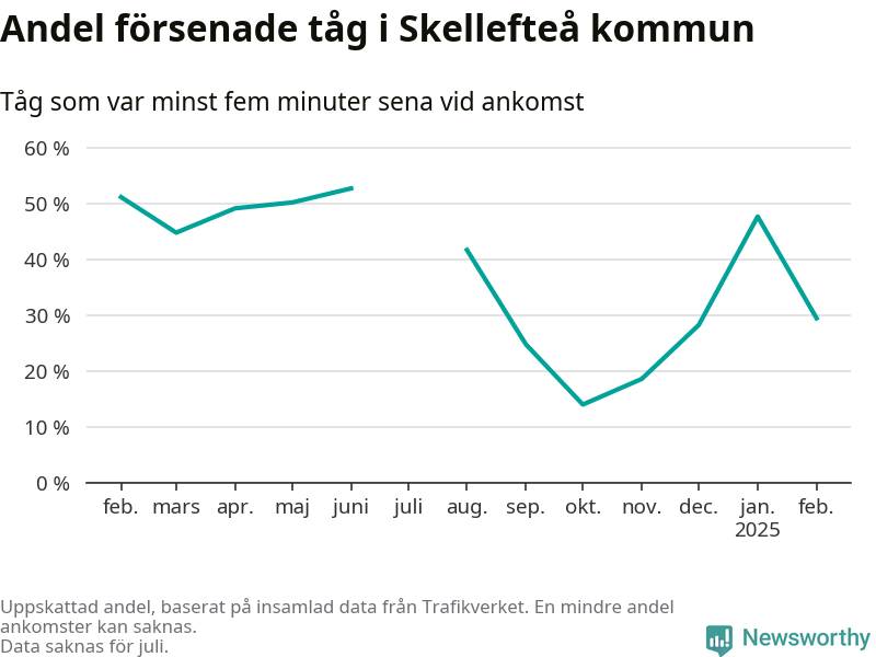 De knappt 300 tåg vi samlat ankomsttider för när de passerade1 Skellefteå kommun under månaden var sammanlagt 62 timmar och 40 minuter sena – i genomsnitt 14 minuter och 34 sekunder per tåg.