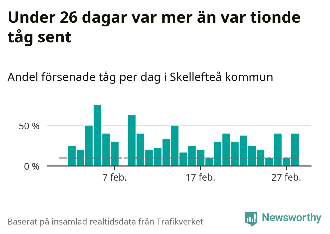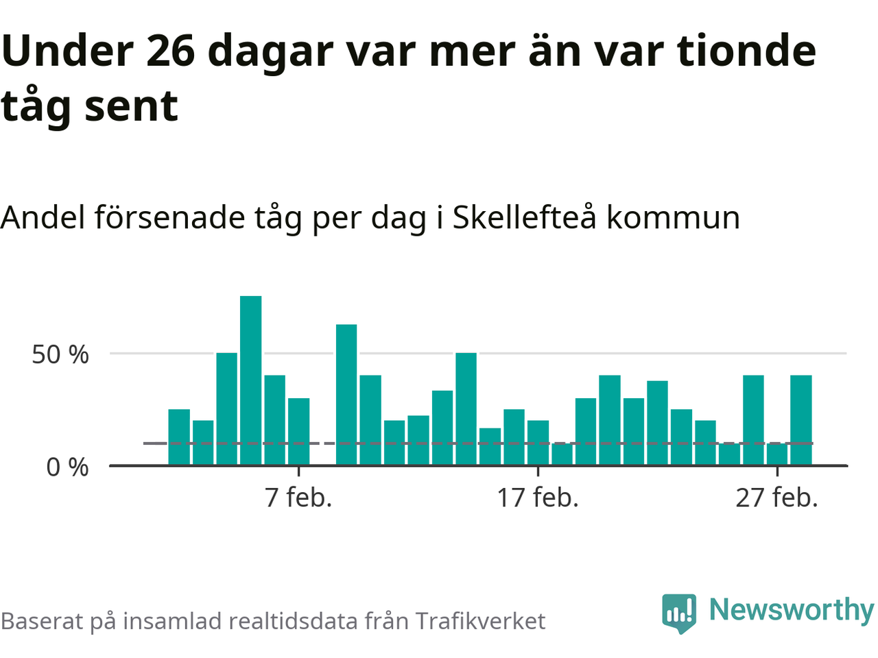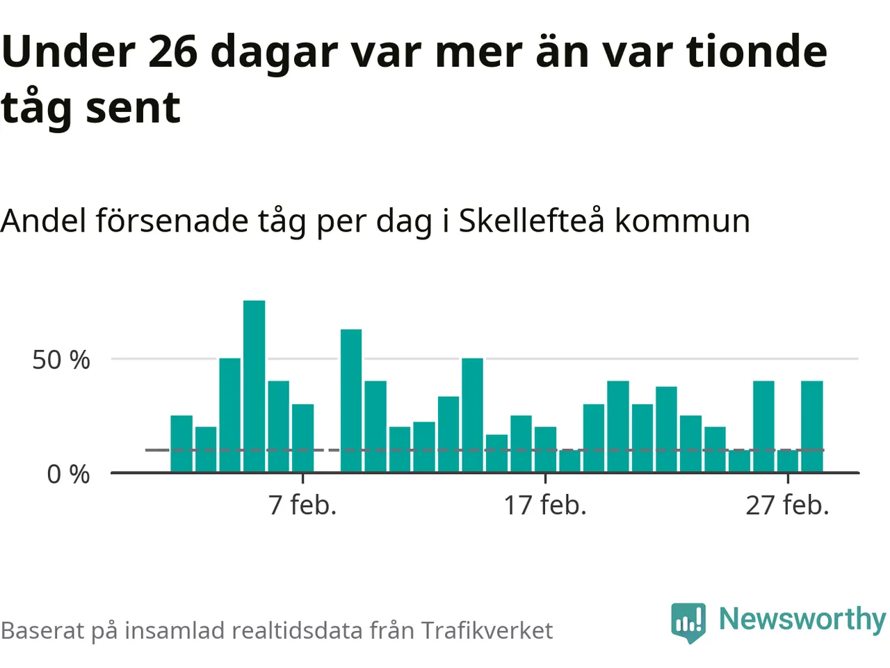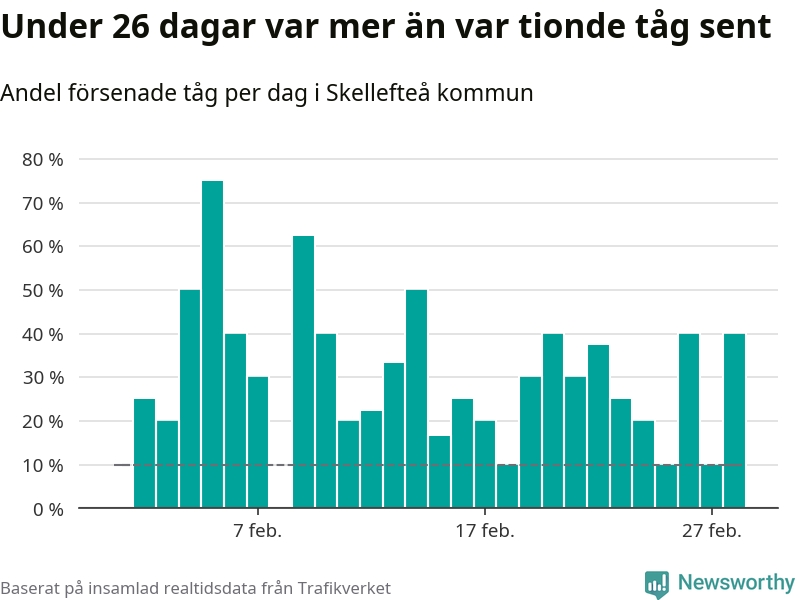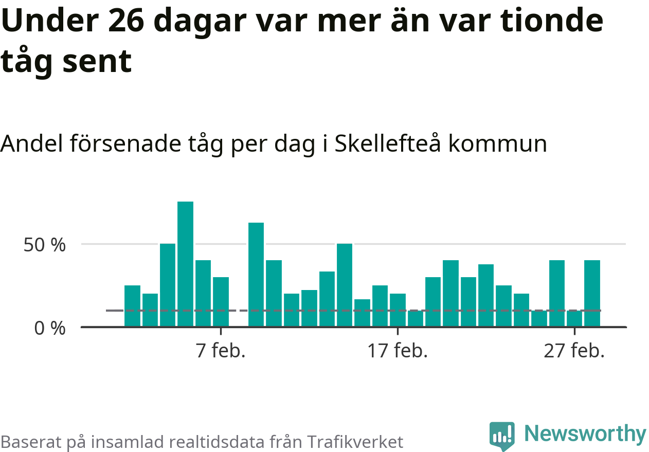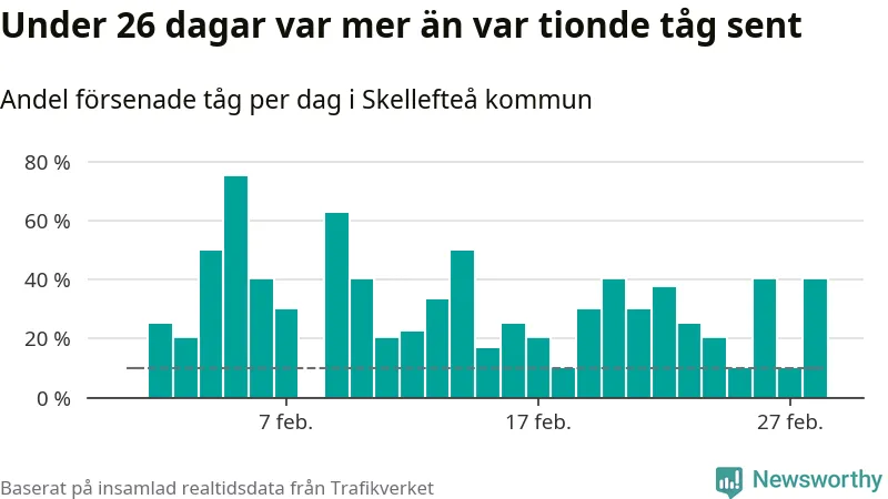 Dagen med flest sena tåg var måndag den 5 februari, när 75 procent av tågen var mer än fem minuter försenade. Under 26 dagar var mer än var tionde tåg sent.