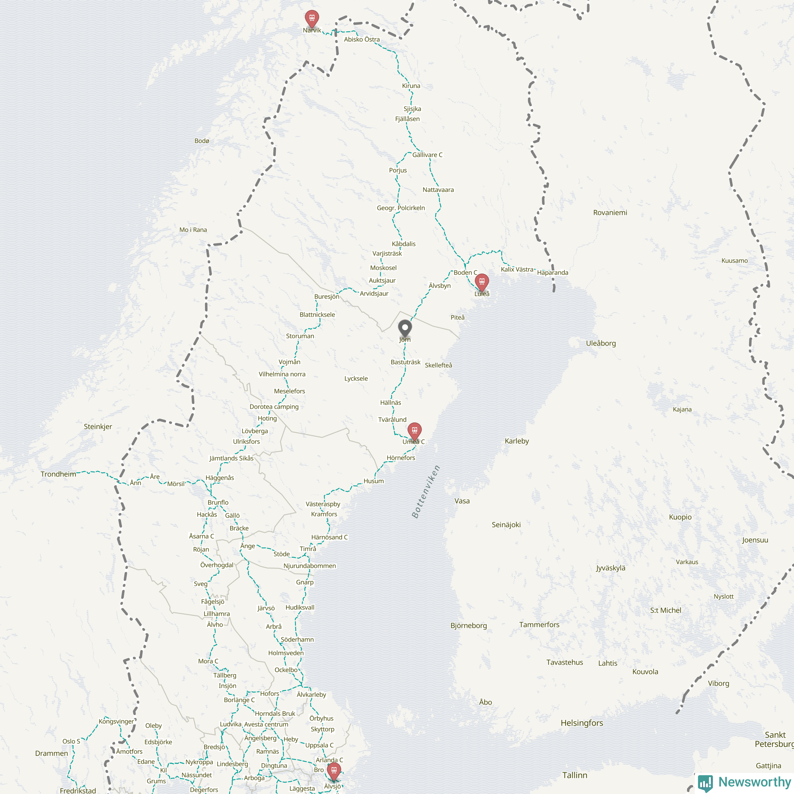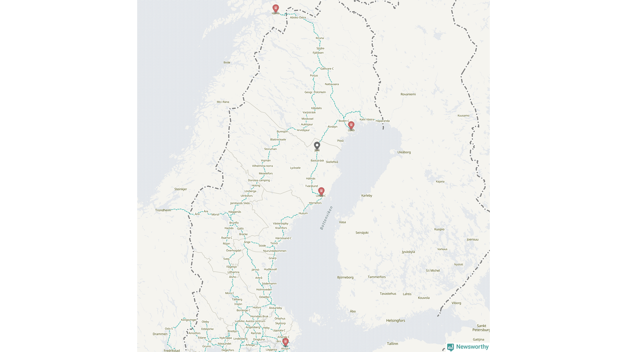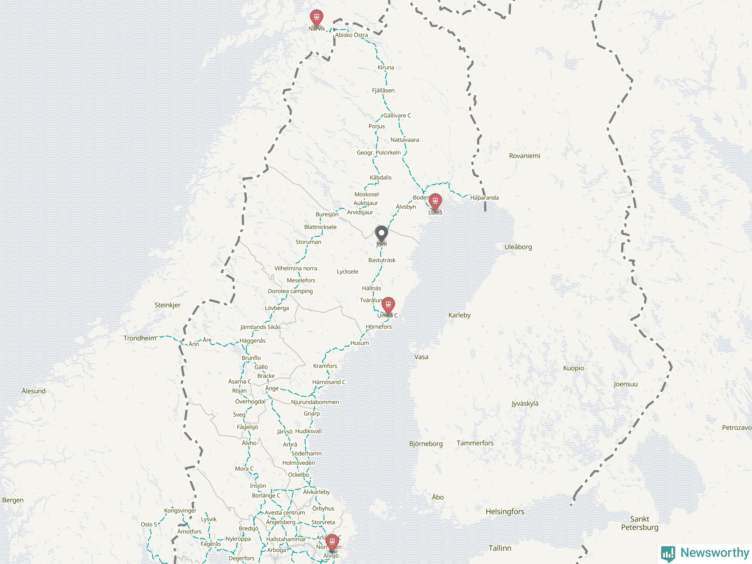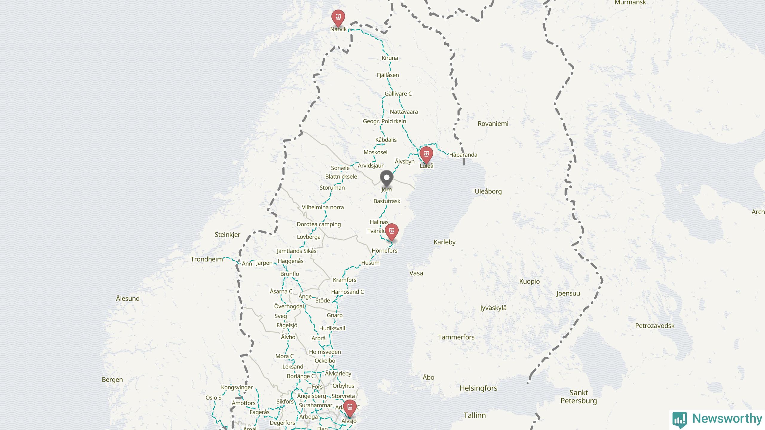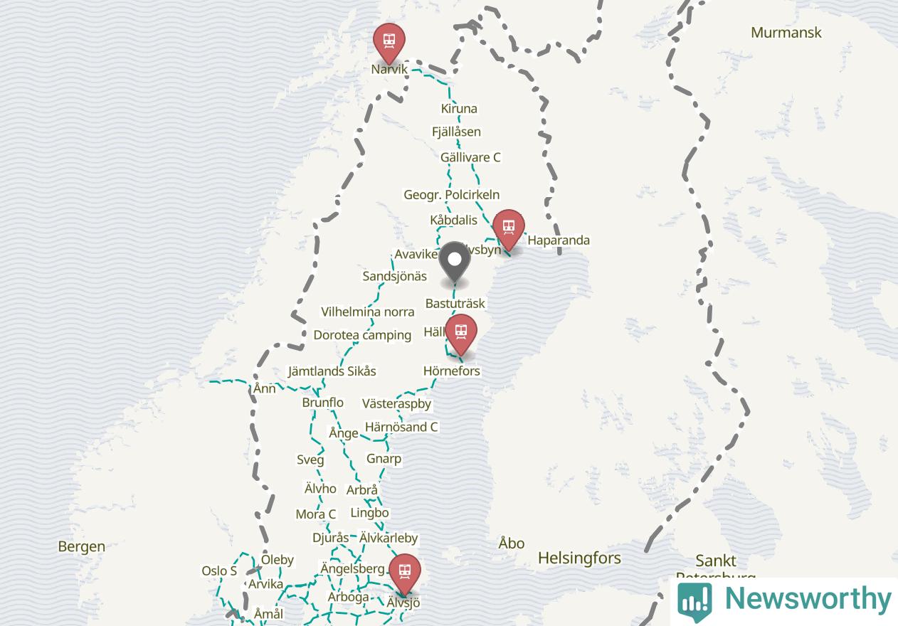 Kartdata från Mapbox, Newsworthy, OpenStreetMap och Trafikverket. Uppgifter om sträckor med passagerartrafik från jarnvag.net.