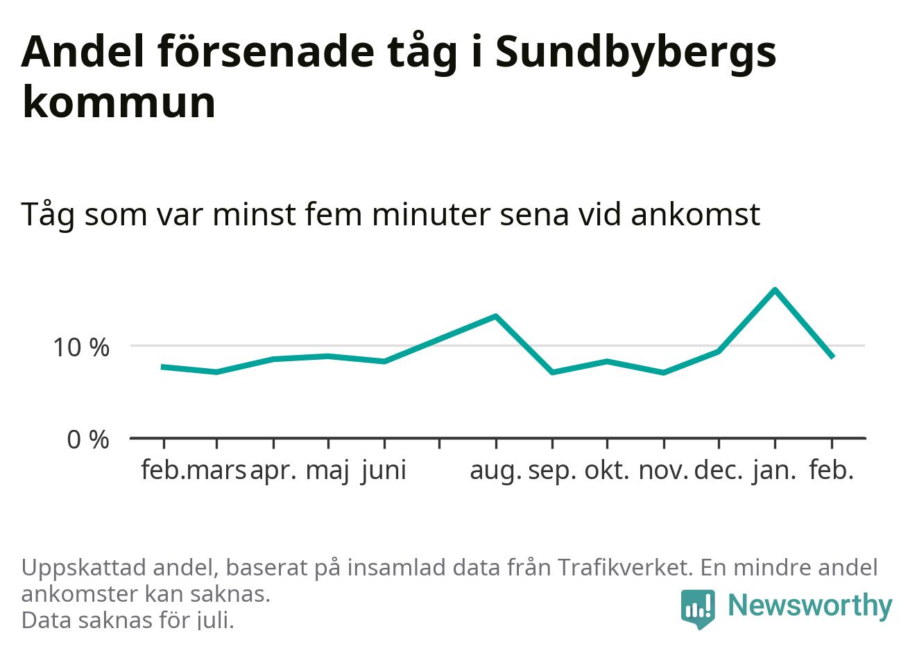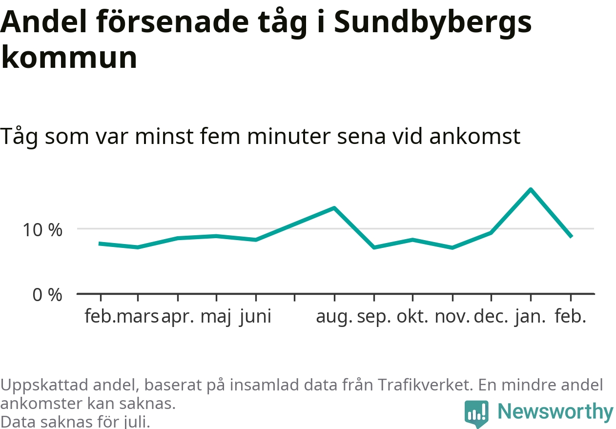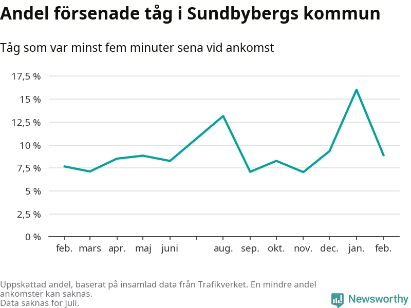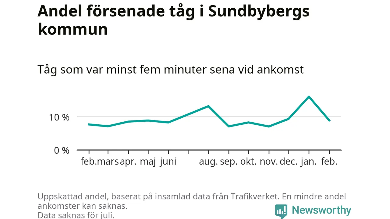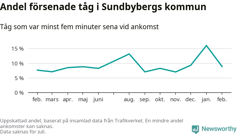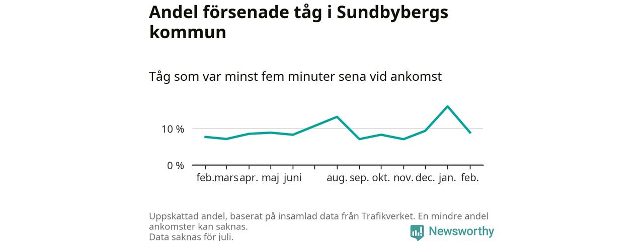 Totalt var nio procent av de ankommande tågen vid Sundbybergs station mer än fem minuter försenade under februari. Motsvarande siffra i februari förra året var 7,7 procent.