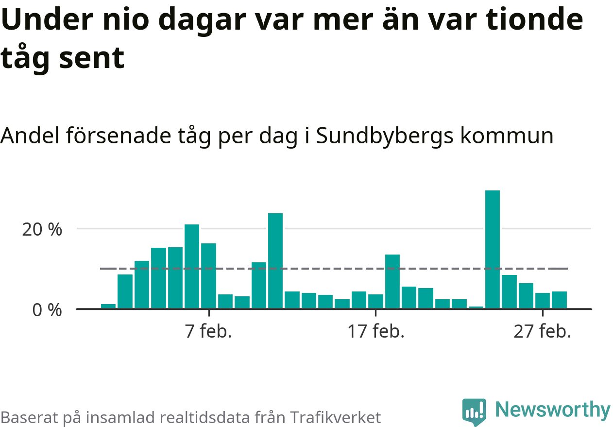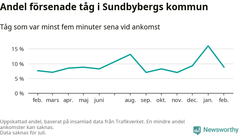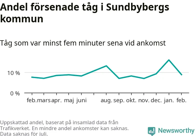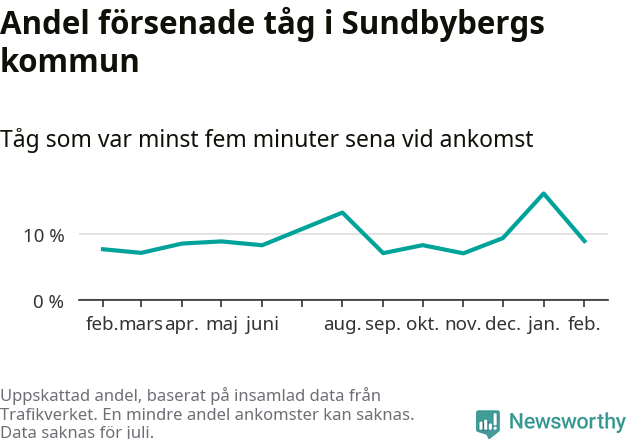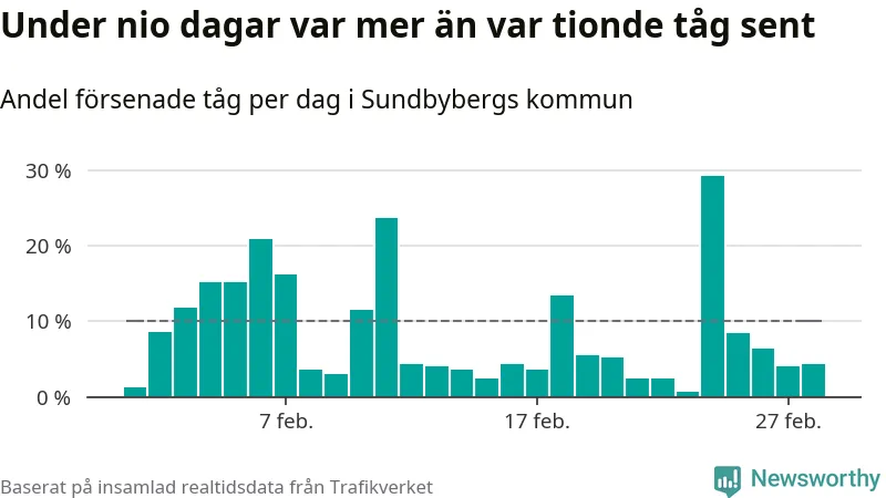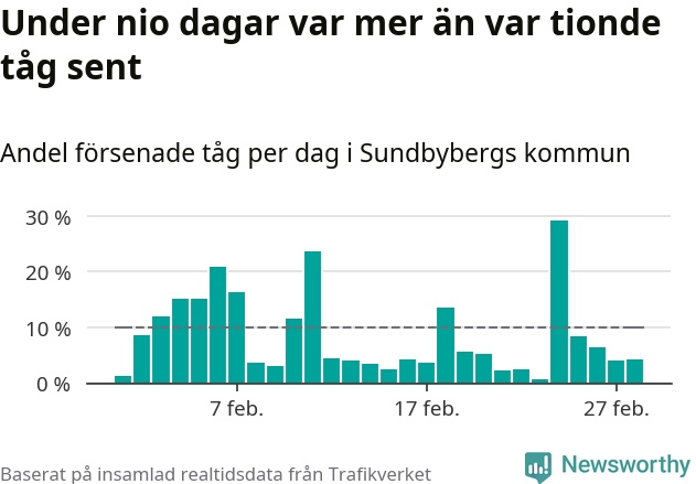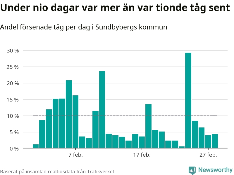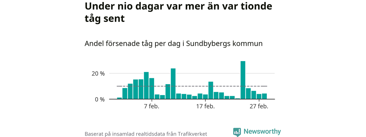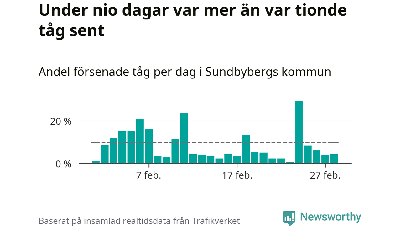 Den svenska tågtrafiken är långt från det branchgemensamma målet att 95 procent av tågen ska komma fram i tid. Newsworthy har samlat in tågens ankomsttider under februari, för att se hur stor andel av tågen till Sundbybergs kommun som var i tid under den senaste månaden.