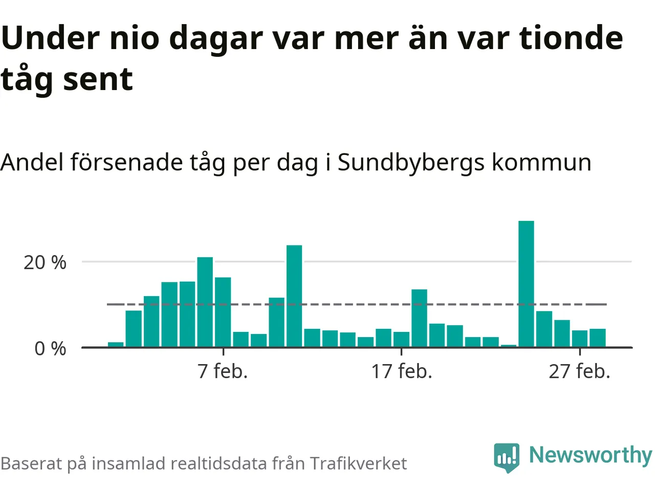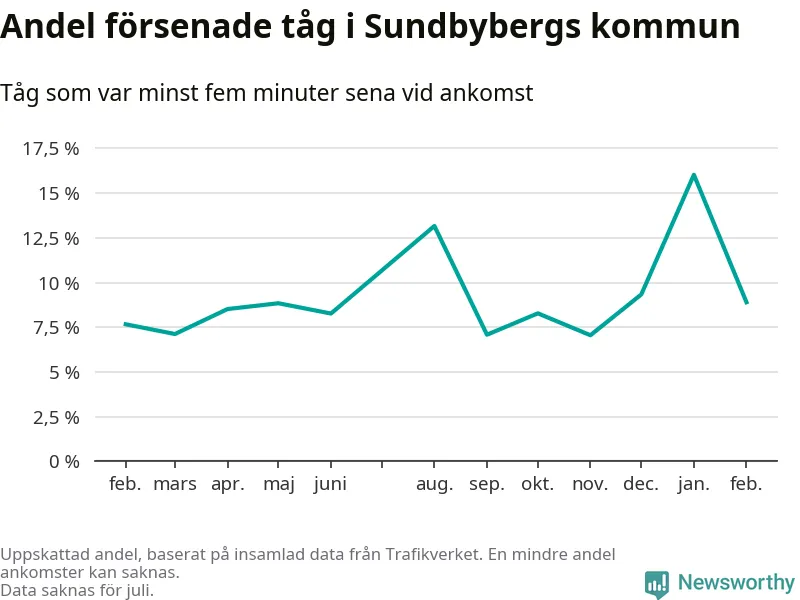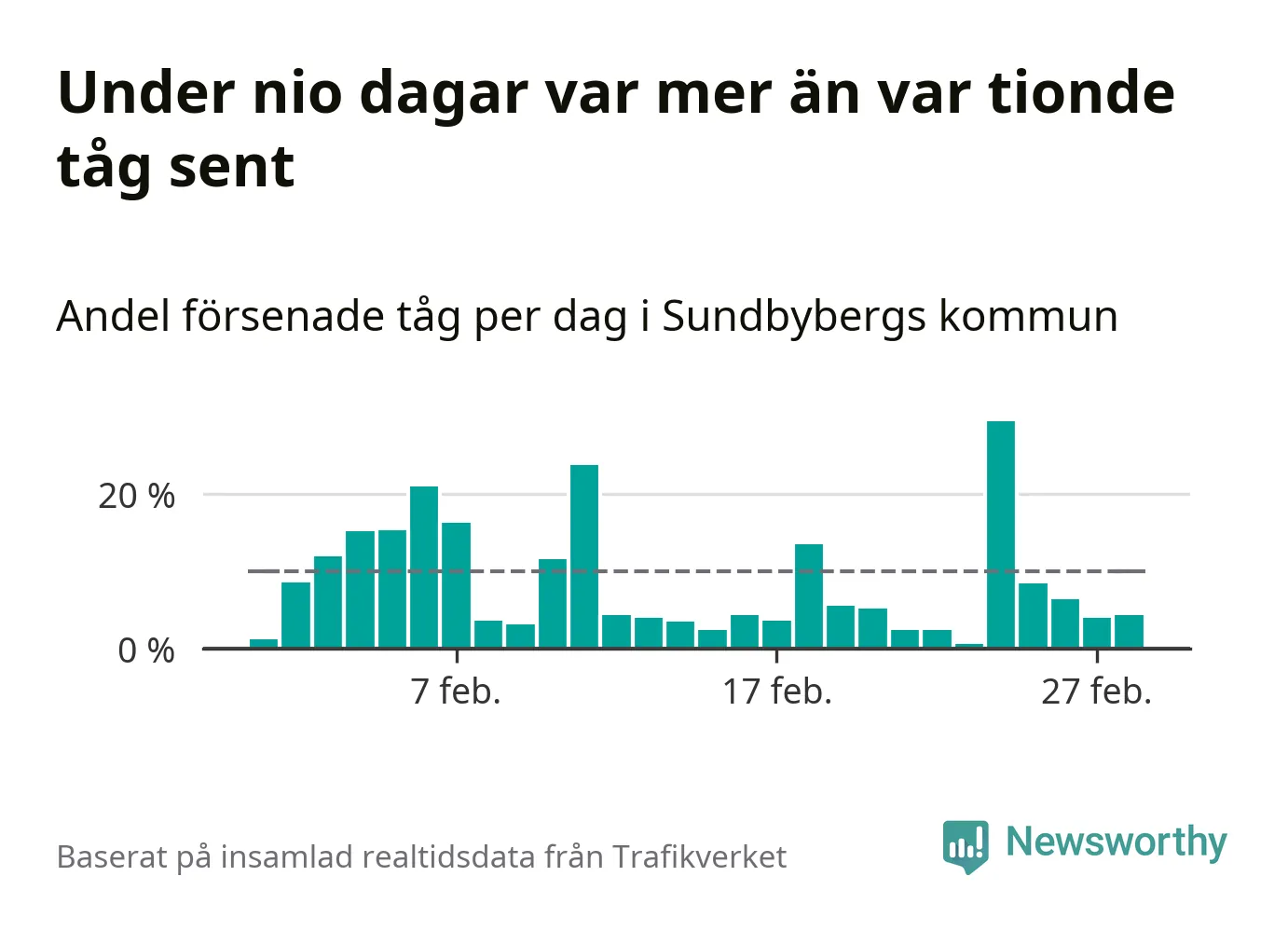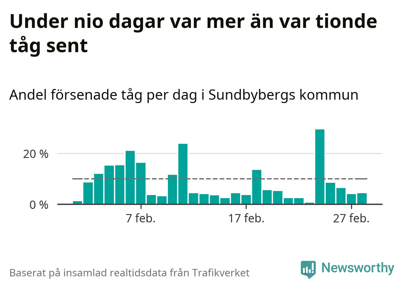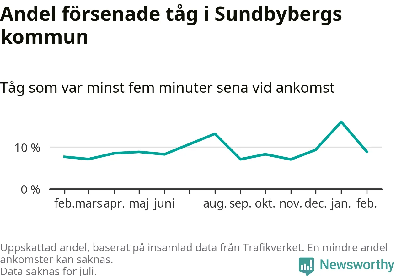 Den svenska tågtrafiken är långt från det branchgemensamma målet att 95 procent av tågen ska komma fram i tid. Newsworthy har samlat in tågens ankomsttider under februari, för att se hur stor andel av tågen till Sundbybergs kommun som var i tid under den senaste månaden.