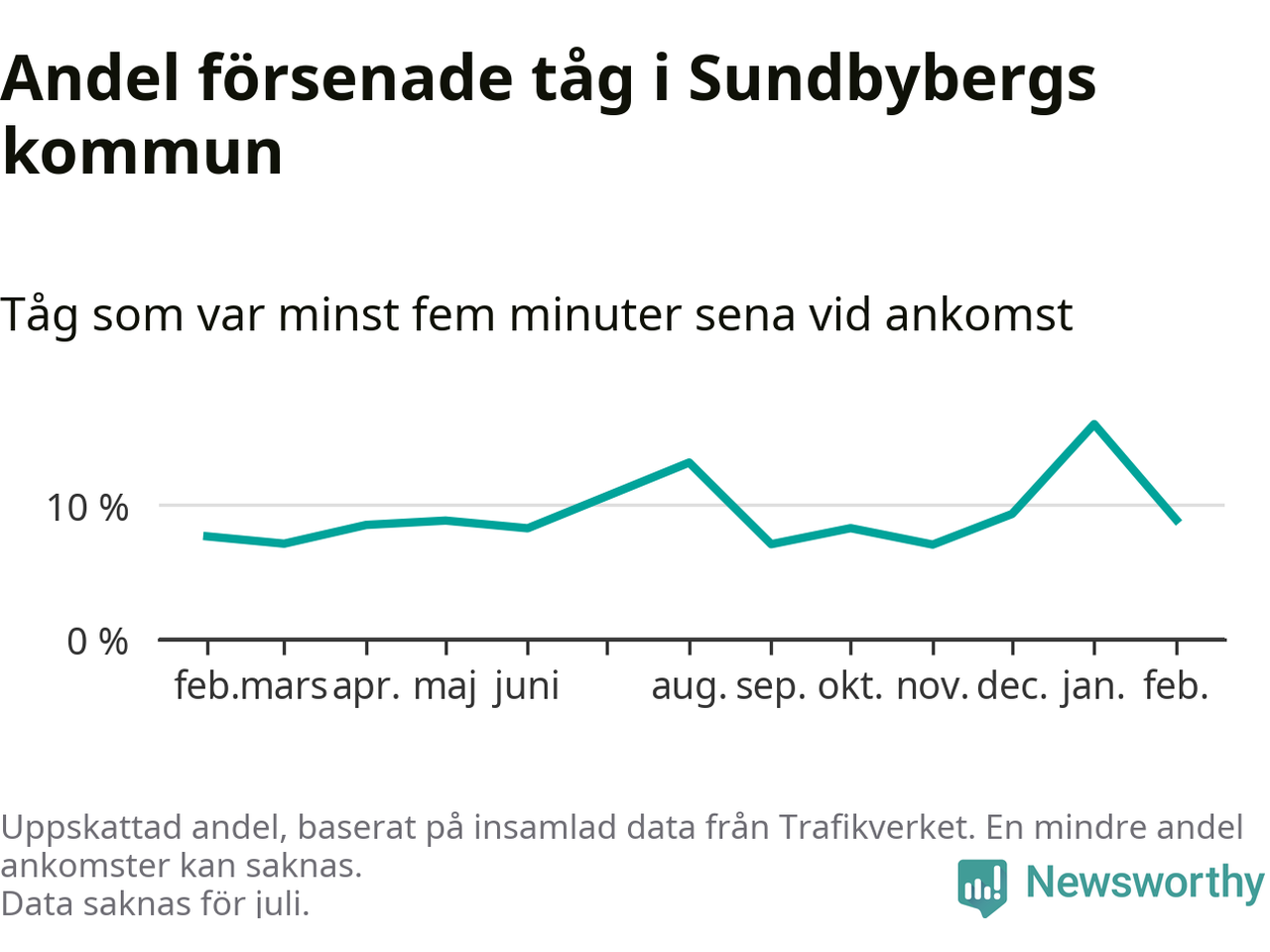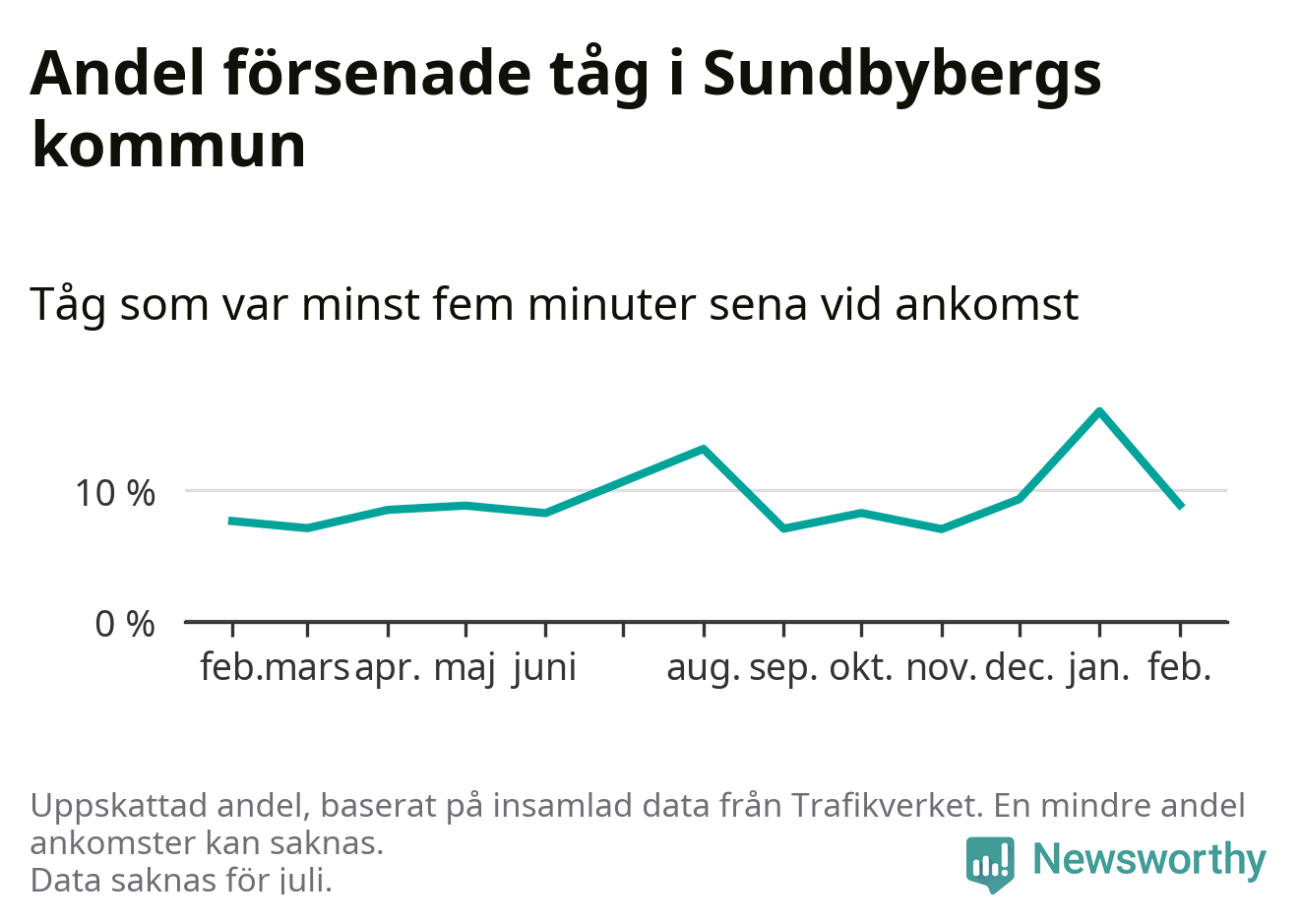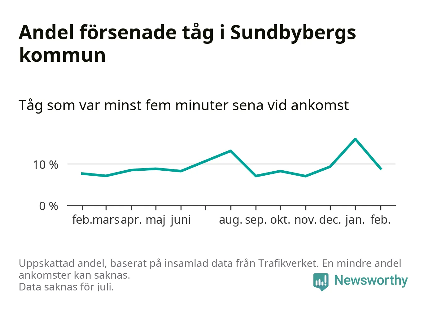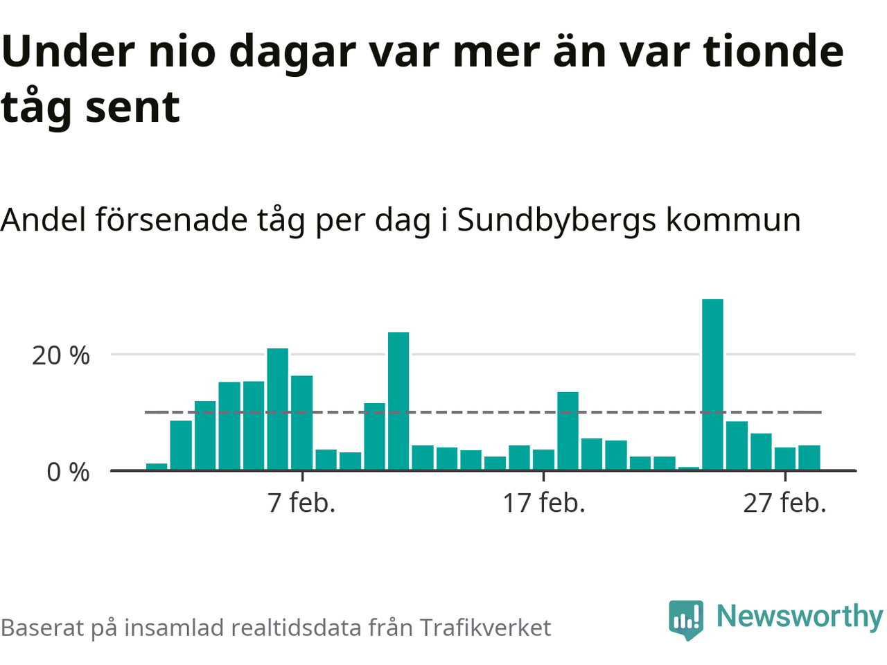 Den svenska tågtrafiken är långt från det branchgemensamma målet att 95 procent av tågen ska komma fram i tid. Newsworthy har samlat in tågens ankomsttider under februari, för att se hur stor andel av tågen till Sundbybergs kommun som var i tid under den senaste månaden.
