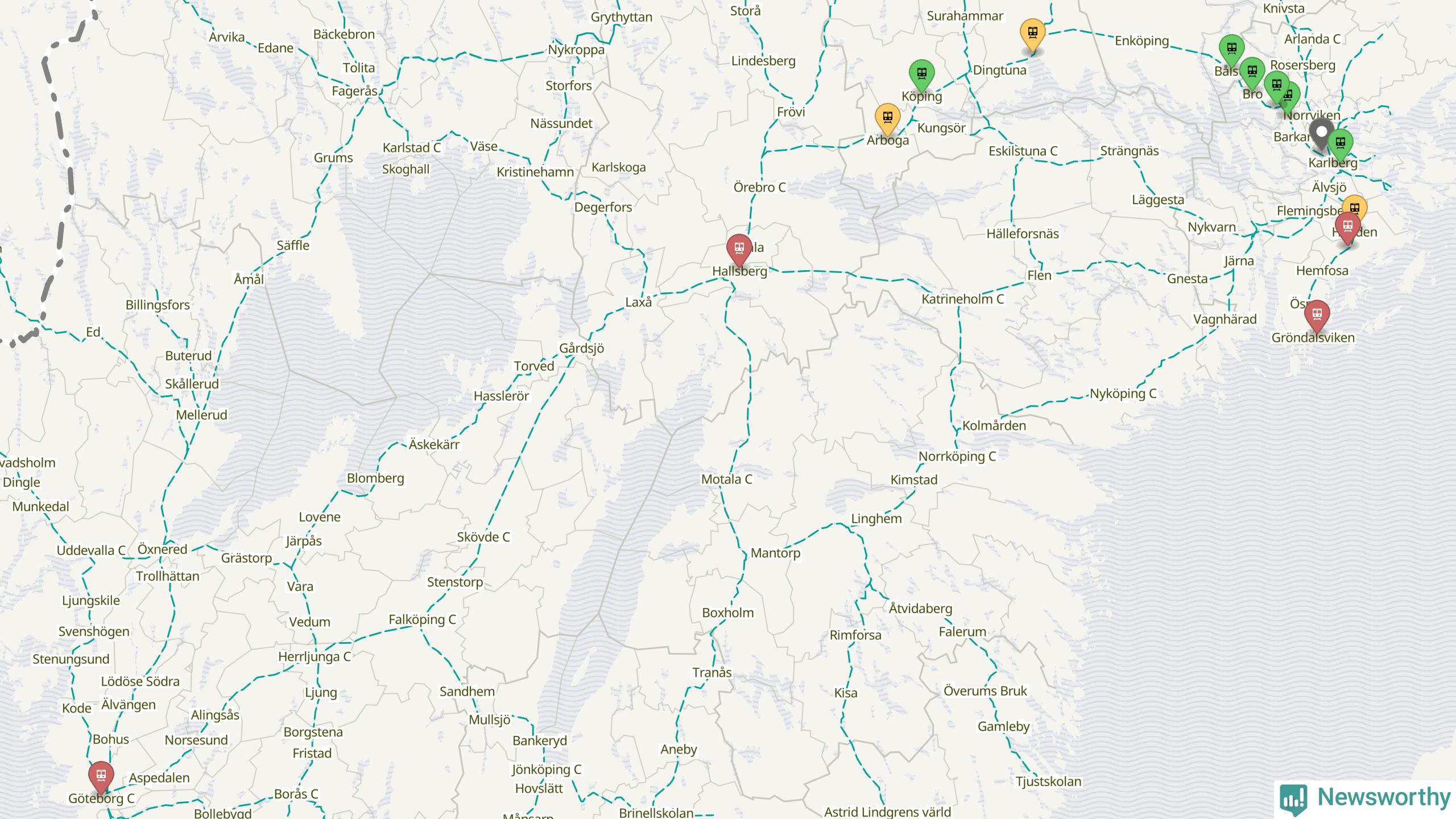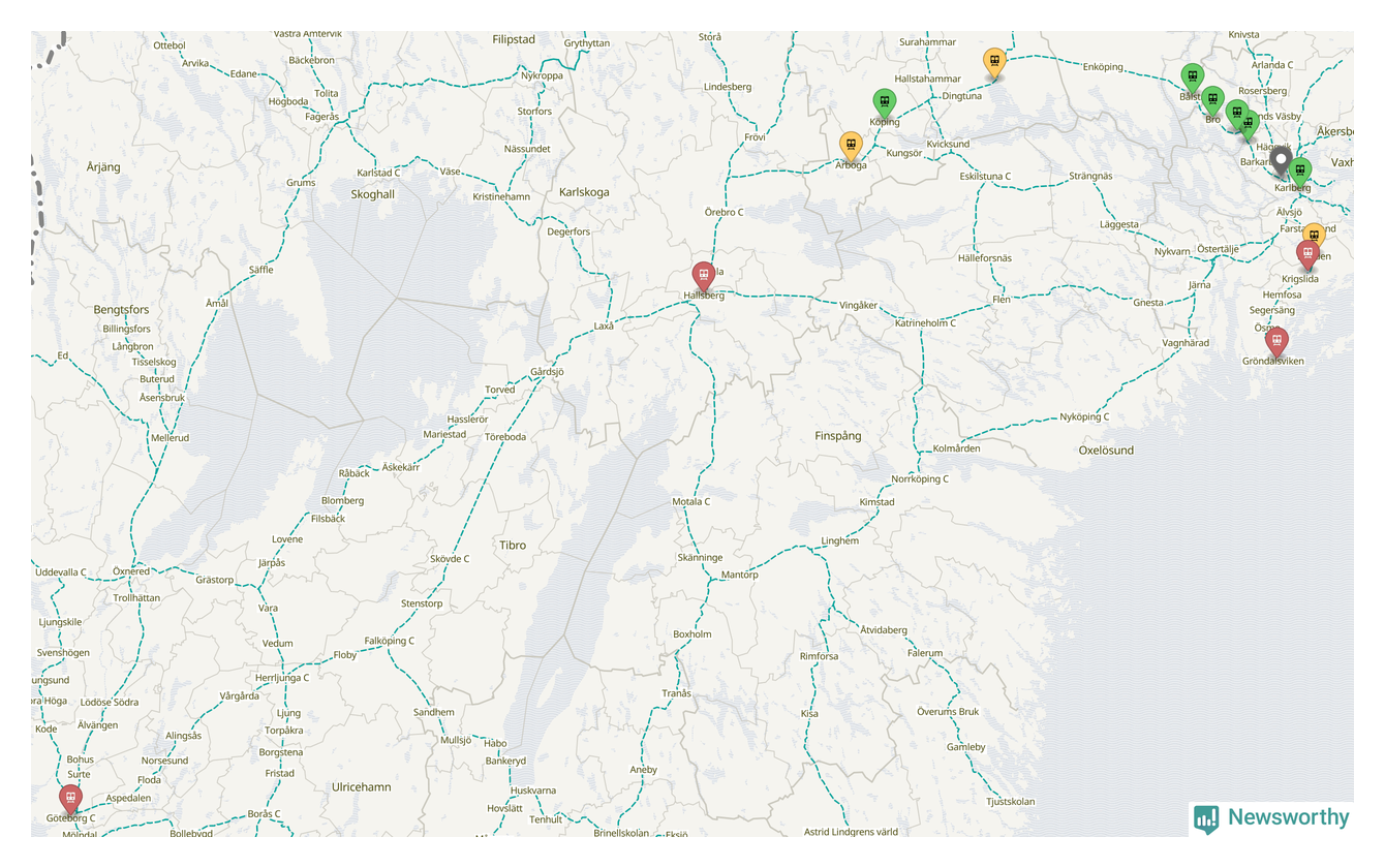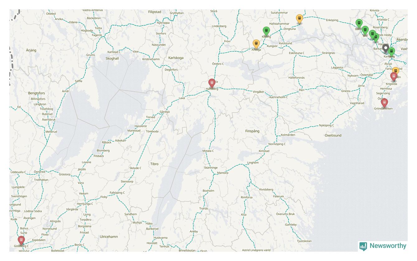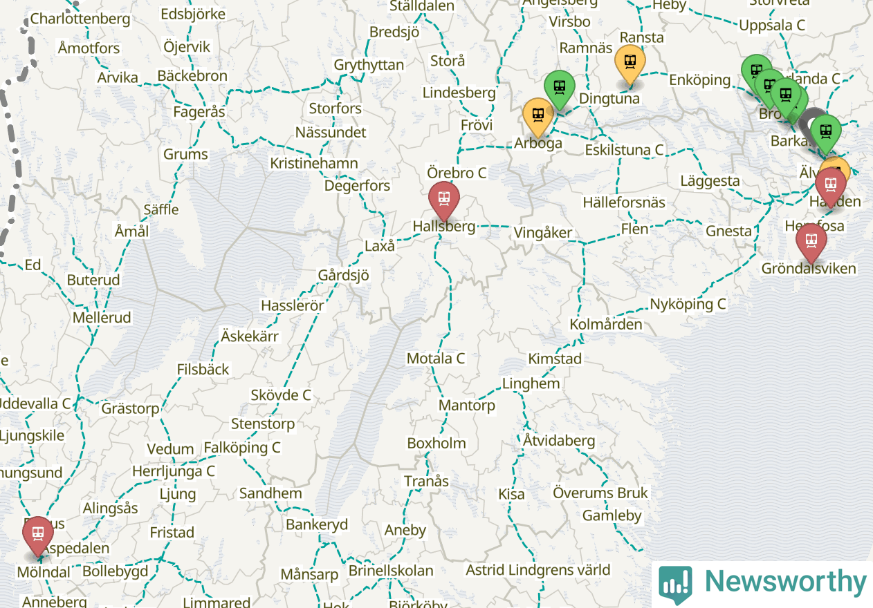 Kartdata från Mapbox, Newsworthy, OpenStreetMap och Trafikverket. Uppgifter om sträckor med passagerartrafik från jarnvag.net.