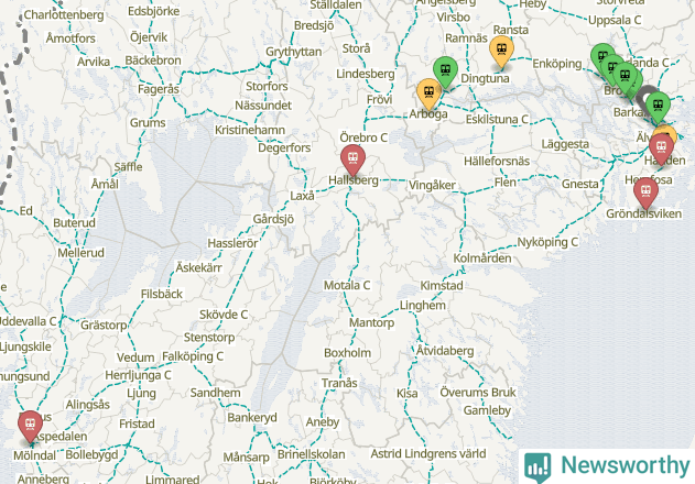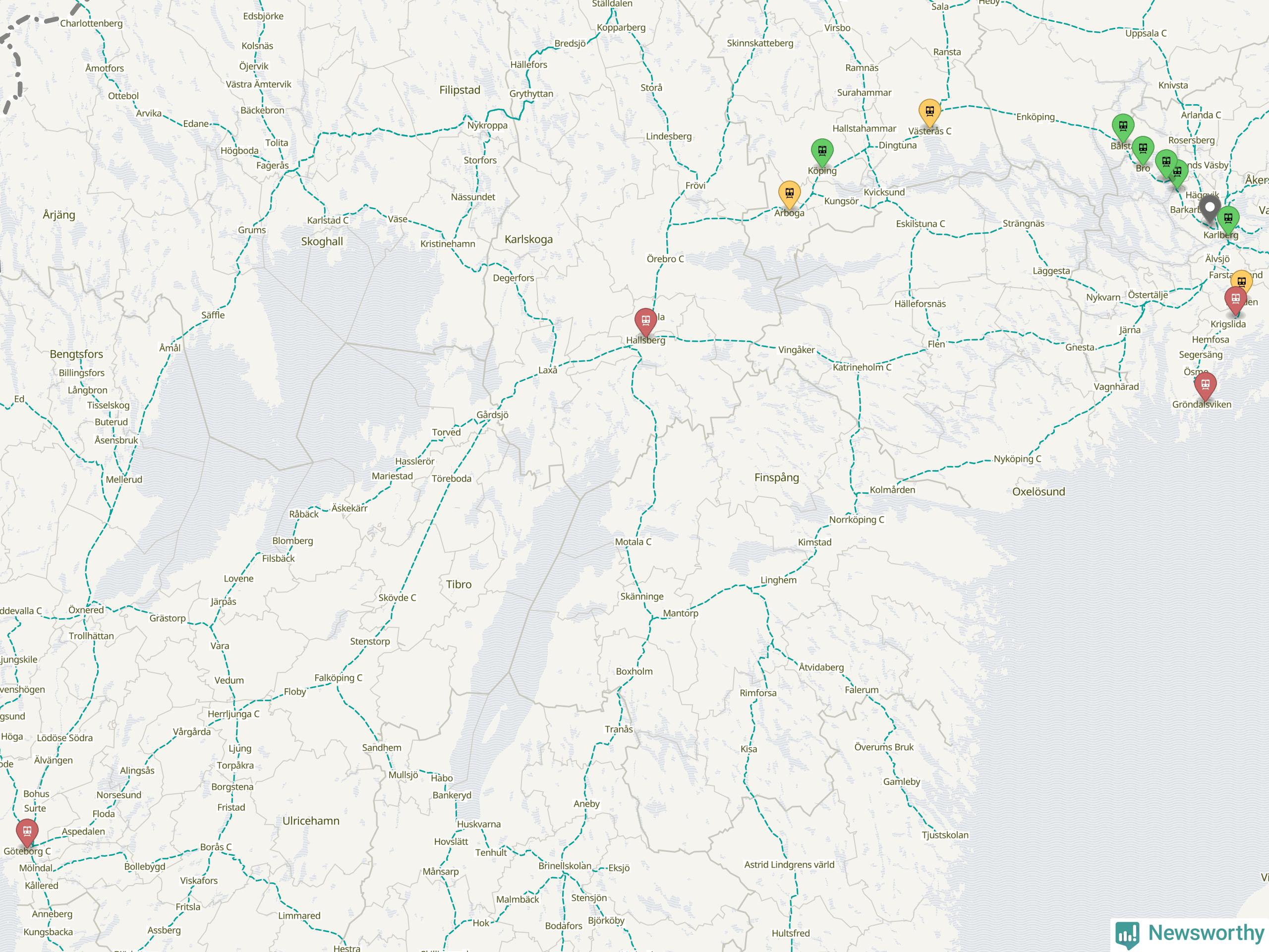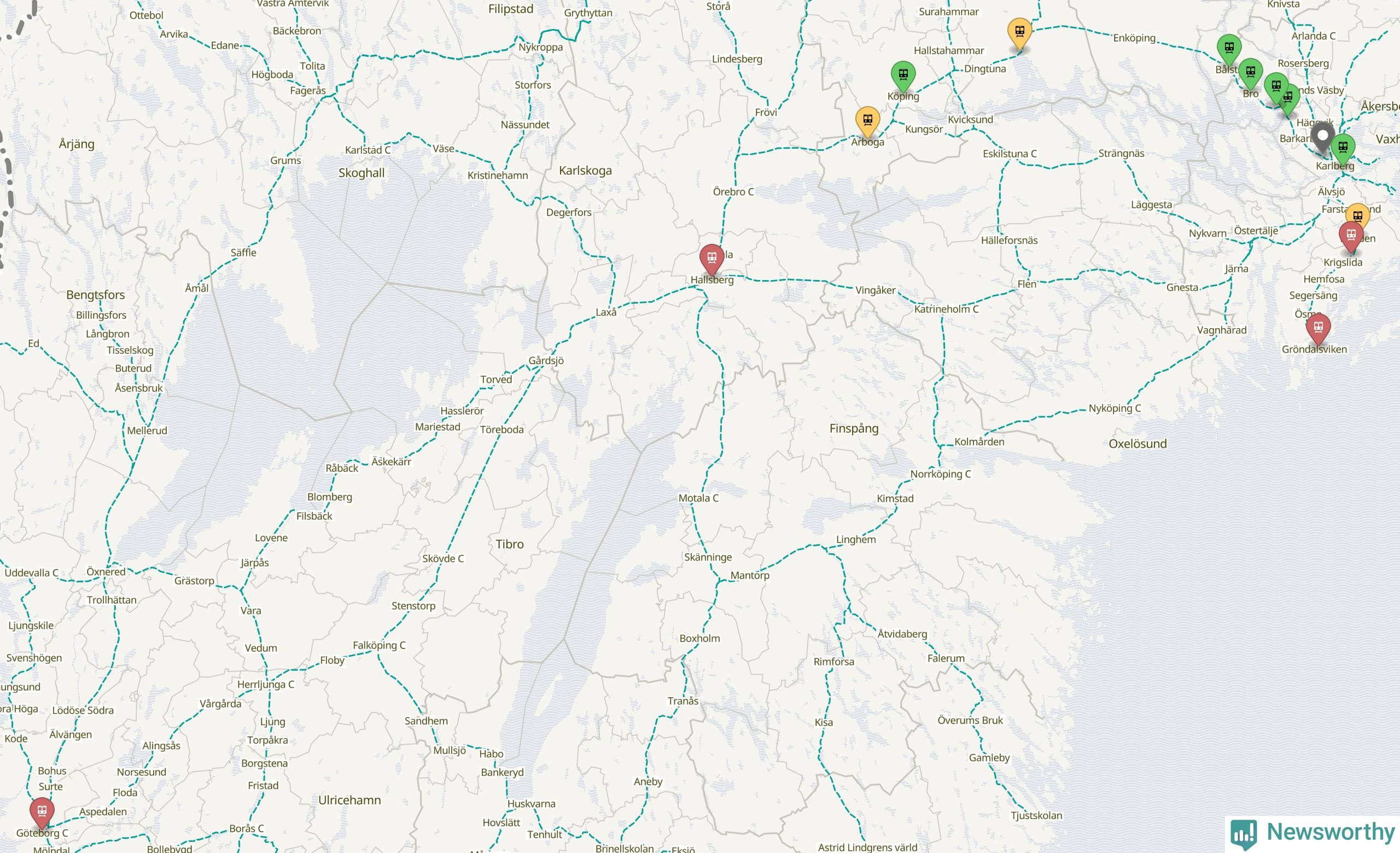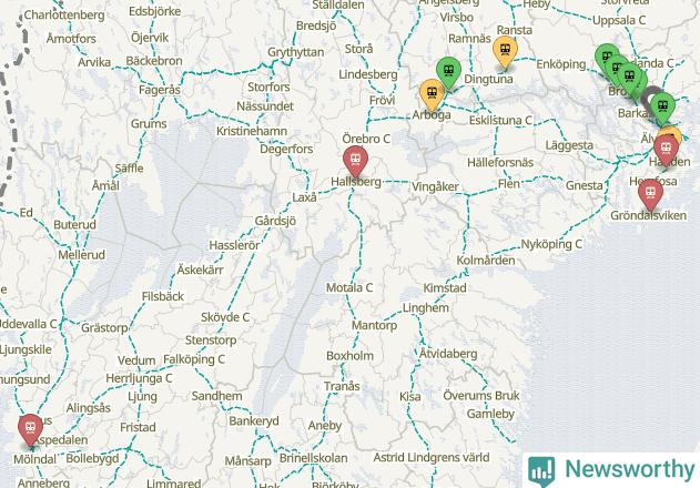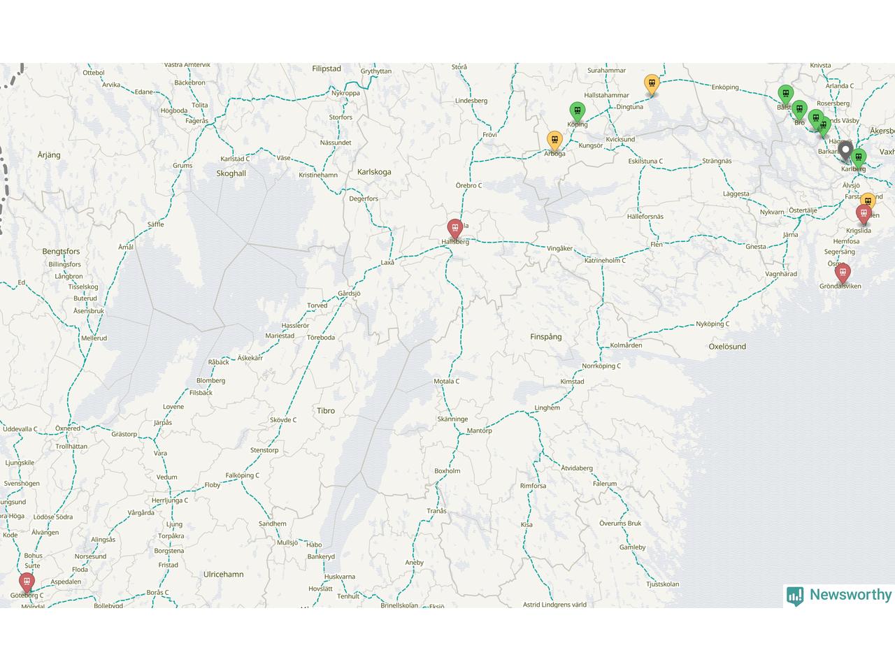 Kartdata från Mapbox, Newsworthy, OpenStreetMap och Trafikverket. Uppgifter om sträckor med passagerartrafik från jarnvag.net.