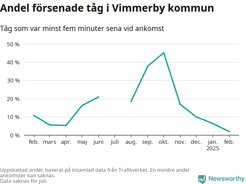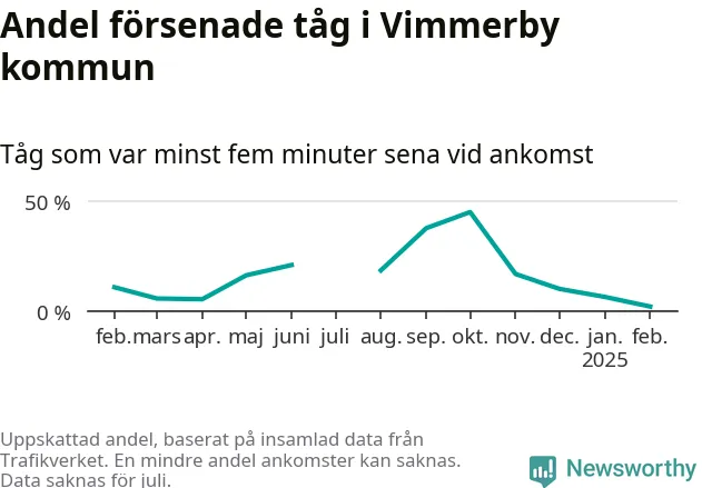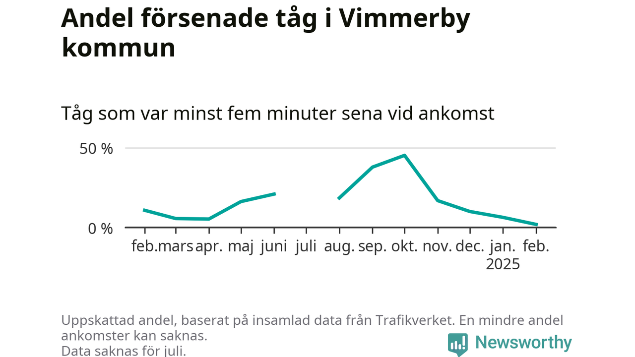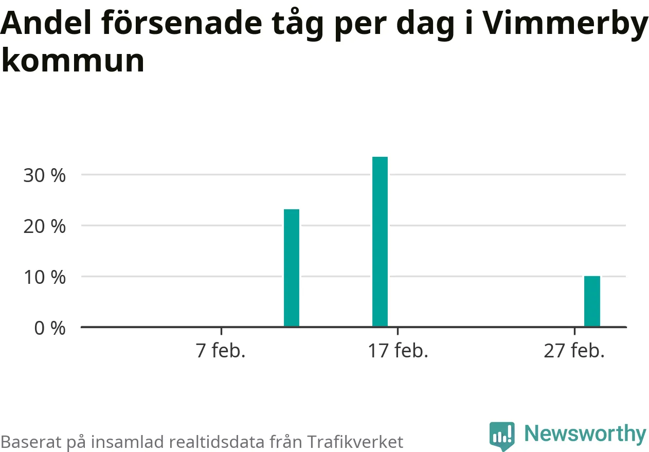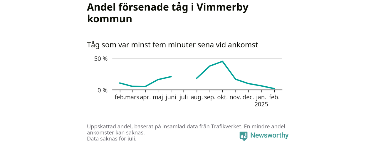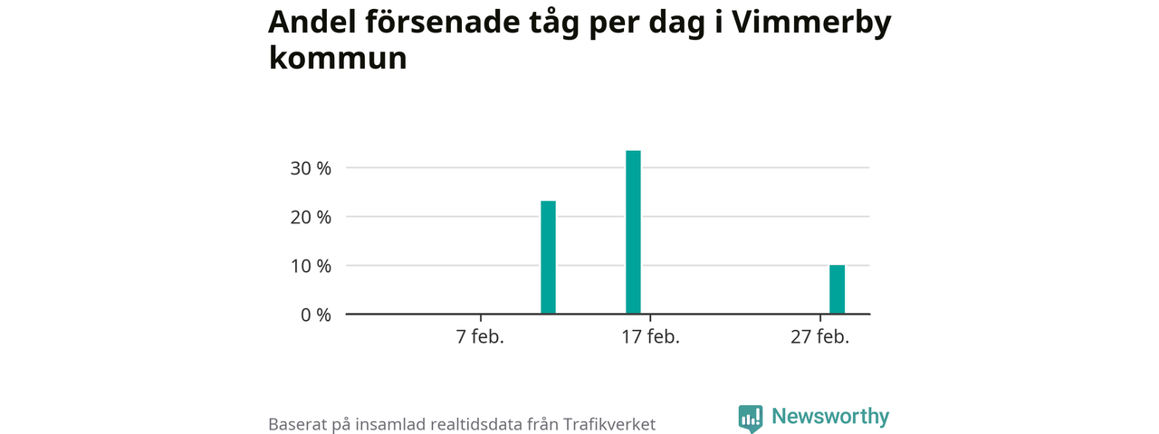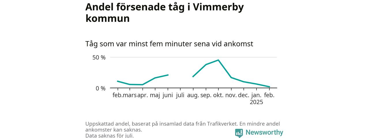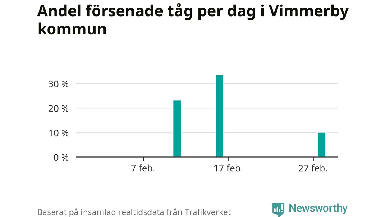 Endast två procent av tågen i Vimmerby kommun var mer än fem minuter försenade under februari, enligt Newsworthys sammanställning av alla tågförseningar. Det är klart bättre än på de flesta andra håll i landet.
