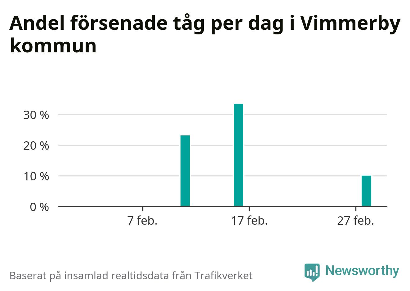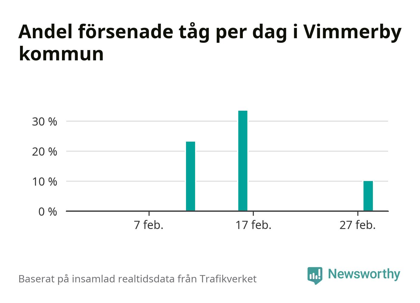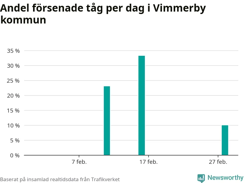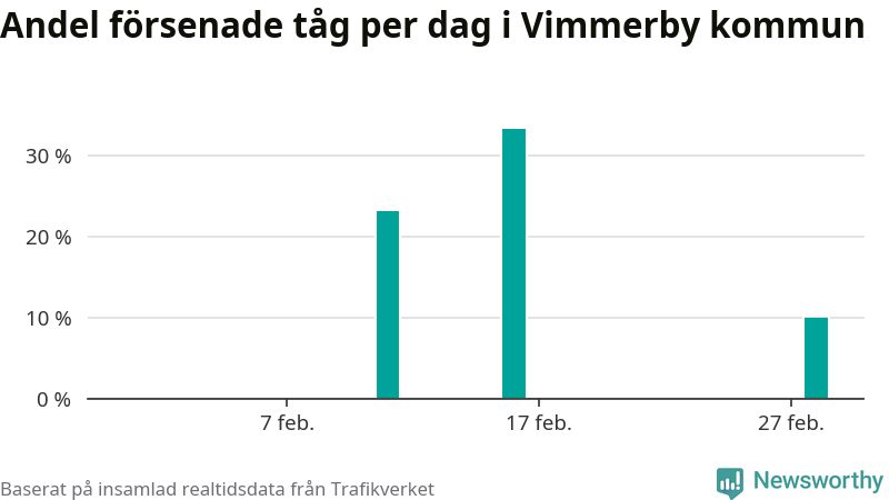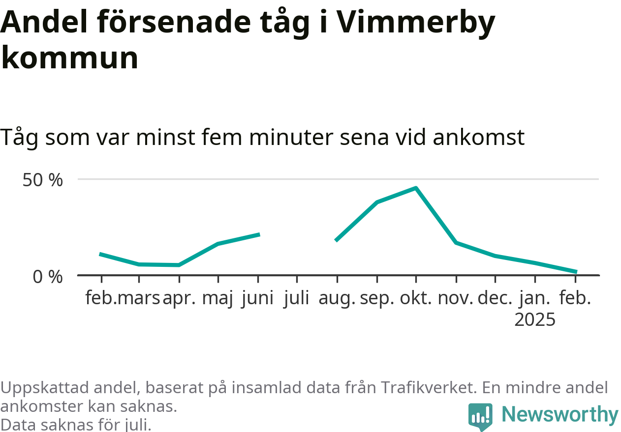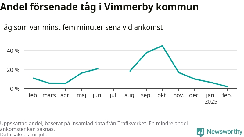 Endast två procent av tågen i Vimmerby kommun var mer än fem minuter försenade under februari, enligt Newsworthys sammanställning av alla tågförseningar. Det är klart bättre än på de flesta andra håll i landet.