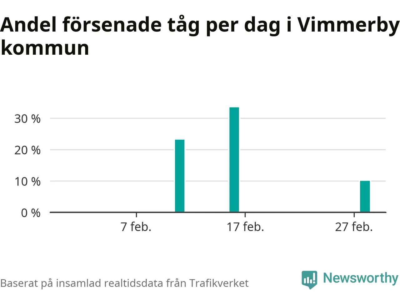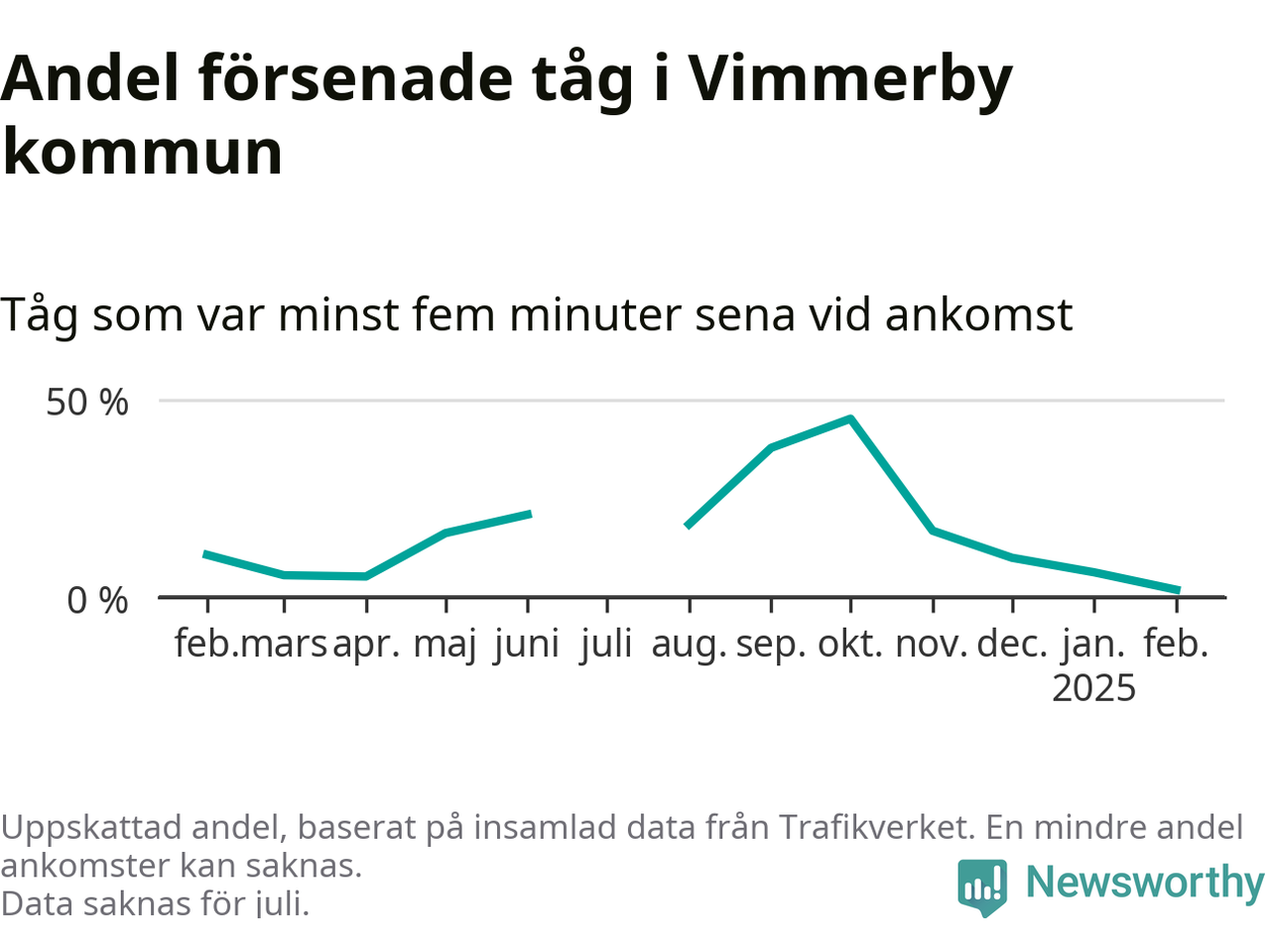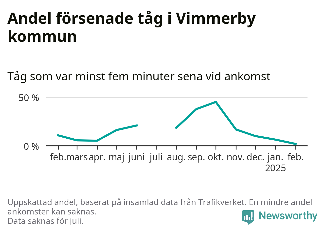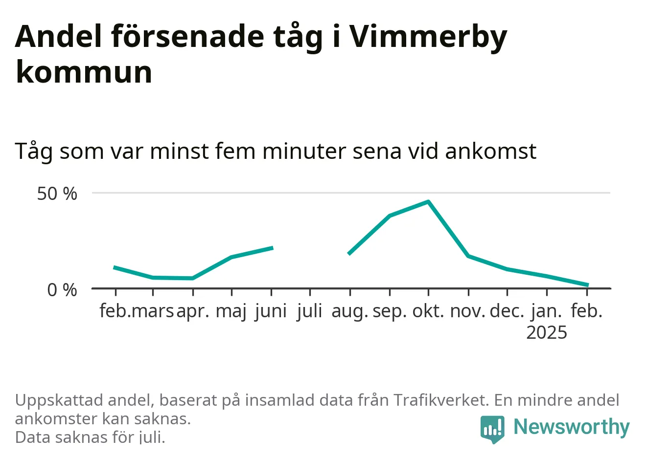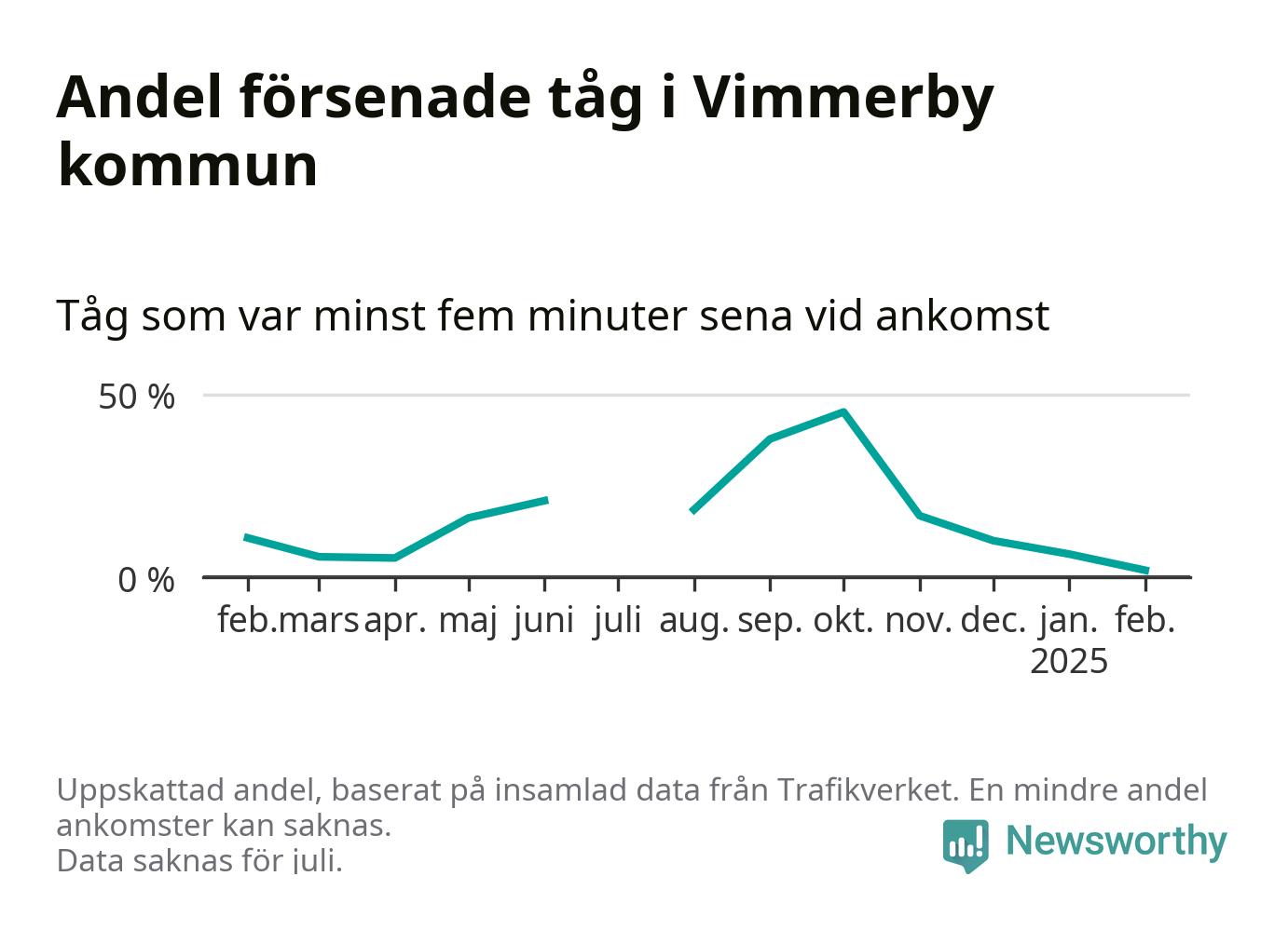 Endast två procent av tågen i Vimmerby kommun var mer än fem minuter försenade under februari, enligt Newsworthys sammanställning av alla tågförseningar. Det är klart bättre än på de flesta andra håll i landet.