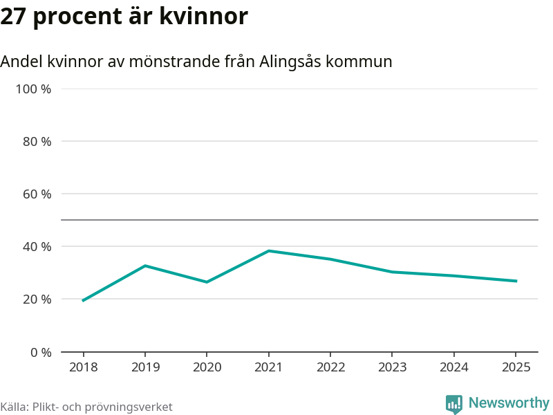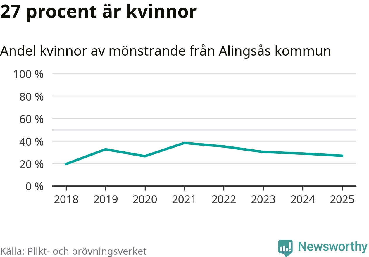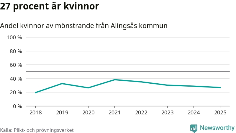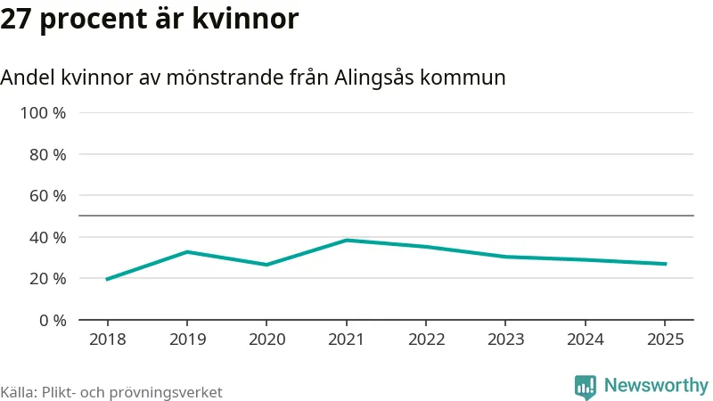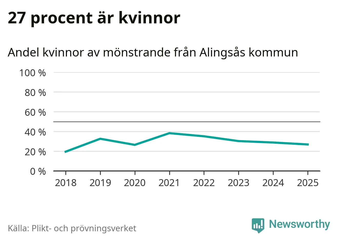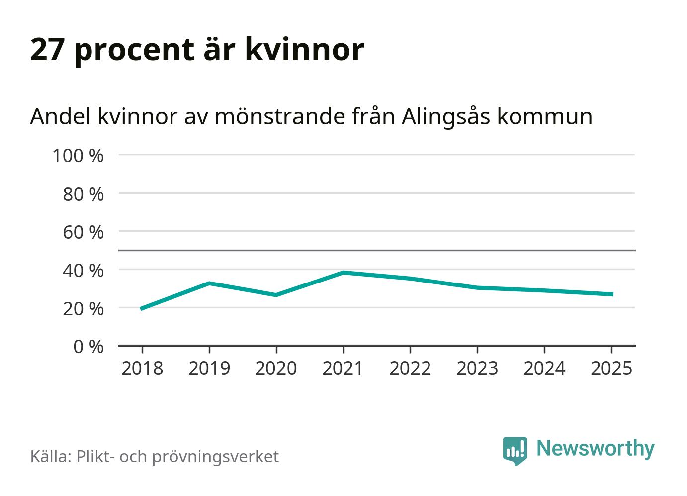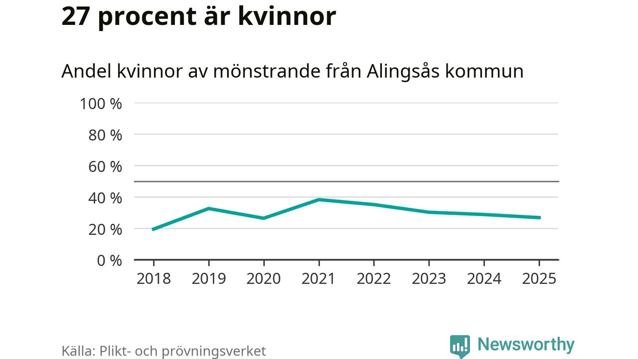 33 av de som kallats till mönstring från Alingsås är kvinnor, vilket motsvarar 27 procent av de mönstrande. Som mest har 36 kvinnor kallats från kommunen (2024 och 2023). I riket som helhet är 28 procent av de mönstrande tjejer.