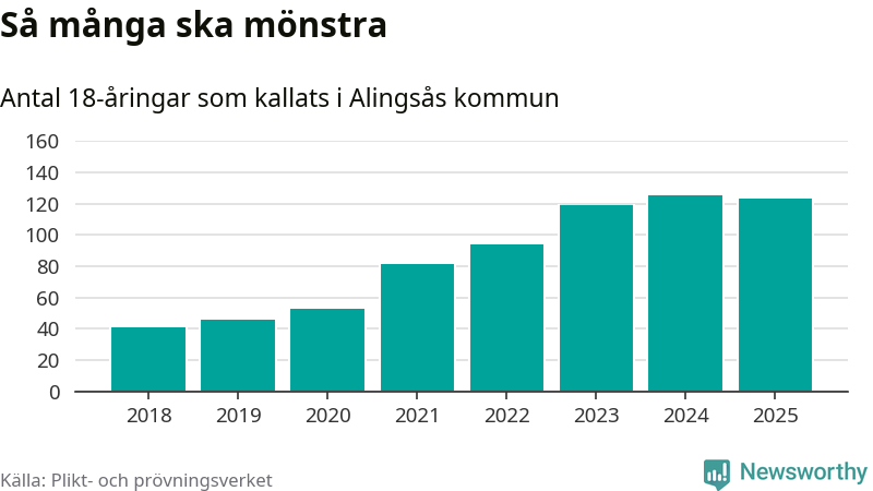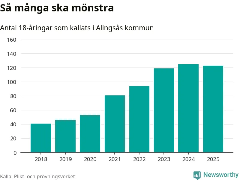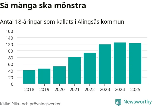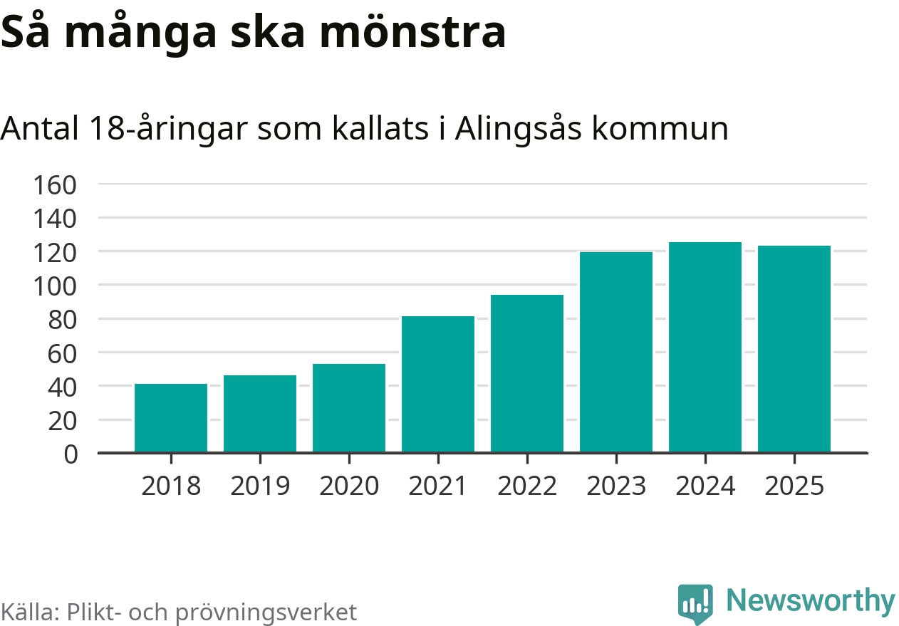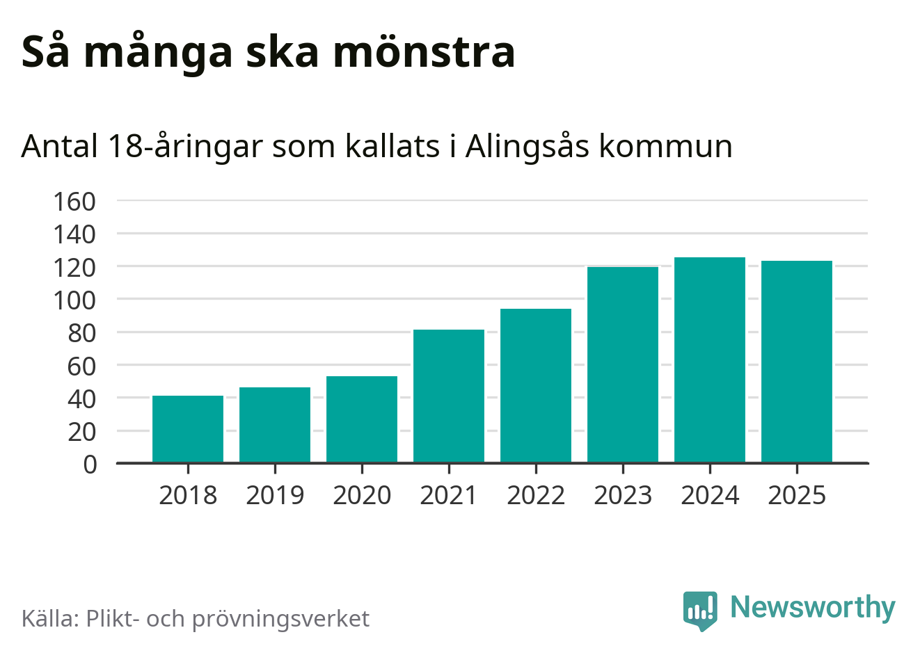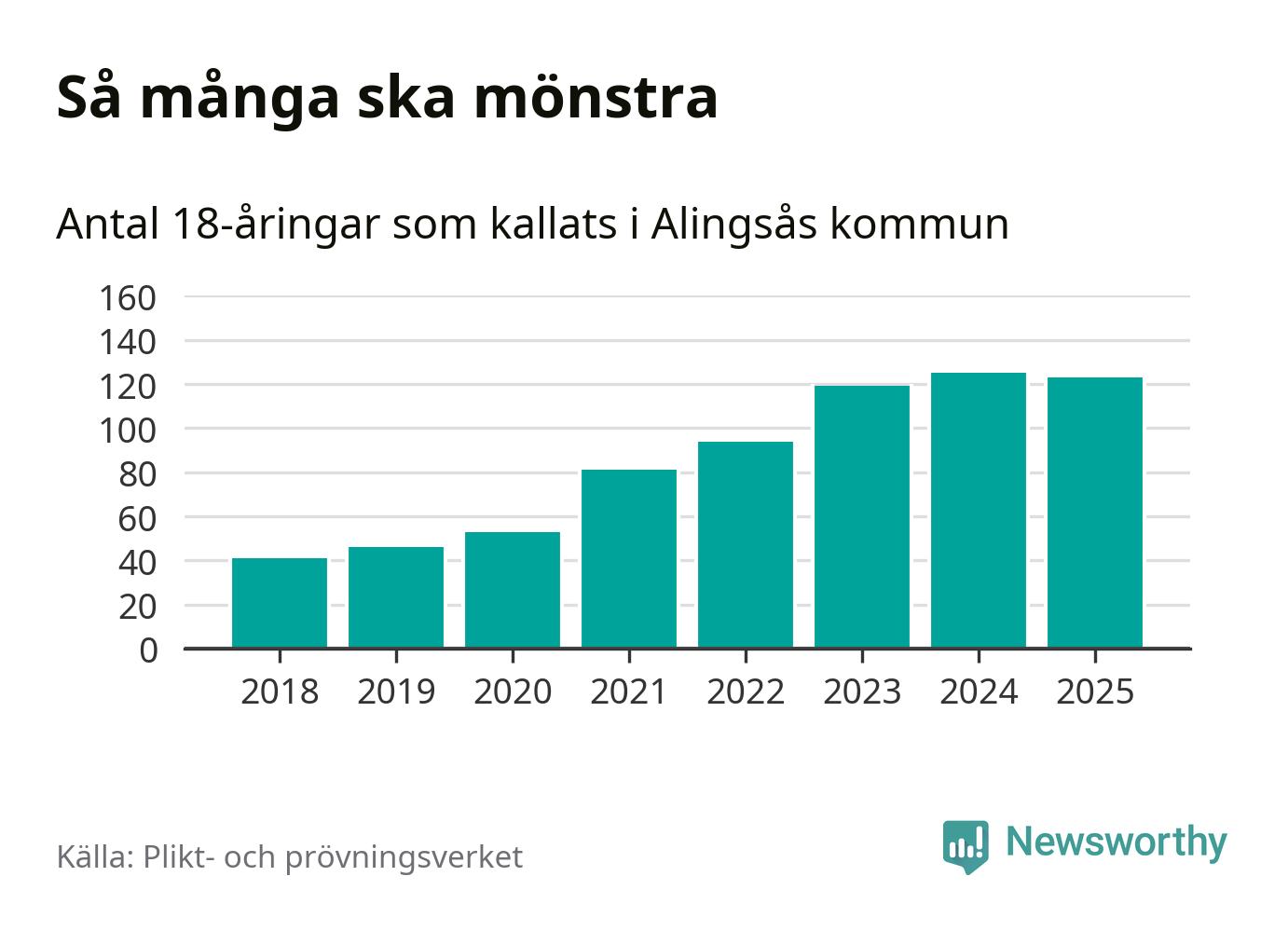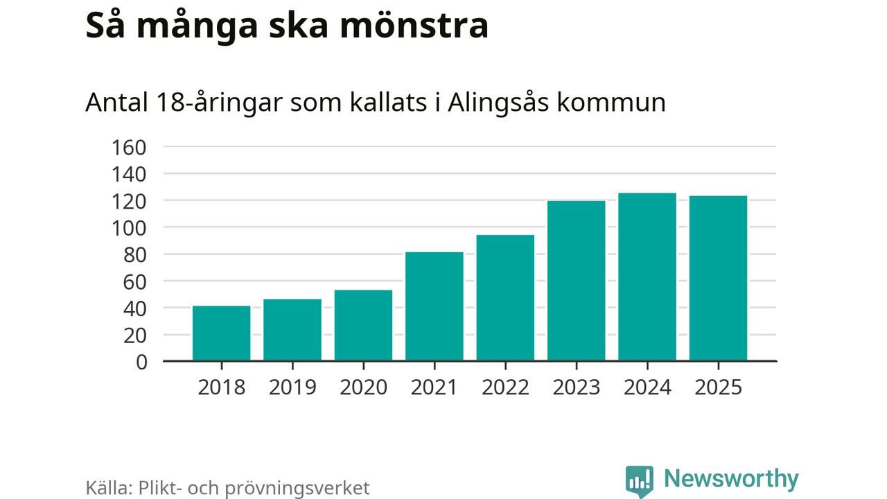 Nu kallas omkring 28 200 svenskar födda 2007 till mönstring. Och 123 av dem kommer från Alingsås, enligt ny statistik från Plikt- och prövningsverket. Det innebär att nästan var fjärde invånare i åldersgruppen i kommunen kallas till mönstring. Det är ungefär lika stor andel som i Västra Götaland totalt. Även i riket som helhet kallas nästan var fjärde person i årskullen.