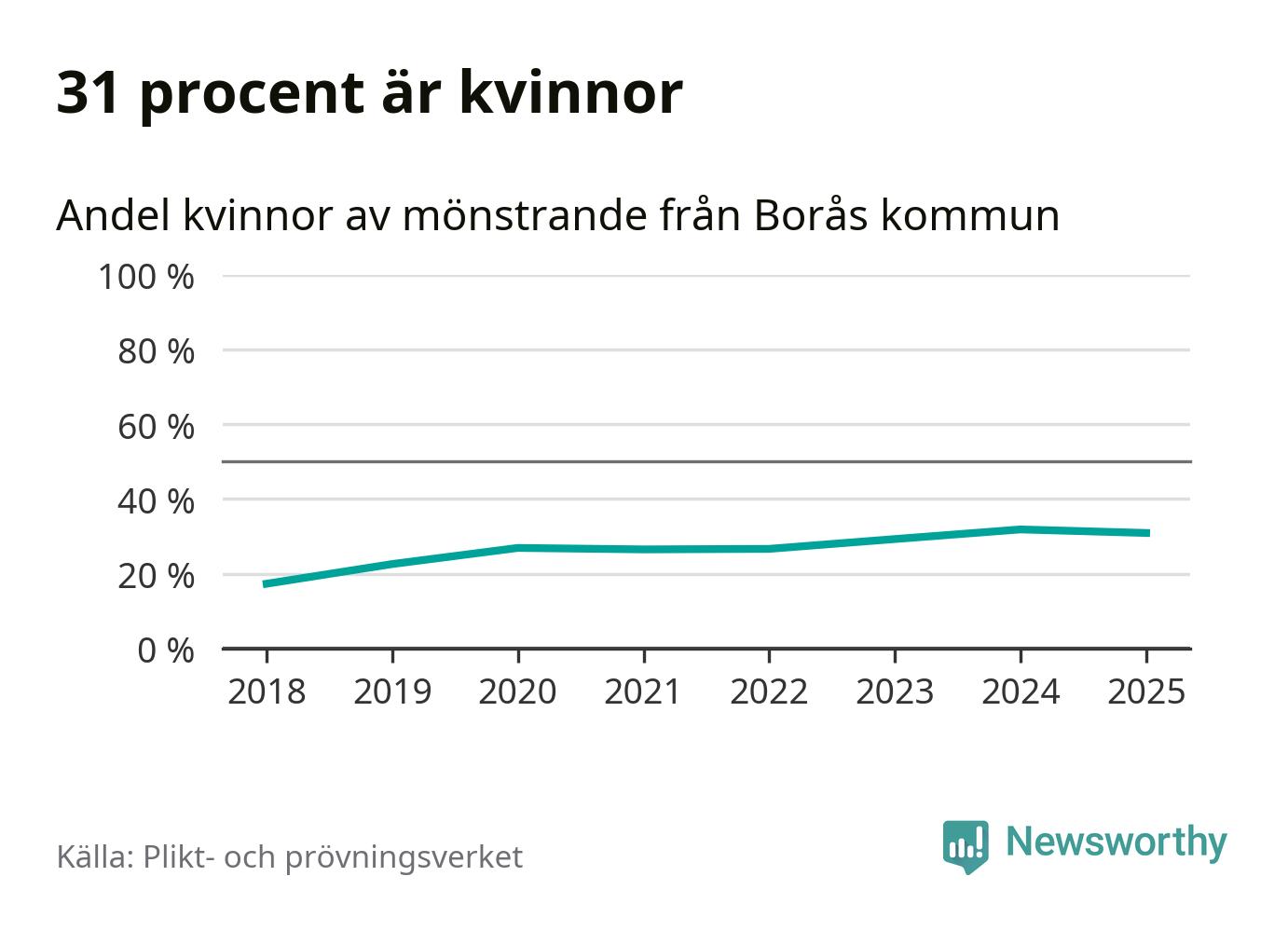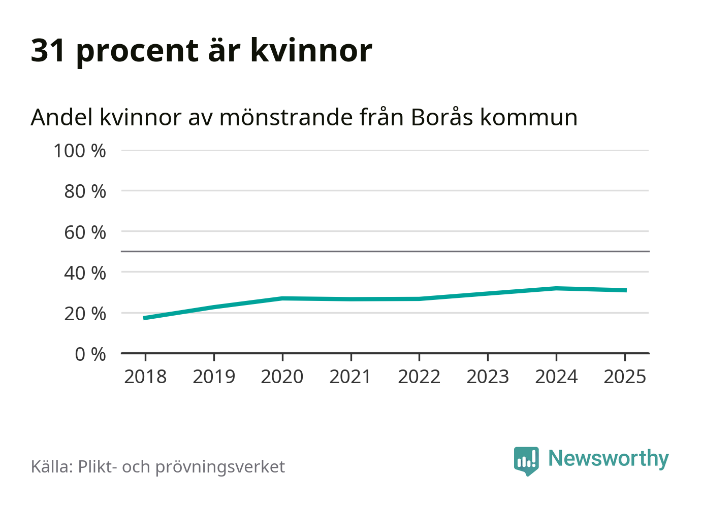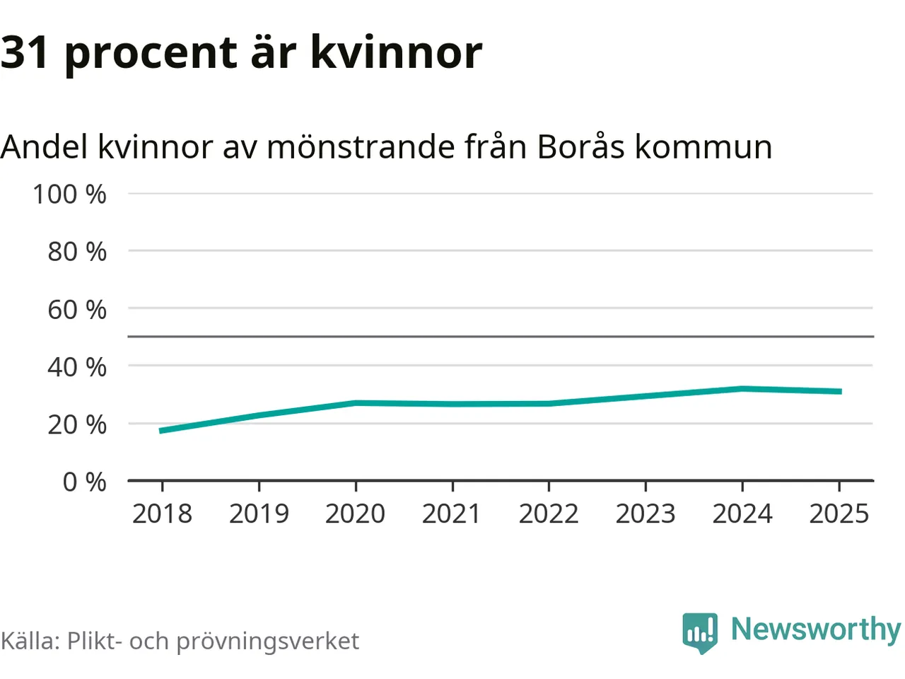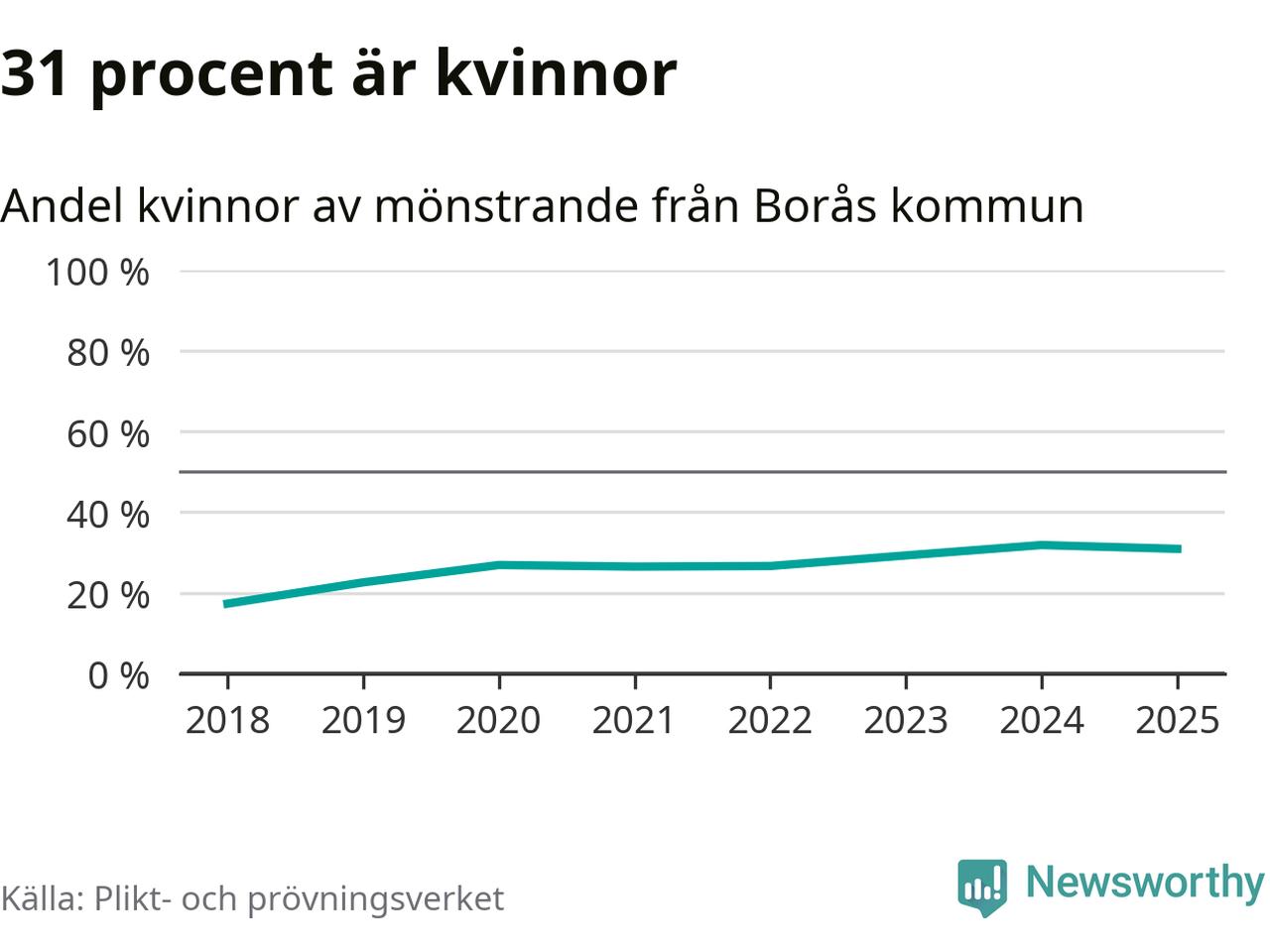 94 av de som kallats till mönstring från Borås är kvinnor, vilket motsvarar 31 procent av de mönstrande. Som mest har 108 kvinnor kallats från kommunen (2024). I riket som helhet är 28 procent av de mönstrande tjejer.