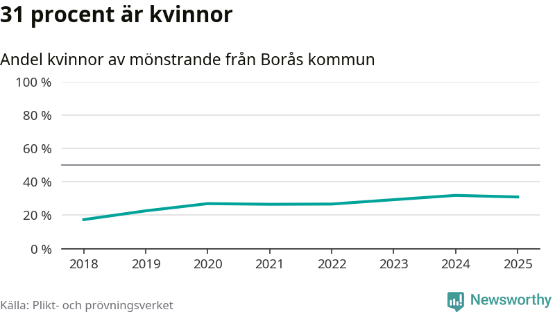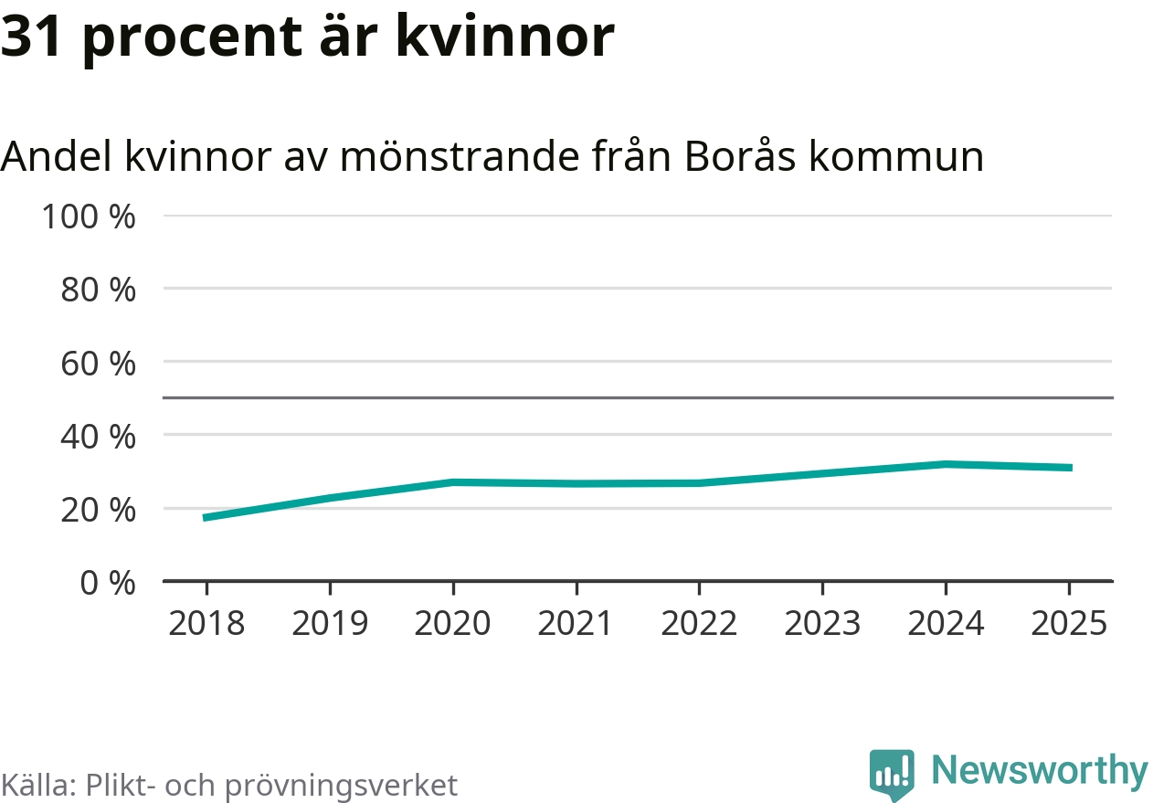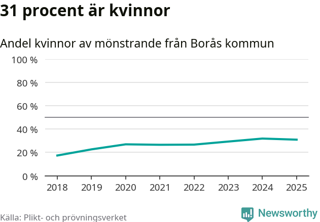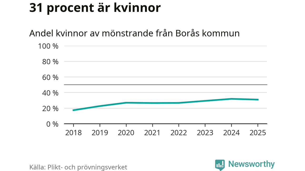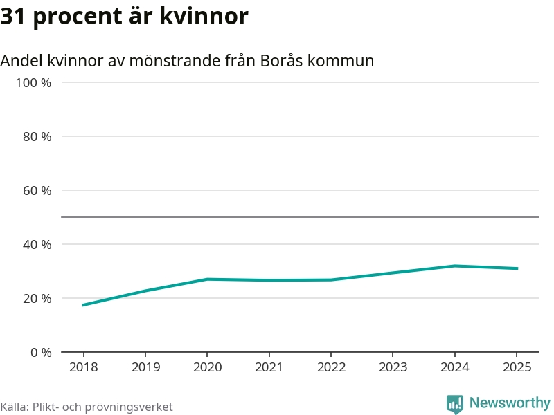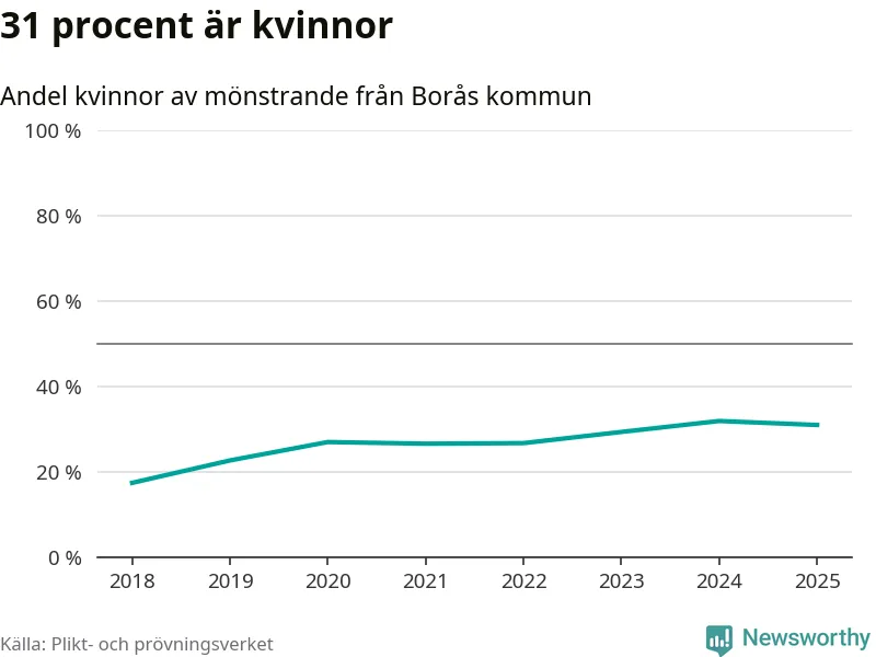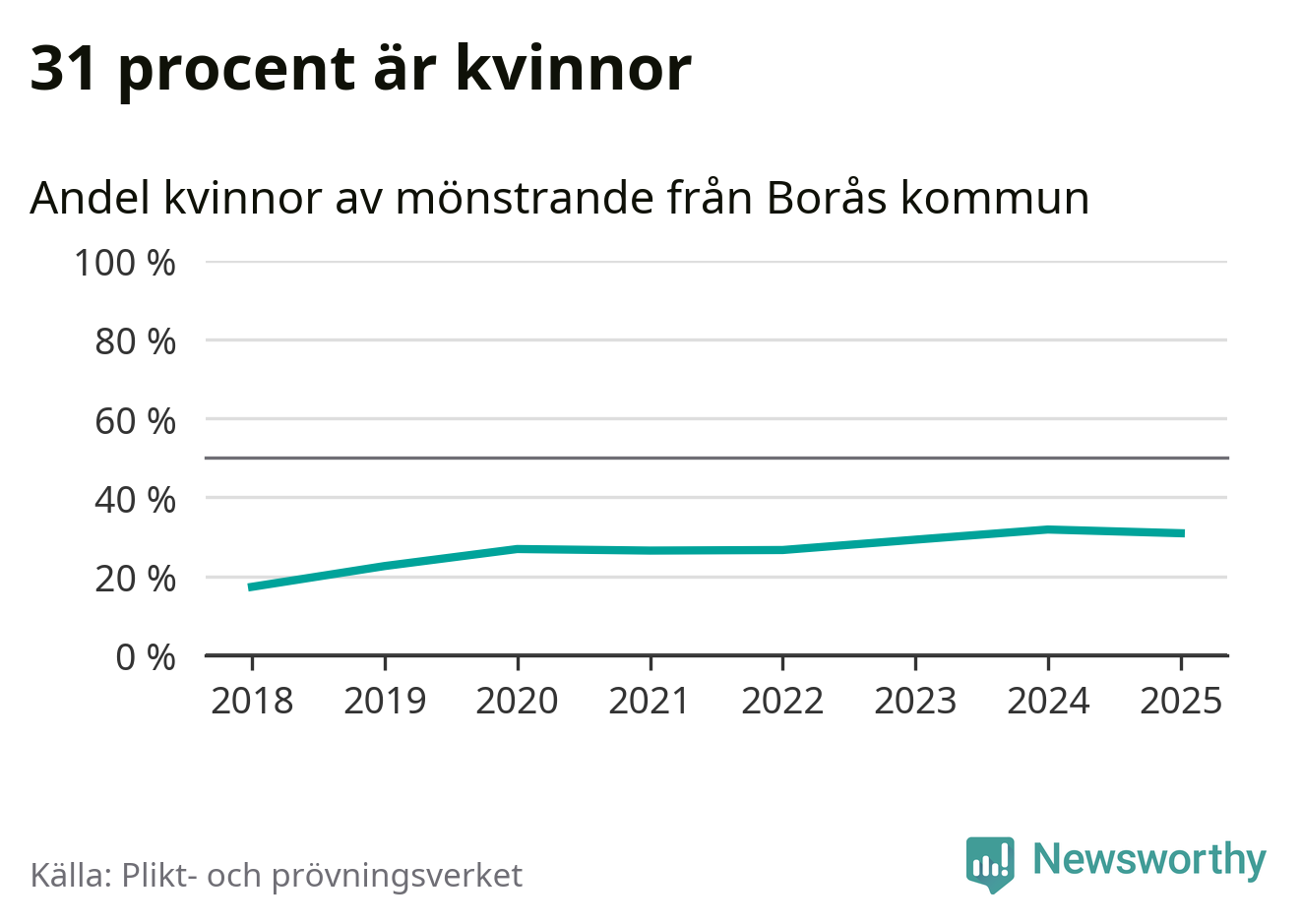 94 av de som kallats till mönstring från Borås är kvinnor, vilket motsvarar 31 procent av de mönstrande. Som mest har 108 kvinnor kallats från kommunen (2024). I riket som helhet är 28 procent av de mönstrande tjejer.