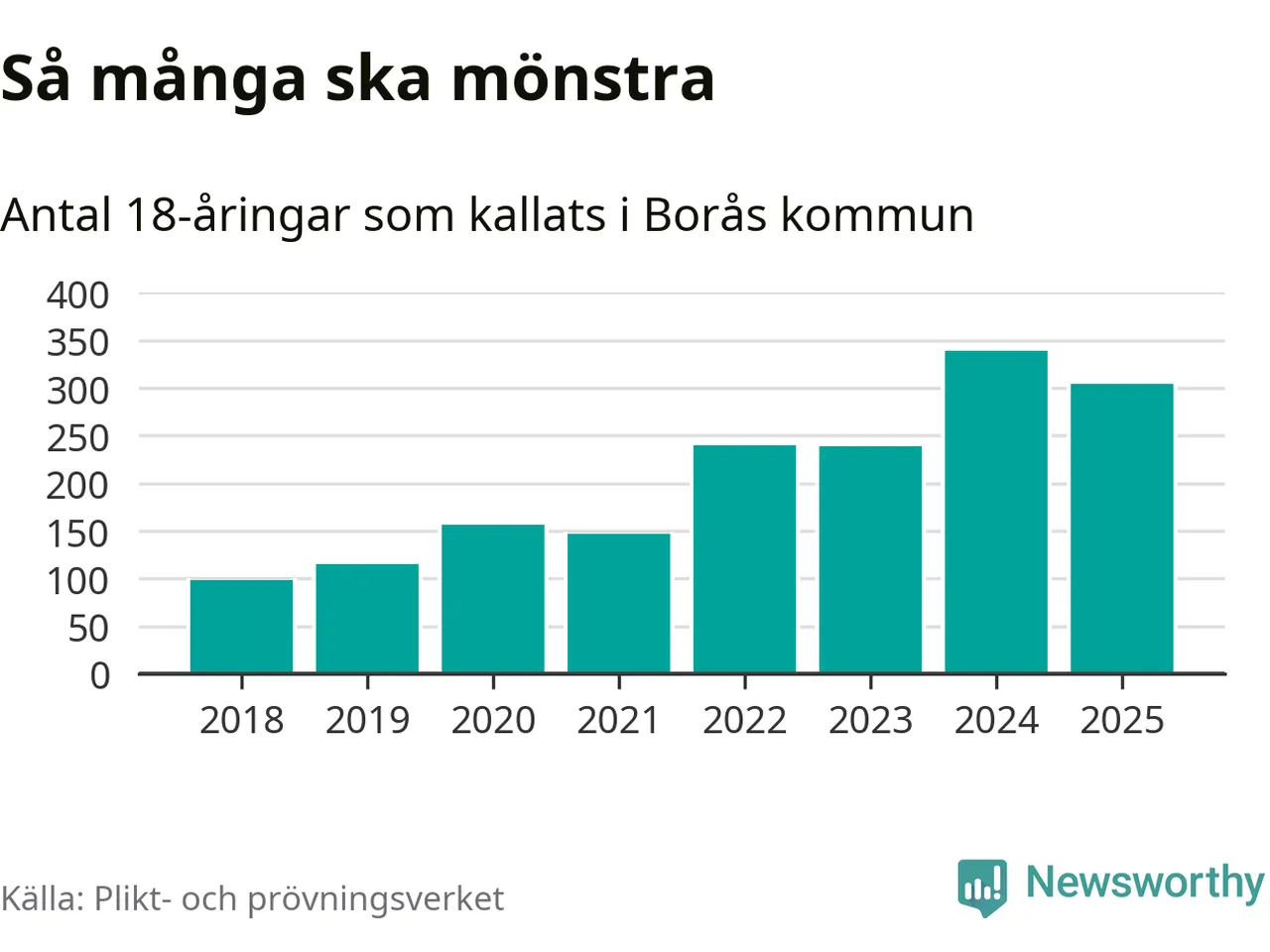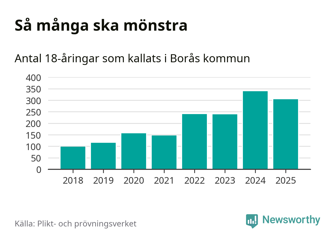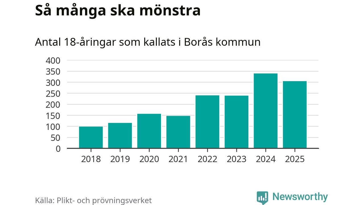 Nu kallas omkring 28 200 svenskar födda 2007 till mönstring. Och 304 av dem kommer från Borås, enligt ny statistik från Plikt- och prövningsverket. Det innebär att var femte invånare i åldersgruppen i kommunen kallas till mönstring. Det är ungefär lika stor andel som i Västra Götaland totalt. I riket som helhet kallas nästan var fjärde person i årskullen.
