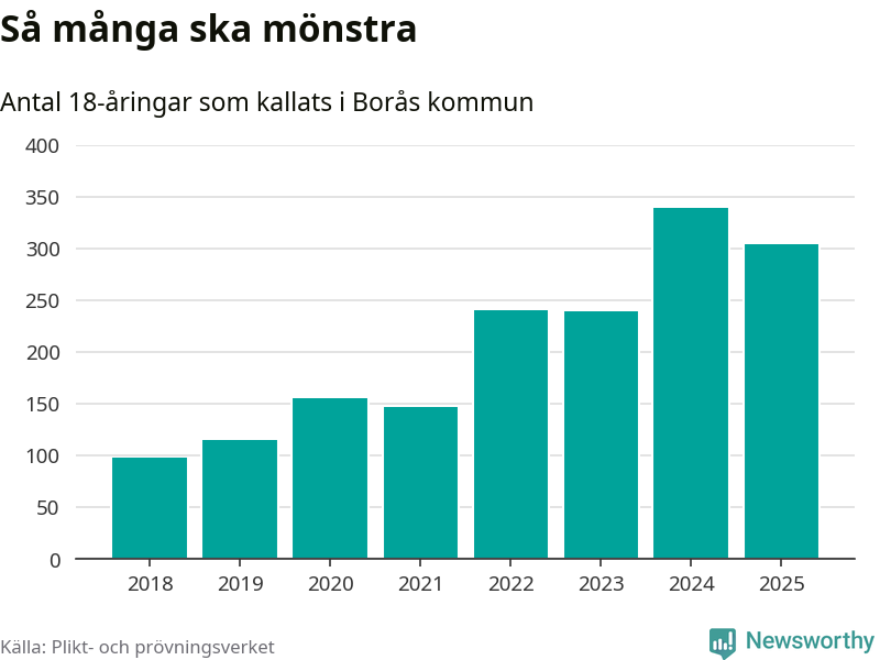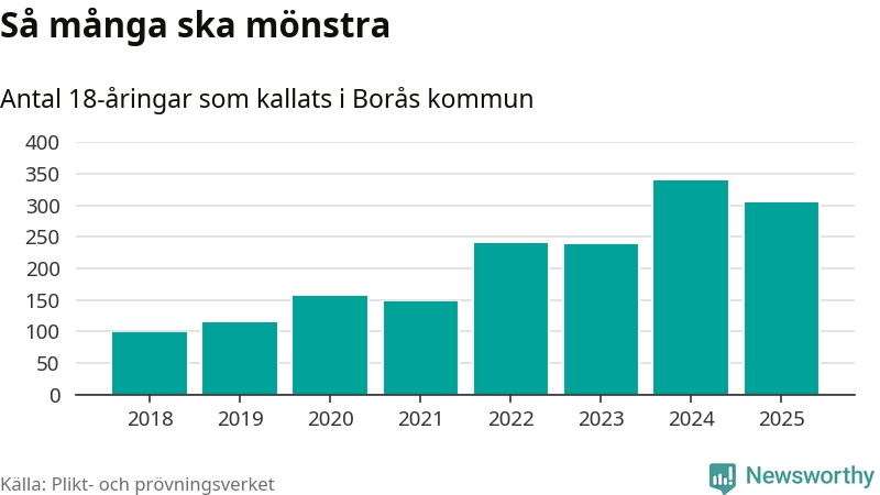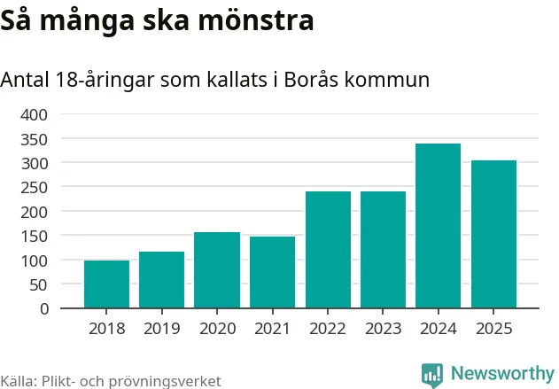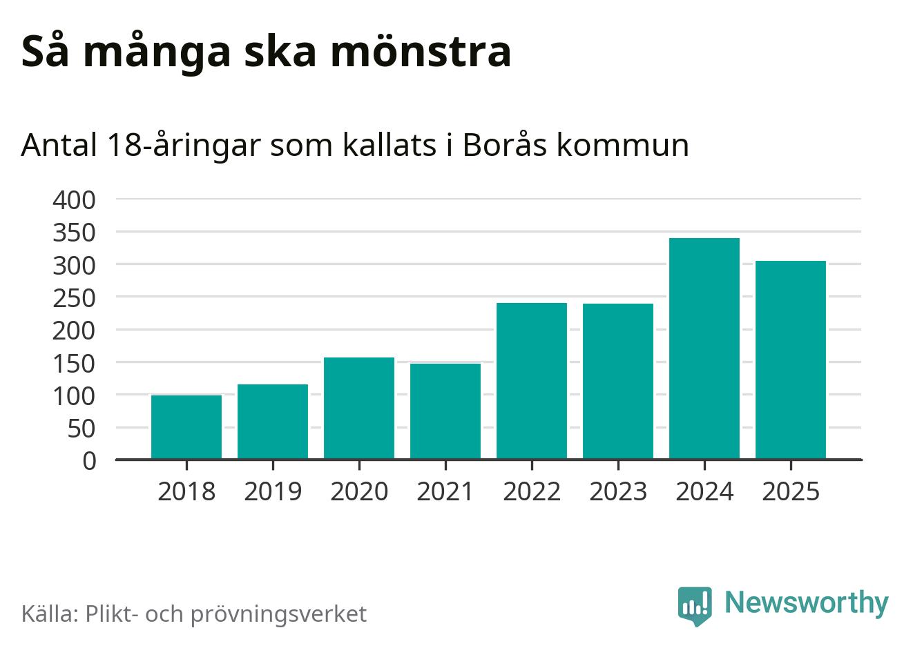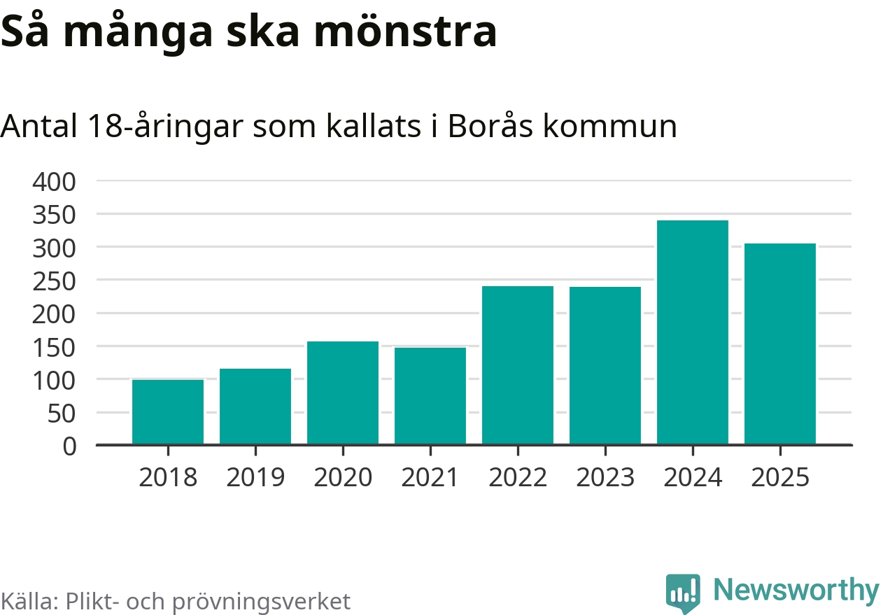 Nu kallas omkring 28 200 svenskar födda 2007 till mönstring. Och 304 av dem kommer från Borås, enligt ny statistik från Plikt- och prövningsverket. Det innebär att var femte invånare i åldersgruppen i kommunen kallas till mönstring. Det är ungefär lika stor andel som i Västra Götaland totalt. I riket som helhet kallas nästan var fjärde person i årskullen.