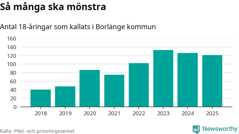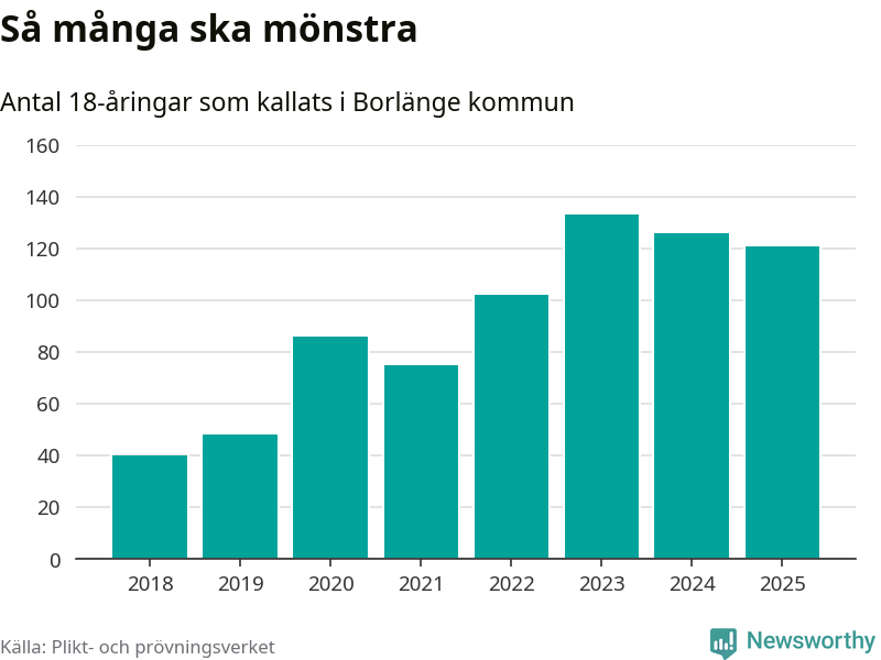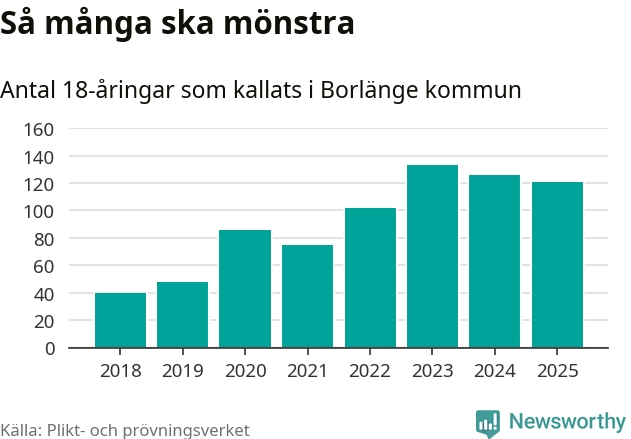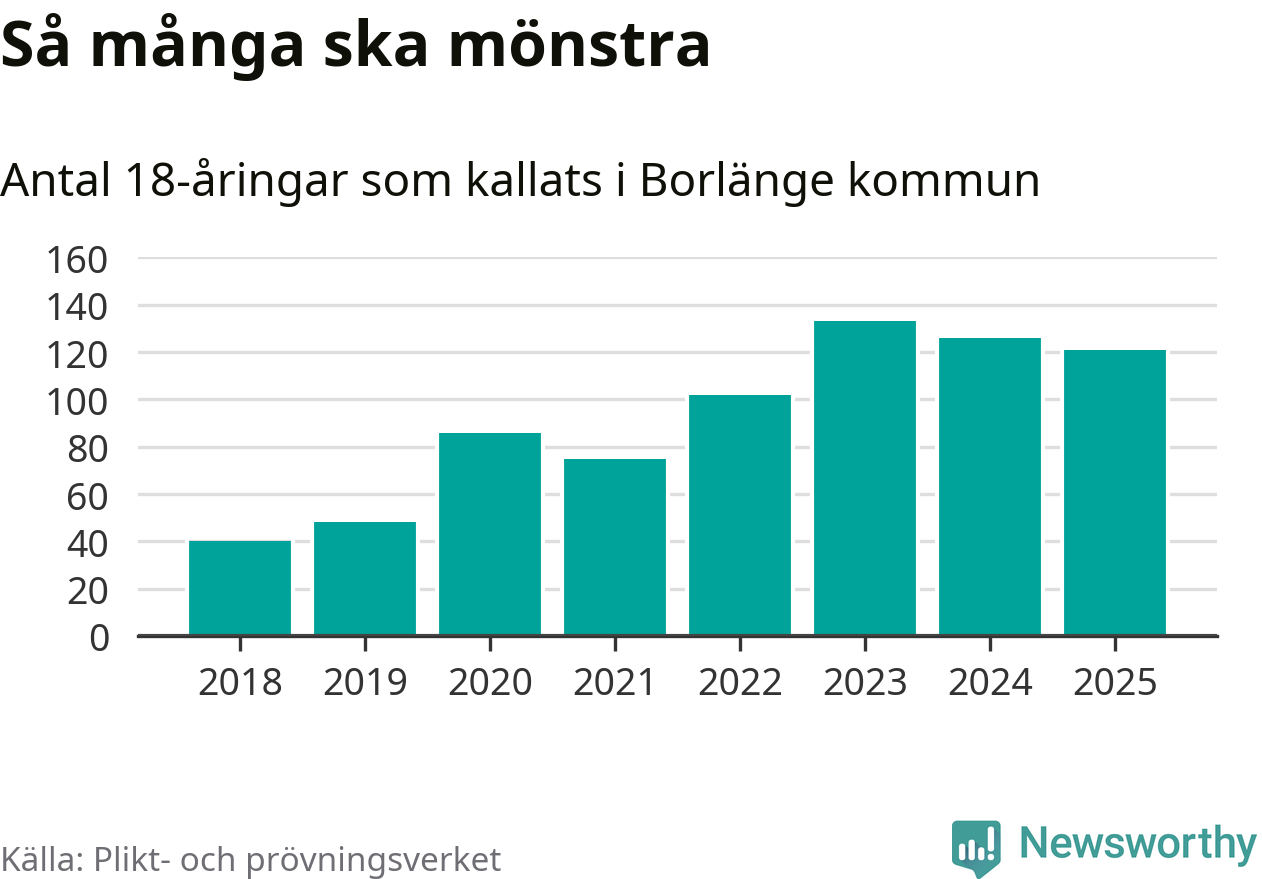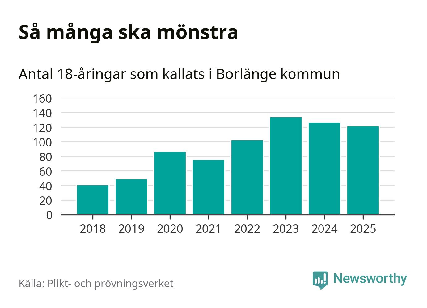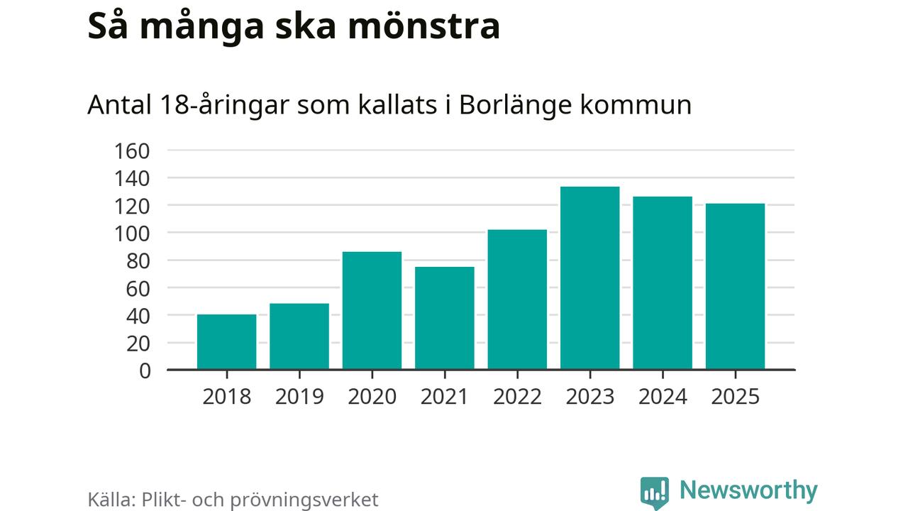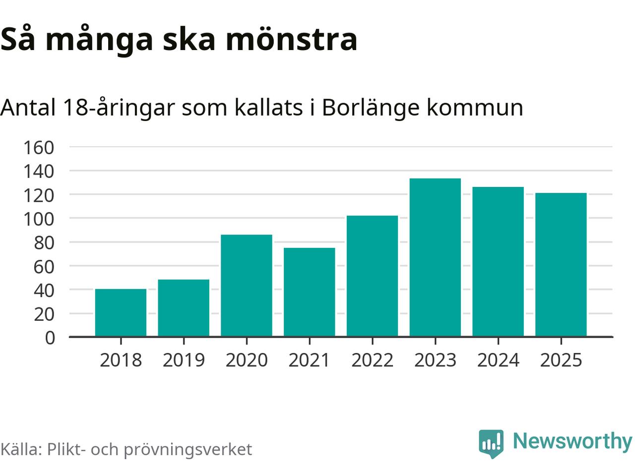 Nu kallas omkring 28 200 svenskar födda 2007 till mönstring. Och 121 av dem kommer från Borlänge, enligt ny statistik från Plikt- och prövningsverket. Det innebär att var femte invånare i åldersgruppen i kommunen kallas till mönstring. Det är en lägre andel än i Dalarna totalt. I riket som helhet kallas nästan var fjärde person i årskullen.