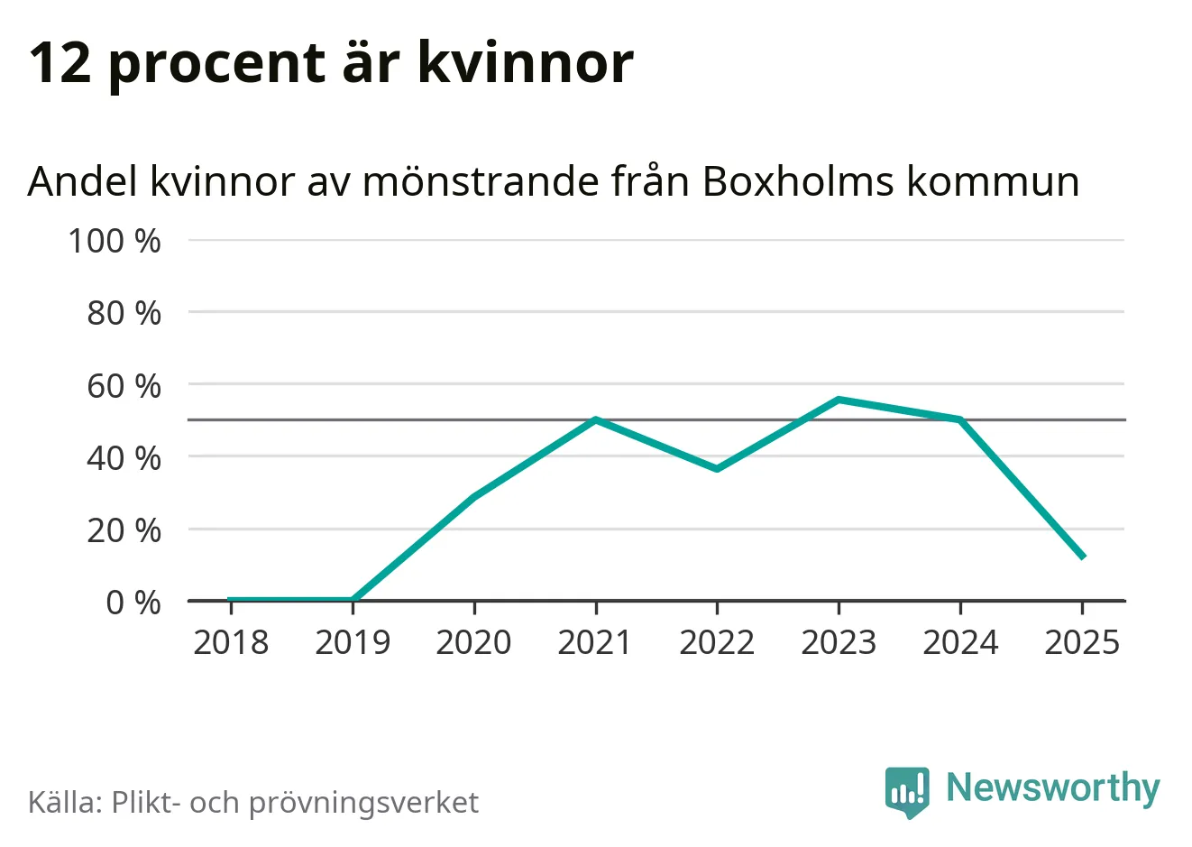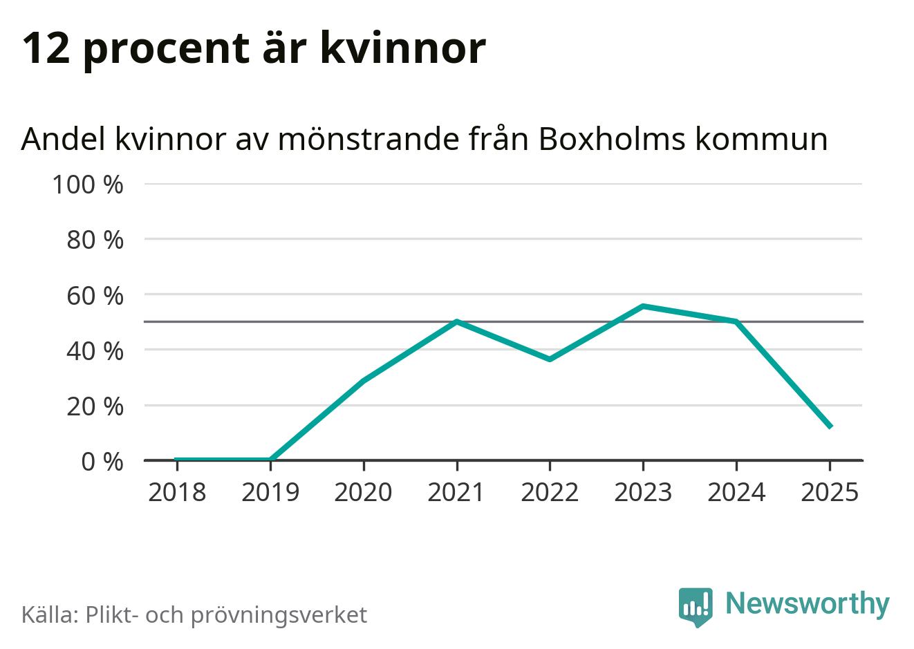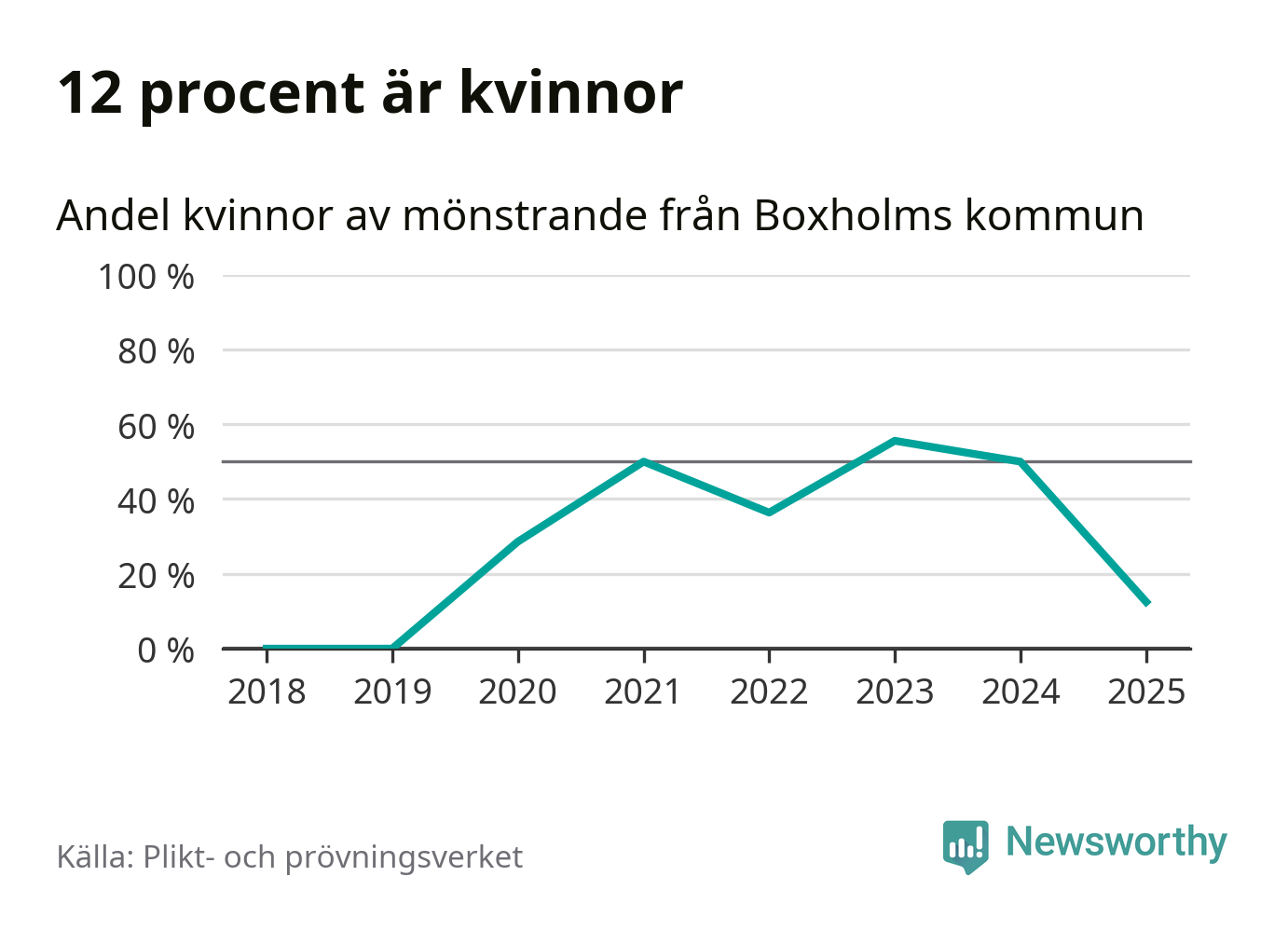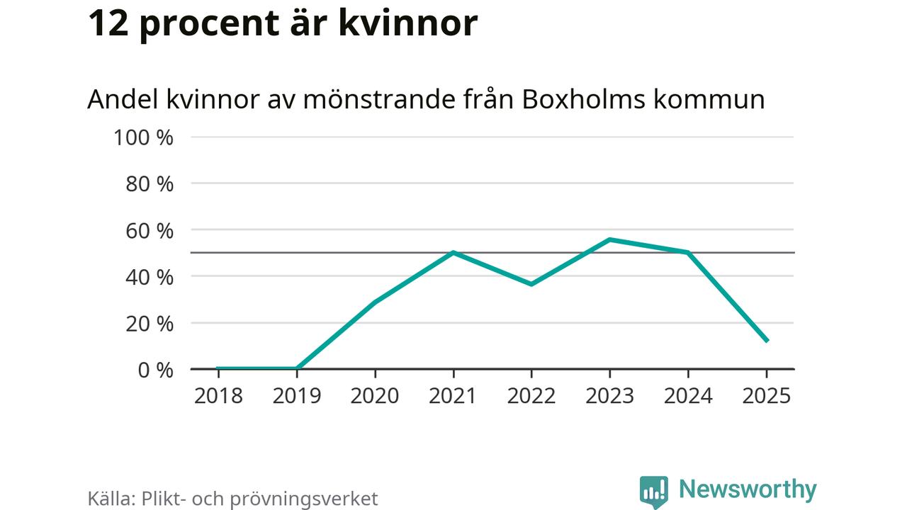 Två av de som kallats till mönstring från Boxholm är kvinnor, vilket motsvarar 13 procent av de mönstrande. Som mest har sex kvinnor kallats från kommunen (2024). I riket som helhet är 28 procent av de mönstrande tjejer.