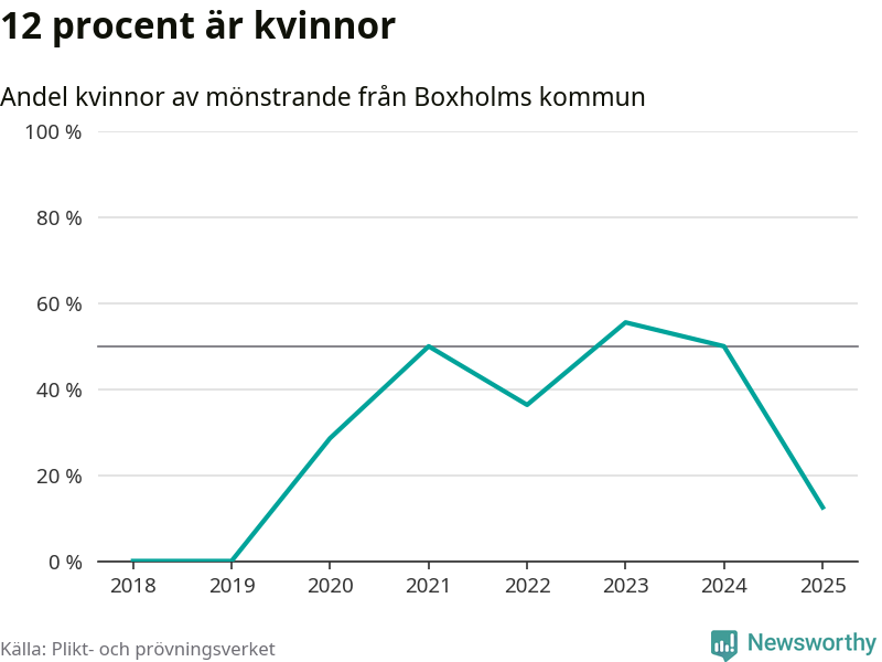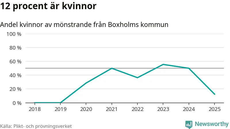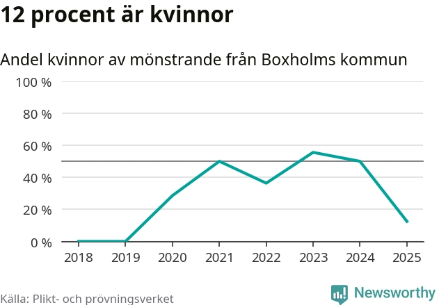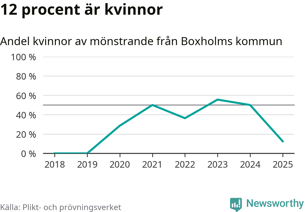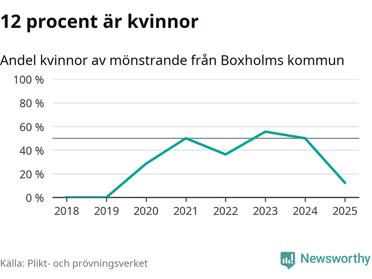 Två av de som kallats till mönstring från Boxholm är kvinnor, vilket motsvarar 13 procent av de mönstrande. Som mest har sex kvinnor kallats från kommunen (2024). I riket som helhet är 28 procent av de mönstrande tjejer.