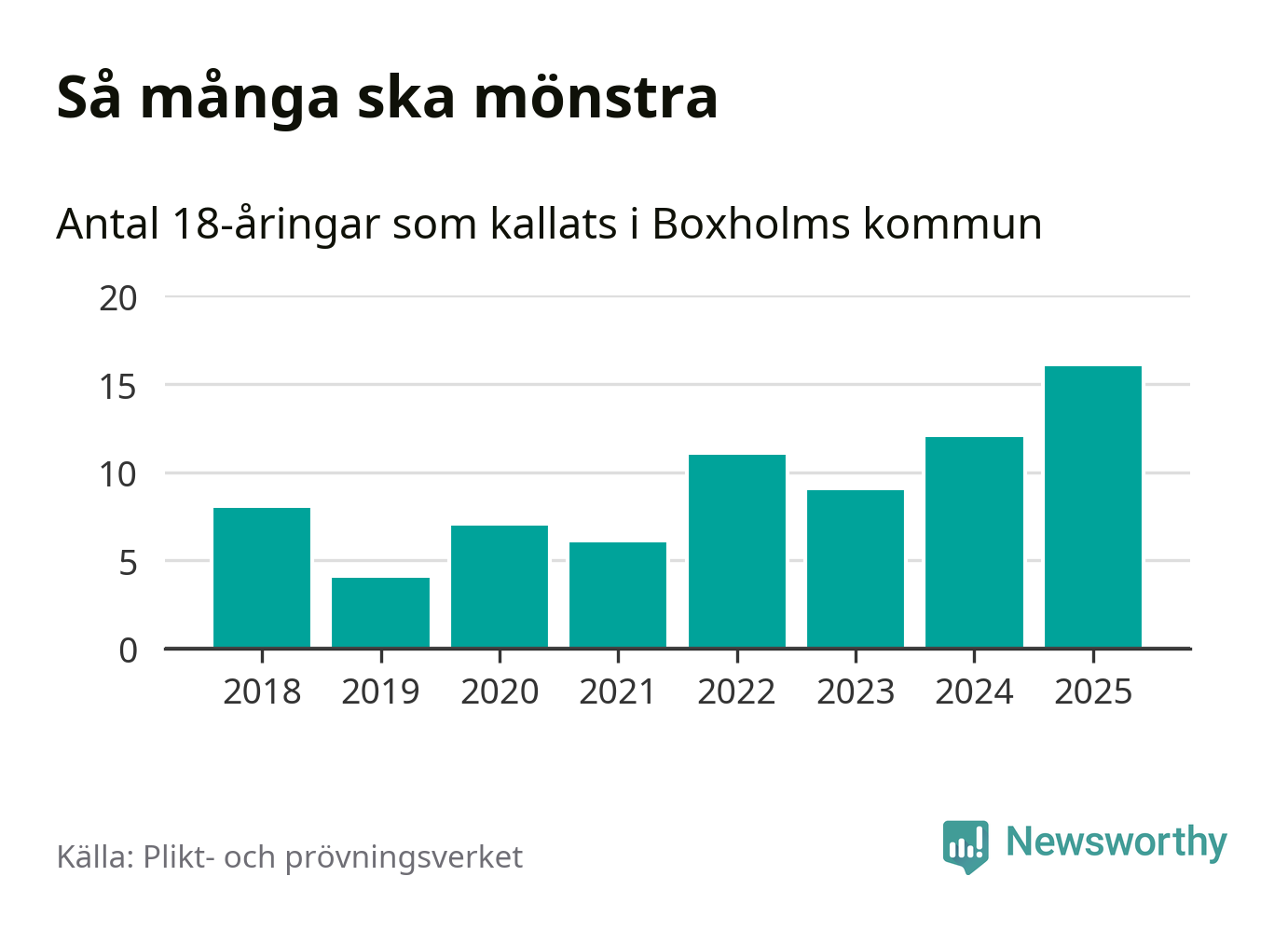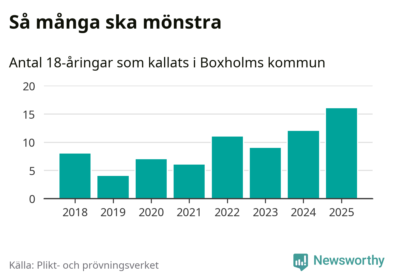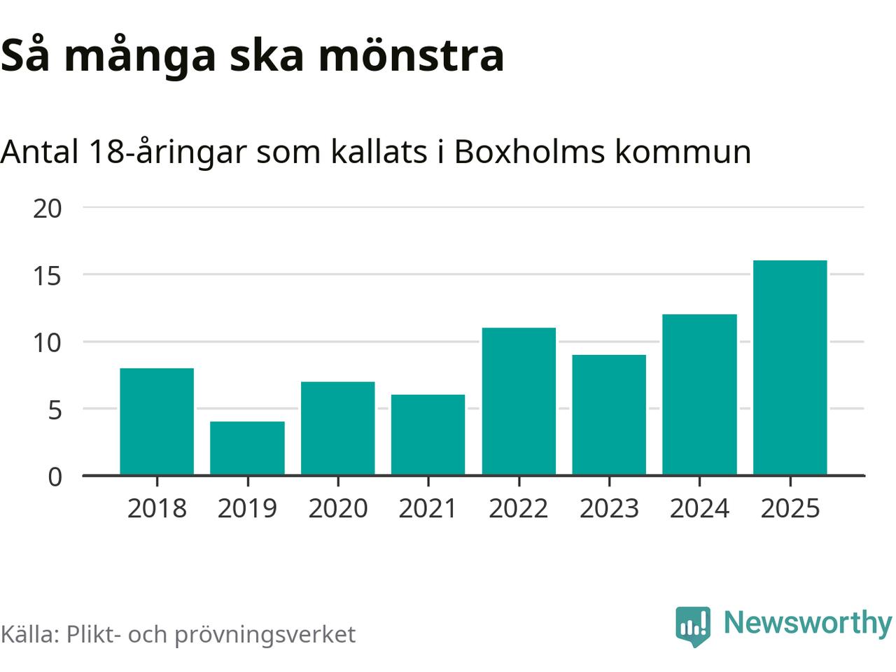 16 personer är det högsta antalet kallade i Boxholm sedan 2018, som är första året med statistik på kommunnivå (värnplikten återinfördes 2017), och fyra mönstrande fler än 2024. Totalt från Östergötlands län kallas 1 306 personer i år.